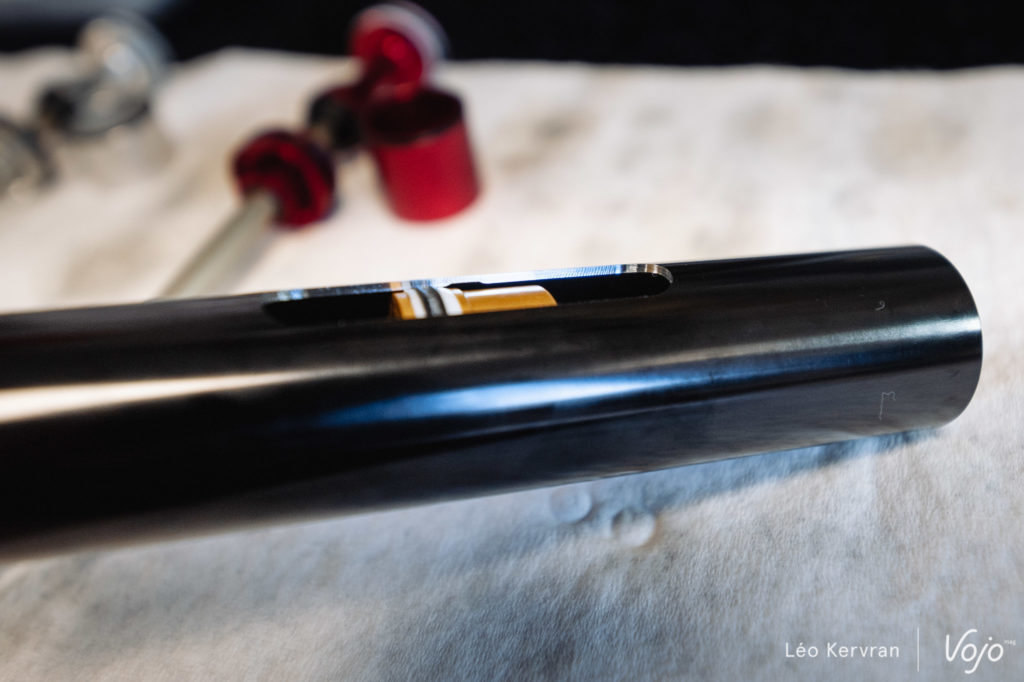 Autrement dit, plus de sensibilité en début de course, un peu plus de support en milieu de course (toujours cette histoire de rouler haut dans le débattement) et une fin de course moins progressive pour exploiter réellement tout le débattement de la fourche, au lieu de buter à 5-10 mm du repère.