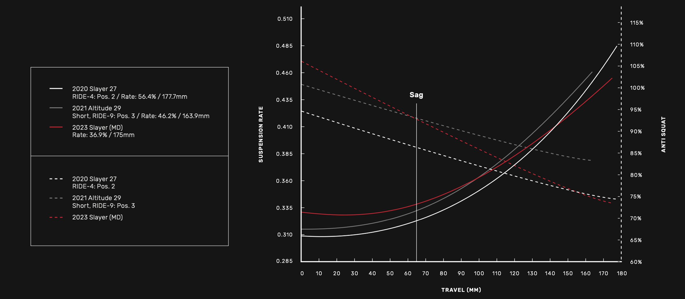 Dans cette version, le Slayer est équipé d’un amortisseur Fox DHX2 Performance ainsi que d’une fourche Fox 38 Performance Elite, en cartouche Grip, développant tous deux 180 mm de débattement. L’amortisseur est doté d’un levier permettant de basculer du mode ouvert, dans lequel un réglage de compression basse vitesse et de rebond est disponible (mais cependant non ajustables sans outil), à un mode pédalage, qui offre davantage de fermeté pour une plateforme de pédalage stable.
