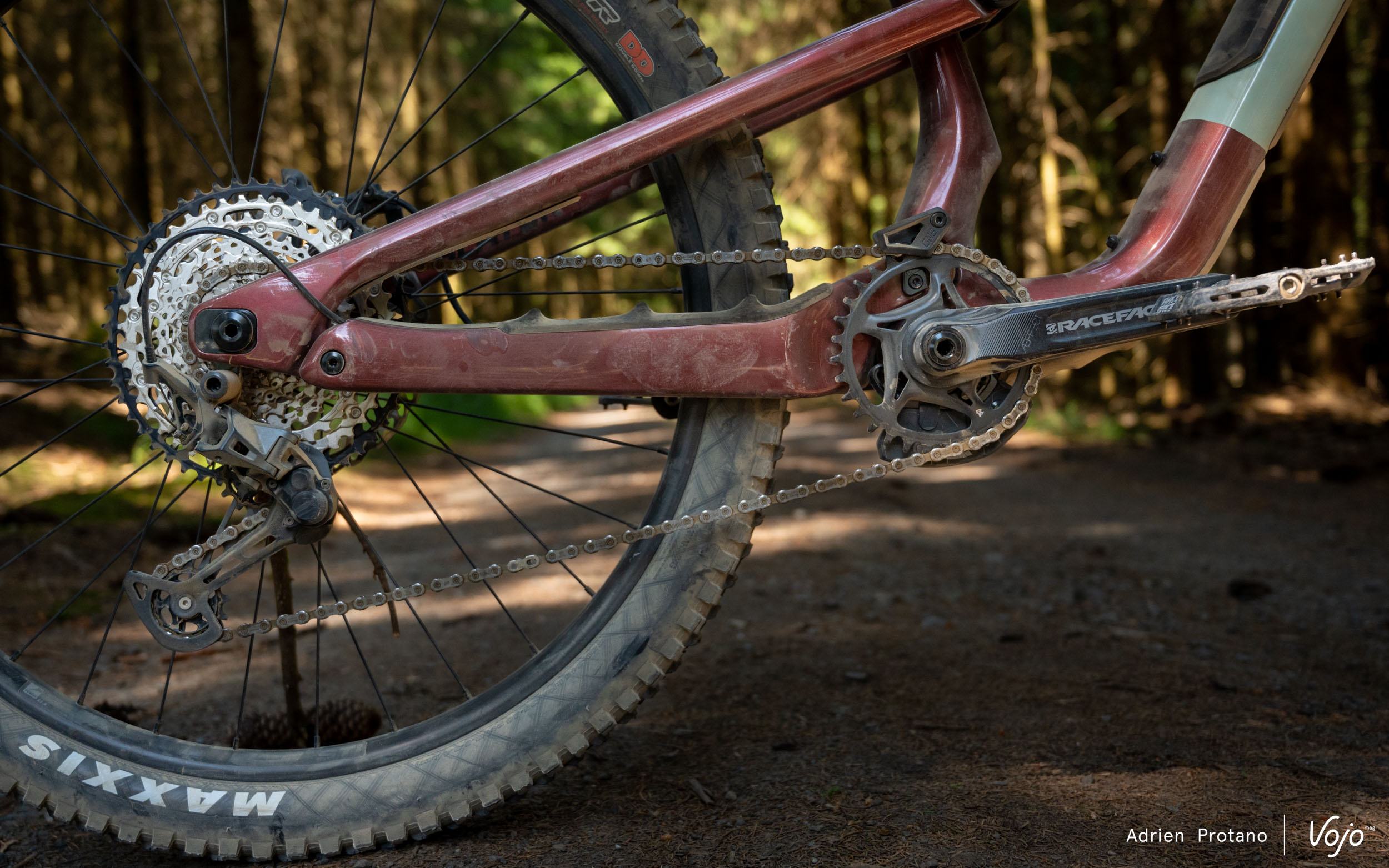 La transmission est du même acabit puisque c’est un groupe Shimano SLX qui est à la manoeuvre, avec une cassette 10-51 et un plateau de 32 dents. Le pédalier provient de chez Race Face, à savoir un Aeffect en manivelles de 170 mm de long et l’anti-déraillement de chez OneUp.
