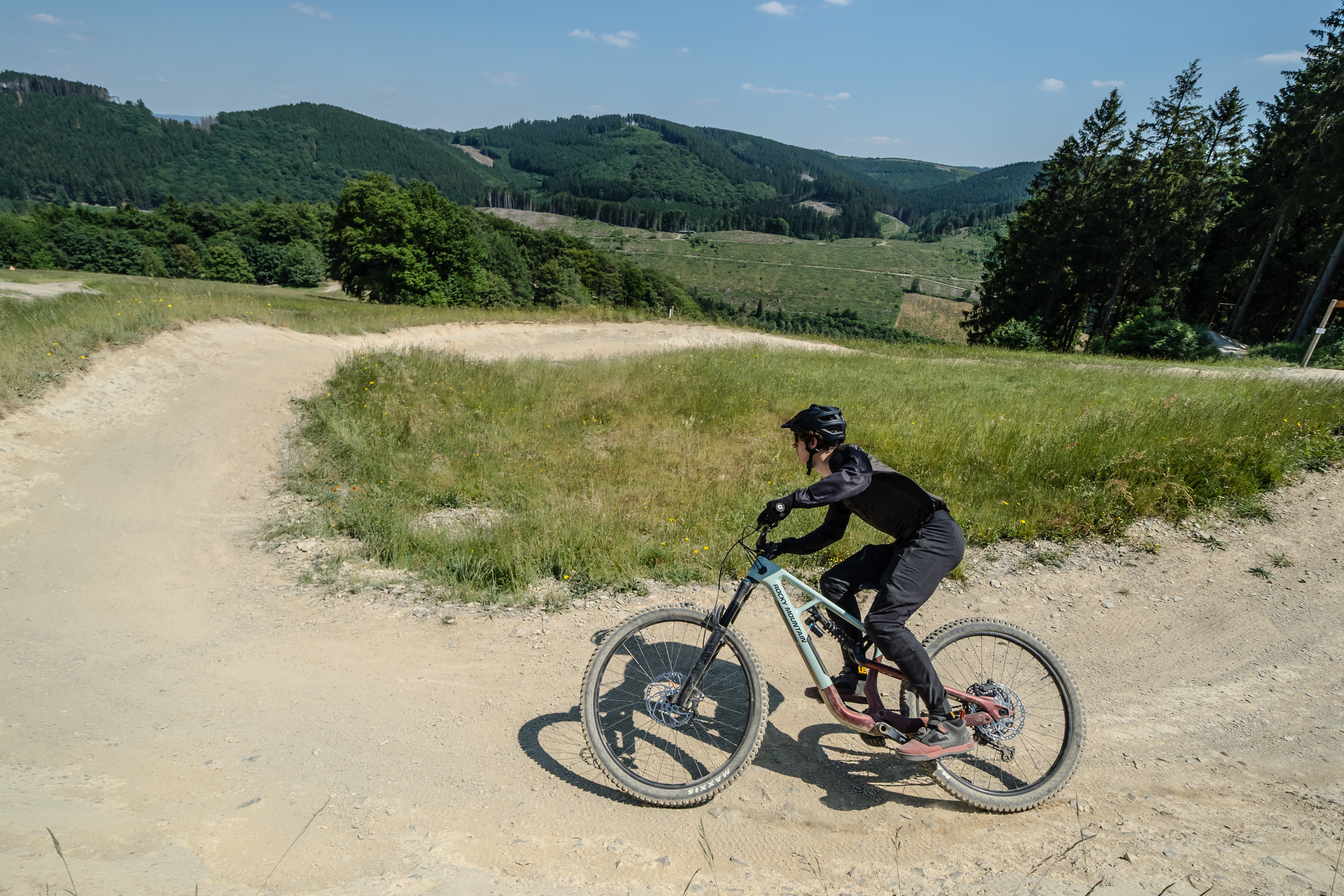 C’est au Green Hill bikepark que Rocky Mountain nous a donné rendez-vous pour notre tête à tête avec ce Slayer millésime 2024. Situé en Rhénanie-du-Nord-Westphalie, ce bikepark de l’ouest de l’Allemagne a ouvert ses portes en juillet 2022. Au programme, de jolies pistes très bien entretenues, beaucoup de virages relevés, rollers, sauts et drops de toute sorte ainsi que de jolis paysages !