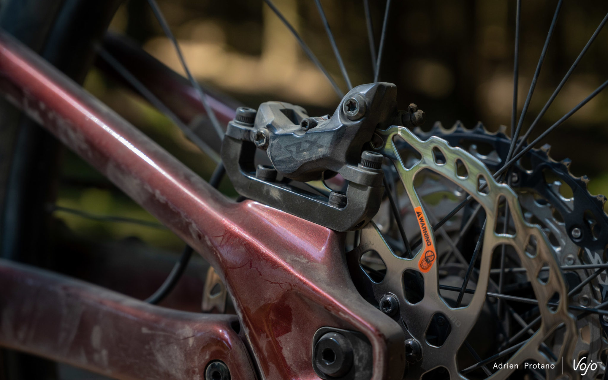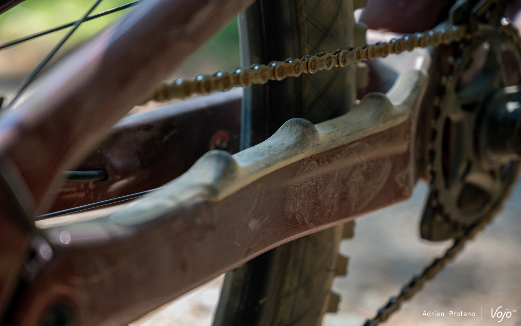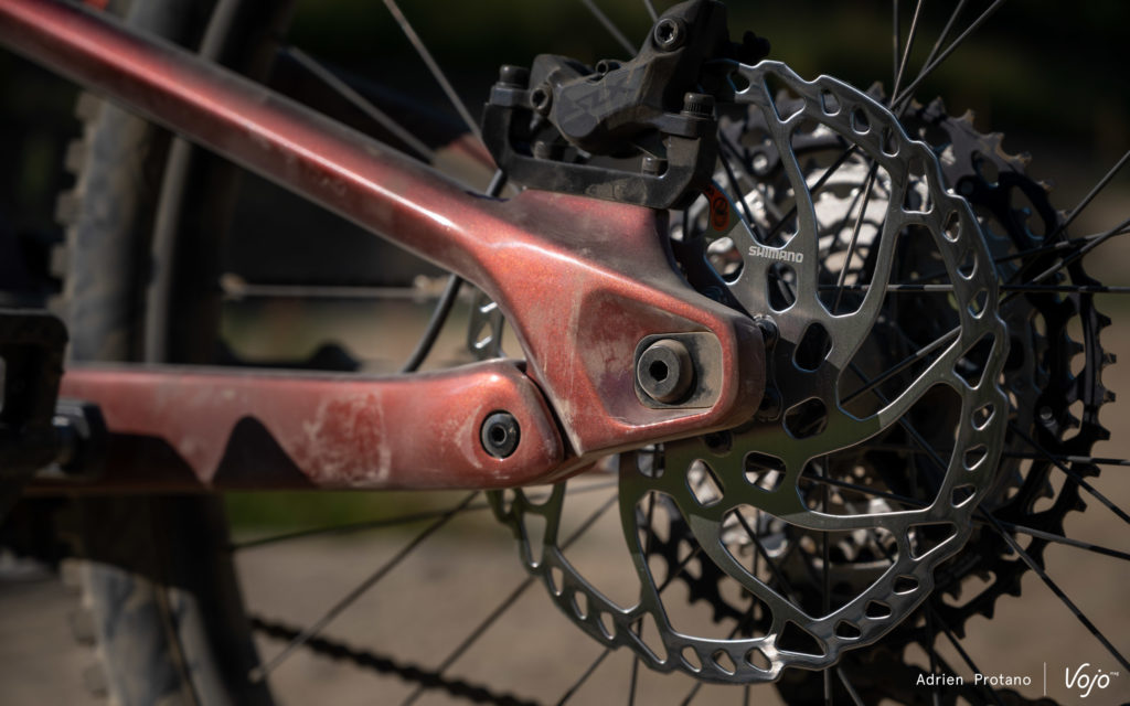 Grâce au guidage interne et à l’imposante protection sur la base arrière au niveau de la transmission, le Slayer est extrêmement silencieux, même dans les passages défoncés où l’on n’a pas entendu une seule fois la chaîne claquer contre le cadre.