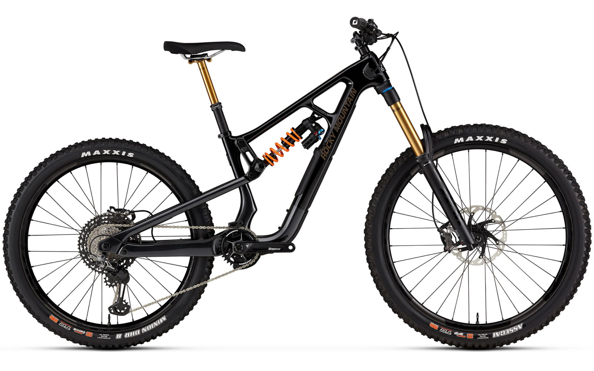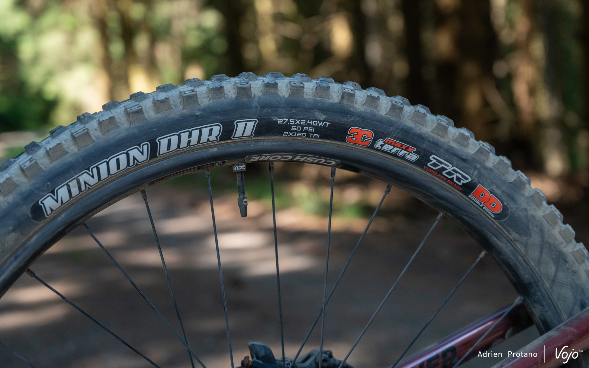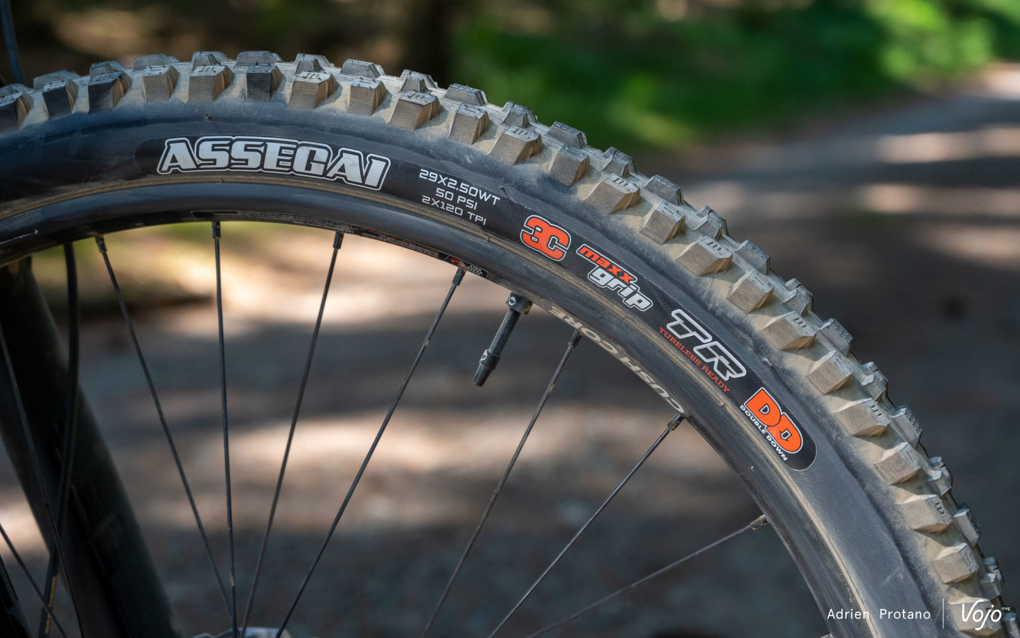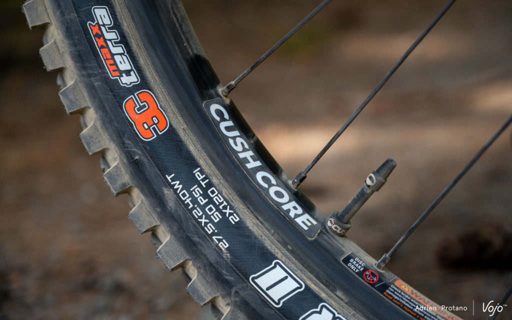 Côté train roulant, on retrouve une paire de roues composées de jantes WTB 30 SL, de moyeux DT Swiss 370 et de rayons DT Swiss Champion 2.0. Celles-ci sont chaussées de pneumatiques Maxiss, à savoir un Assegai MaxxGrip en 2.5 à l’avant et un Minion DHR II MaxxTerra en 2.4 à l’arrière. Tous deux disposent de la solide carcasse DoubleDown, et un insert Cushcore XC est installé de série. Cet insert permet de protéger les roues et d’éviter les crevaisons, ainsi que de rouler avec des pressions plus basses. Pourquoi la marque canadienne a-t-elle choisi le modèle XC dans la gamme de chez Cushcore ? Bonne question !