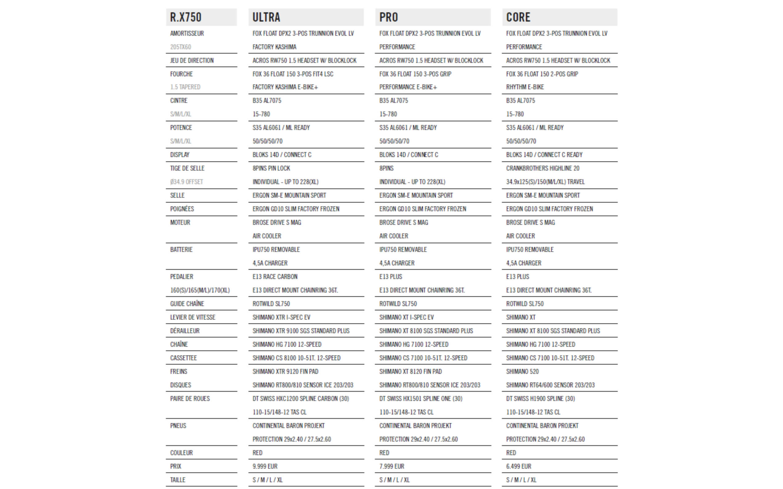 Le Rotwild R.X750 est disponible en 3 montages, de 6 499 € à 9 999 €, soit exactement en face du Specialized Turbo Levo, son concurrent direct sur le papier. Il existe par ailleurs en 4 tailles et le débattement de la tige de selle est adapté à la taille du vélo, de 168 mm en taille S à 228 mm en taille XL.