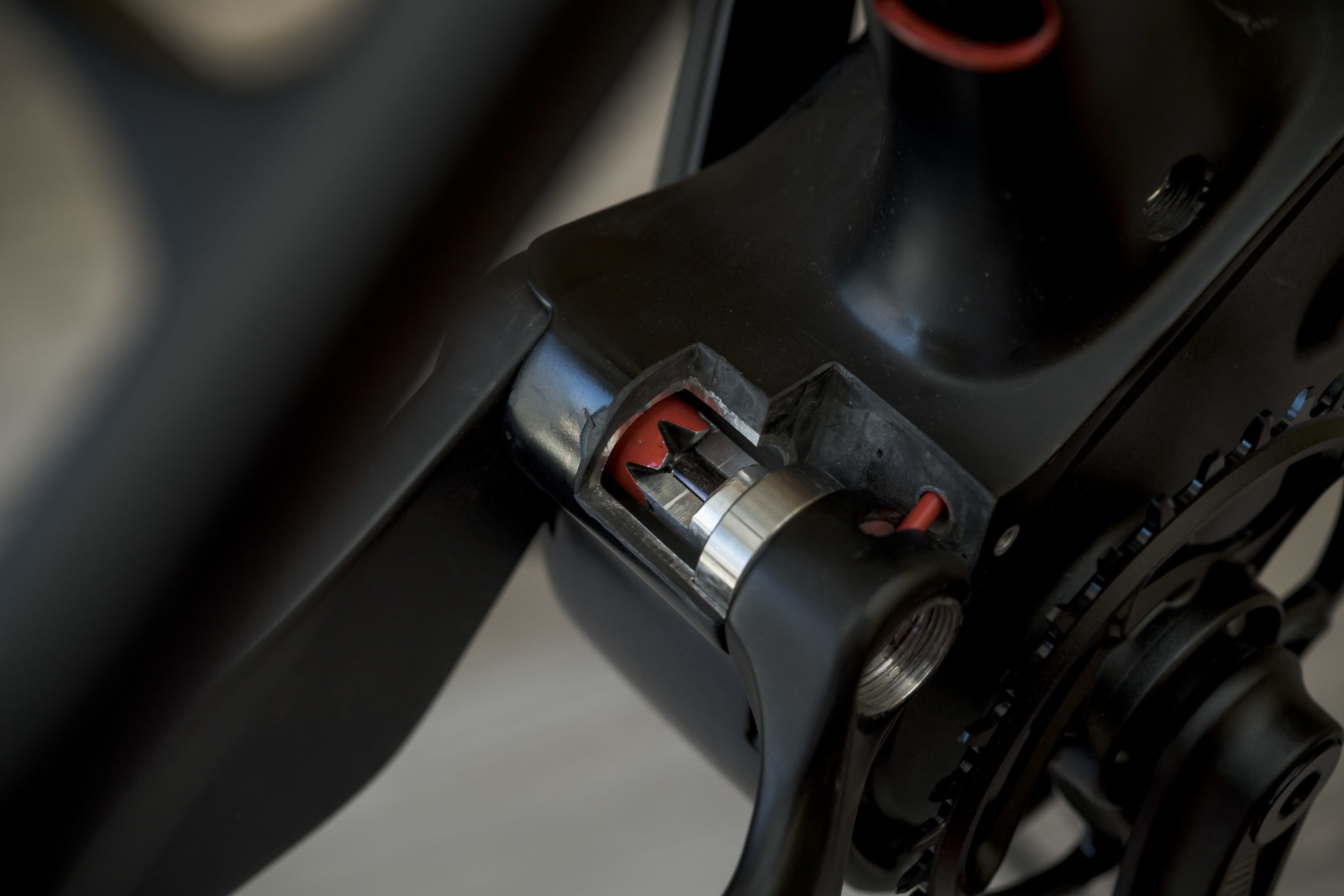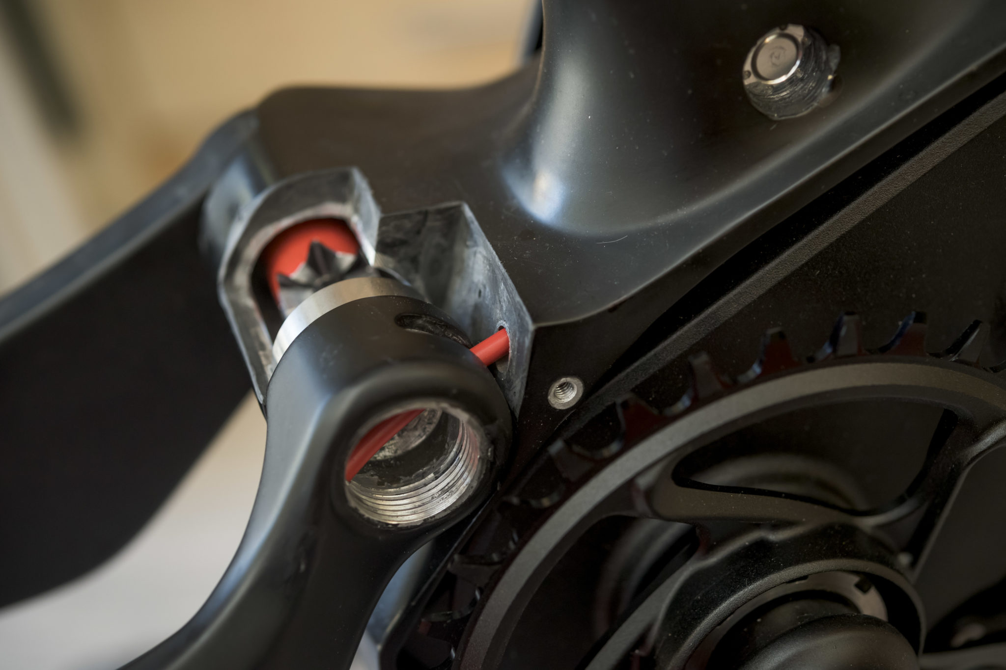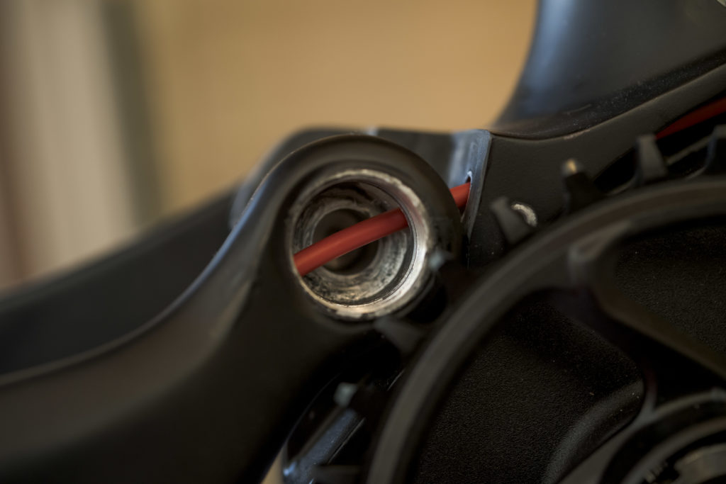 Le système de liaison des bases au cadre (sans pont de rigidification et avec des roulements recentrés) permet de faire passer la gaine du dérailleur directement dans le triangle au niveau du point de pivot, derrière une vis qui fait uniquement office de cache. Cela permet d’avoir un trajet de gaine très direct, sans coude et sans allongement excessif lors de la compression de la suspension.