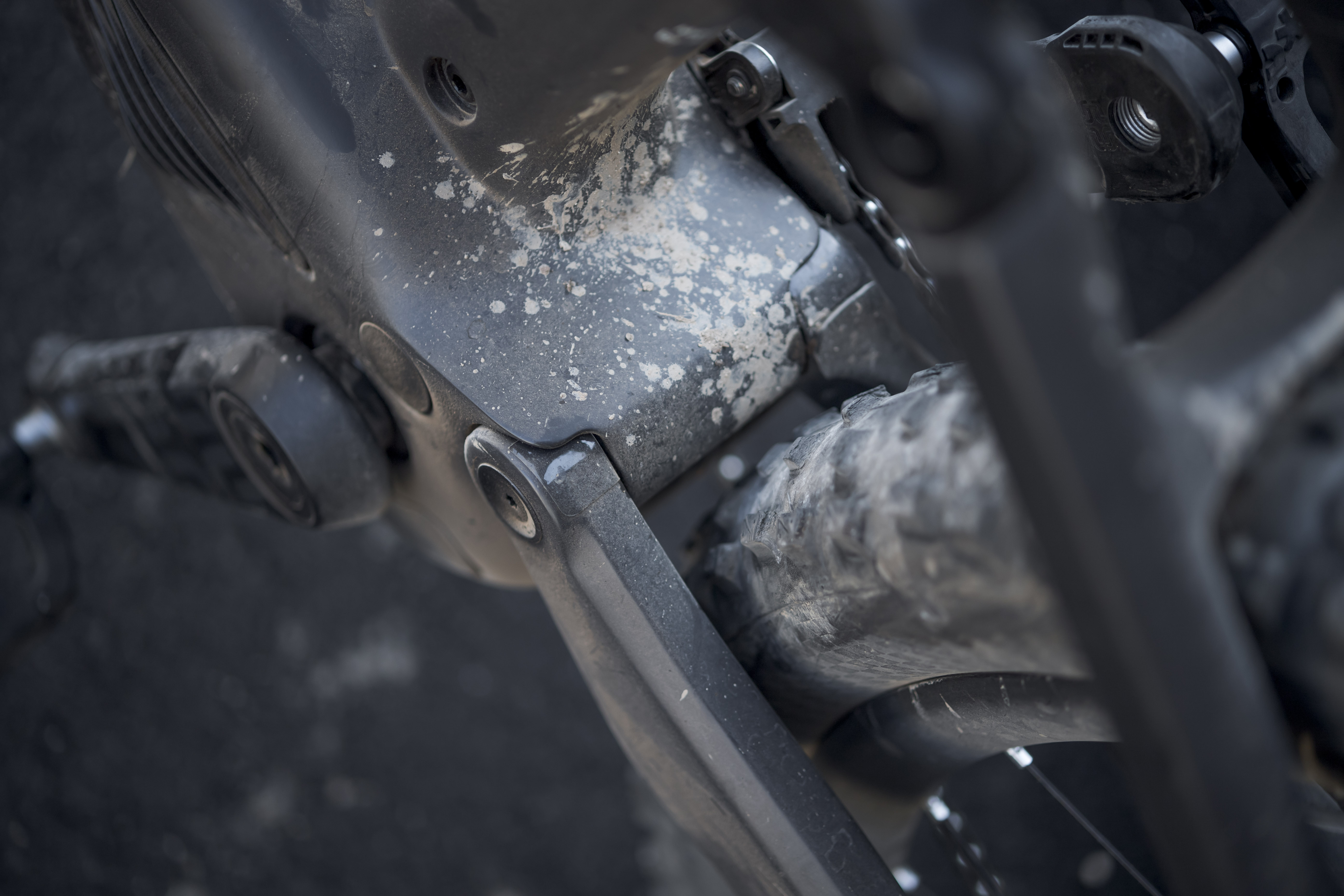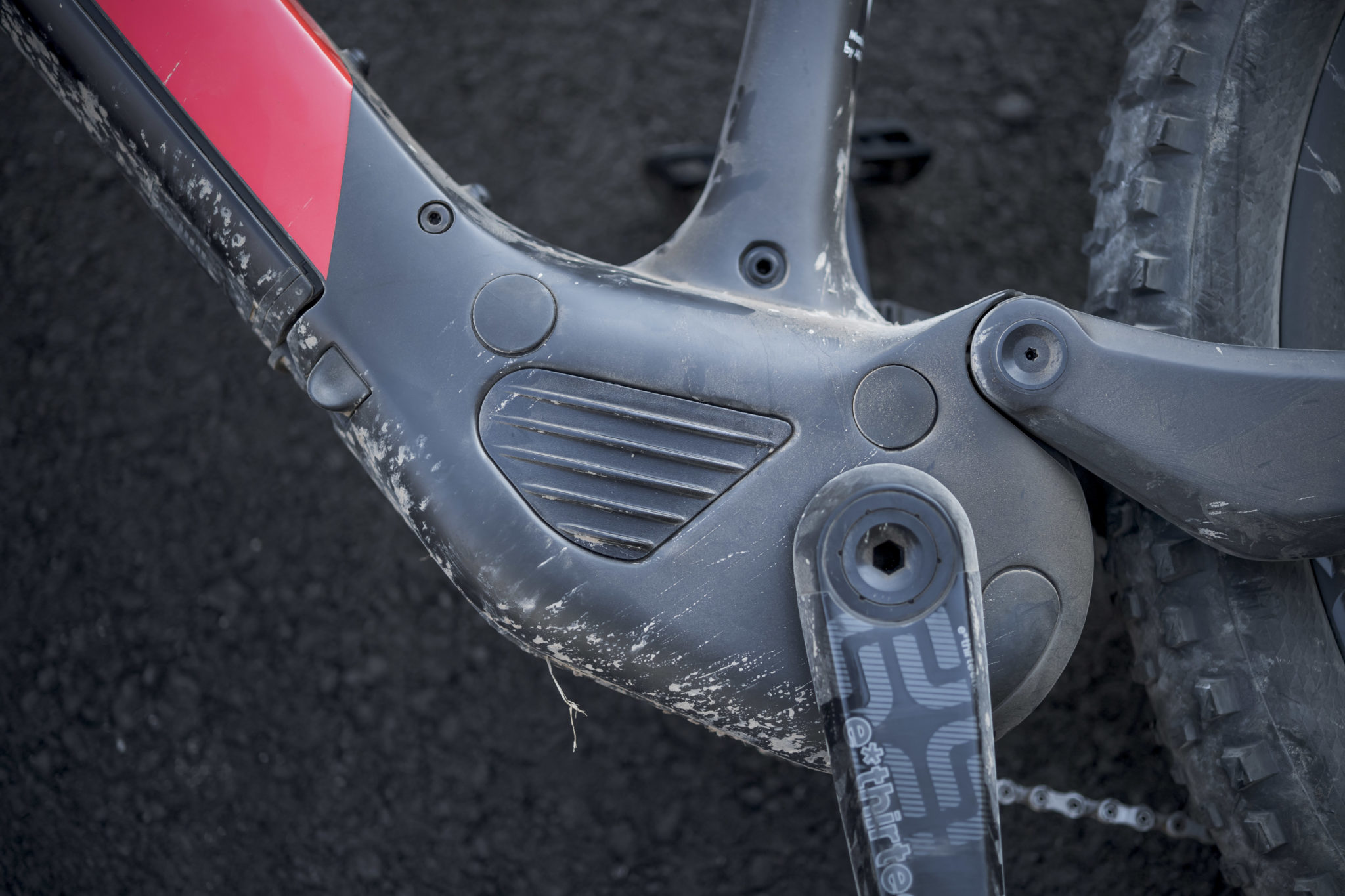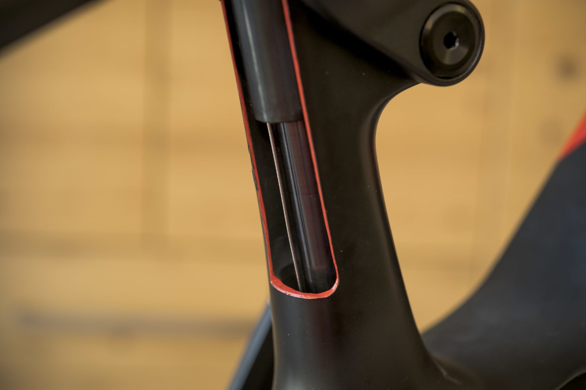 Le système de liaison des bases au cadre (sans pont de rigidification et avec des roulements recentrés) permet de faire passer la gaine du dérailleur directement dans le triangle au niveau du point de pivot, derrière une vis qui fait uniquement office de cache. Cela permet d’avoir un trajet de gaine très direct, sans coude et sans allongement excessif lors de la compression de la suspension.