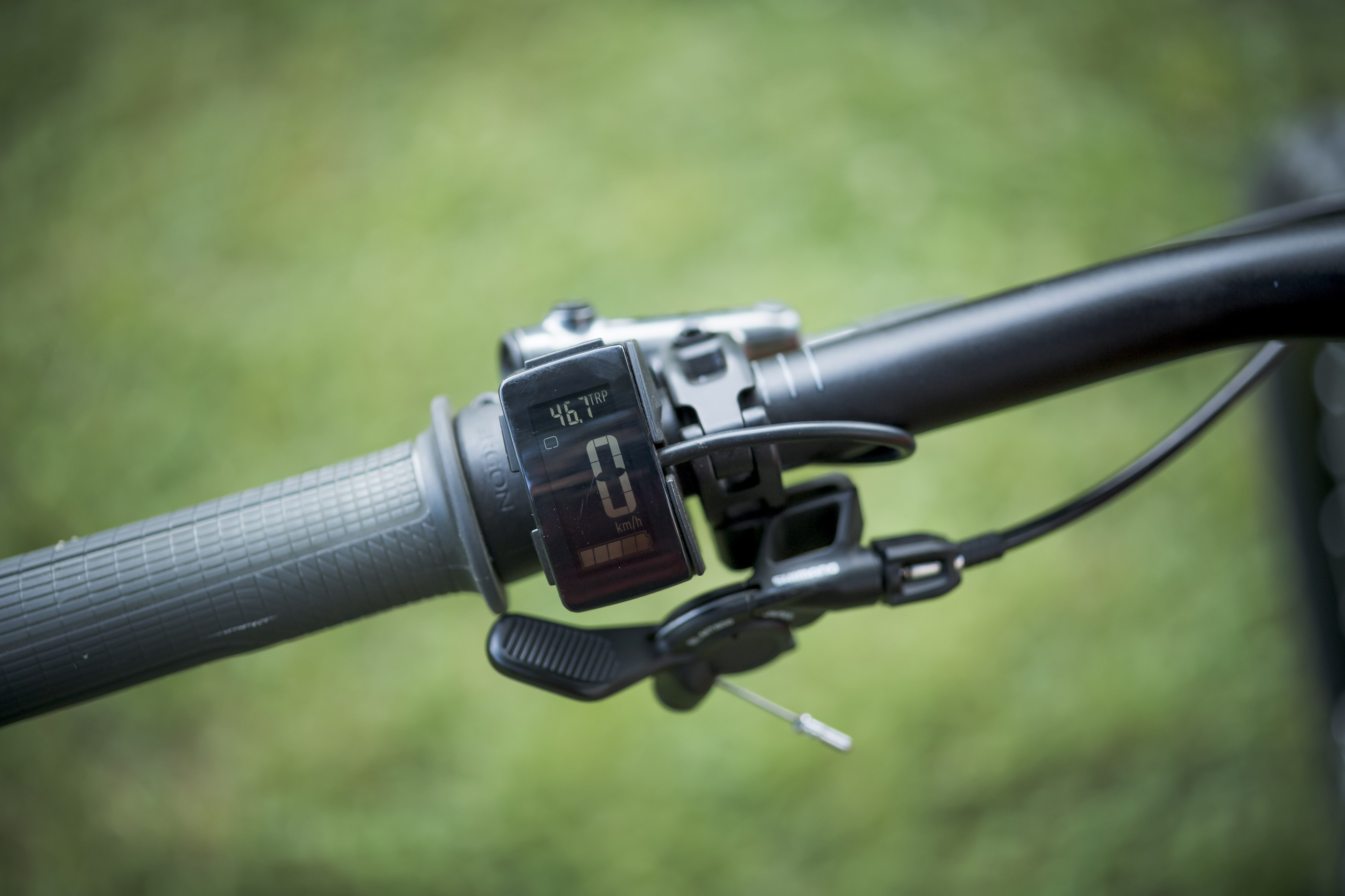 L’écran est placé à gauche du cintre, contre la poignée et il fait également office de bouton de contrôle pour choisir le mode d’assistance. On appuie en haut de l’écran pour augmenter le niveau d’assistance et en bas pour le diminuer. L’ergonomie est bonne et on sent bien un « clic » sous le doigt lorsqu’on change de mode, un peu à l’image d’un pavé tactile d’ordinateur portable. L’avantage de ce système est d’avoir un afficheur très compact et peu exposé aux chocs mais on perd un peu en lisibilité, surtout en plein soleil.
