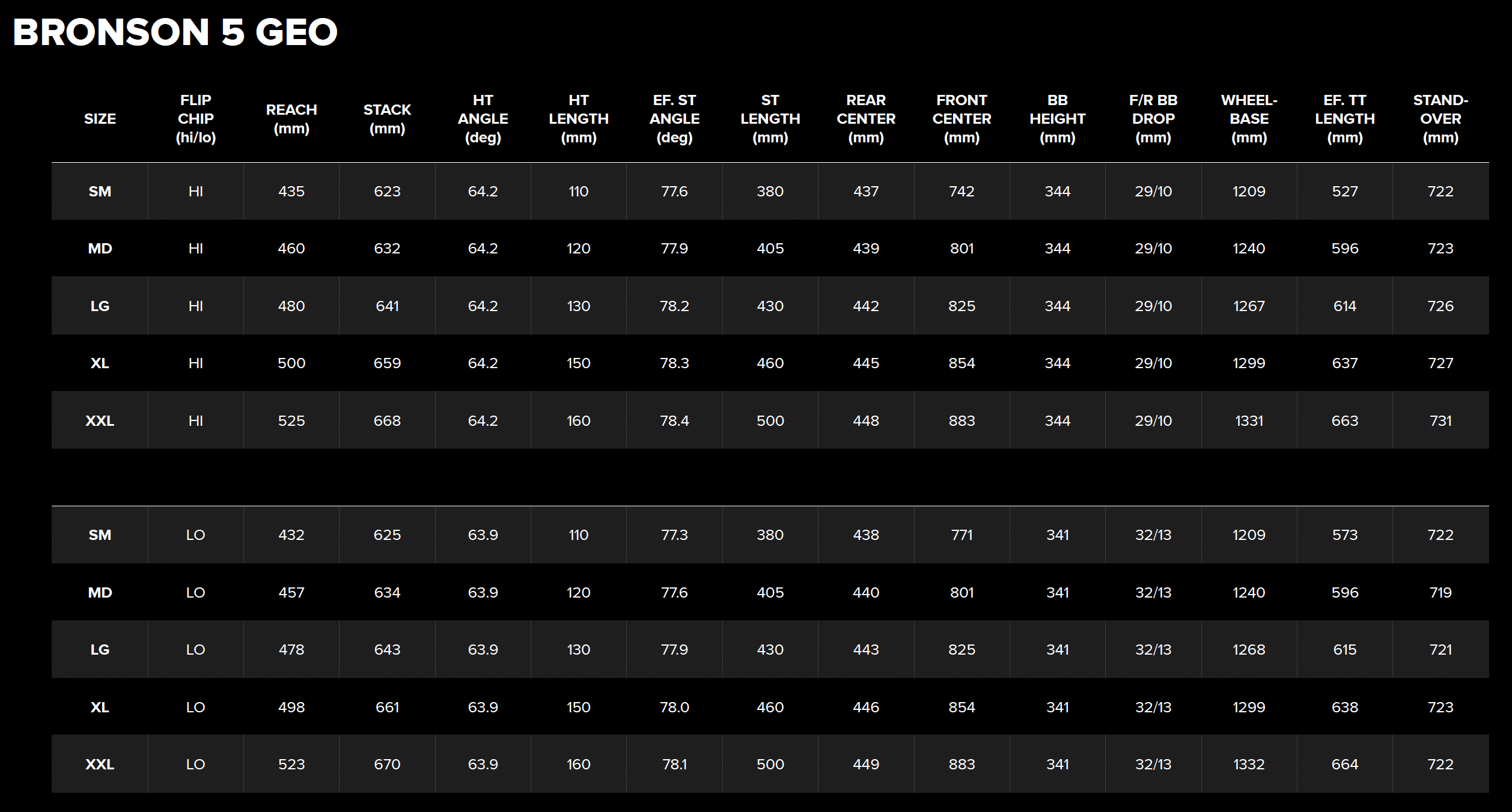On relève au passage que si le Bronson se décline toujours en 5 tailles, le XS (en 27,5″ uniquement) disparaît au profit d’un nouveau XXL. Pour autant, l’échelle des tailles n’a pas été réorganisée et c’est même le contraire, puisque les vélos s’allongent légèrement. Le S du nouveau Bronson ne remplace donc pas l’ancien XS. Tant pis pour les pilotes les plus petits, tant mieux pour les plus grands qui trouveront dans le XXL quelque chose d’adapté à leur stature.