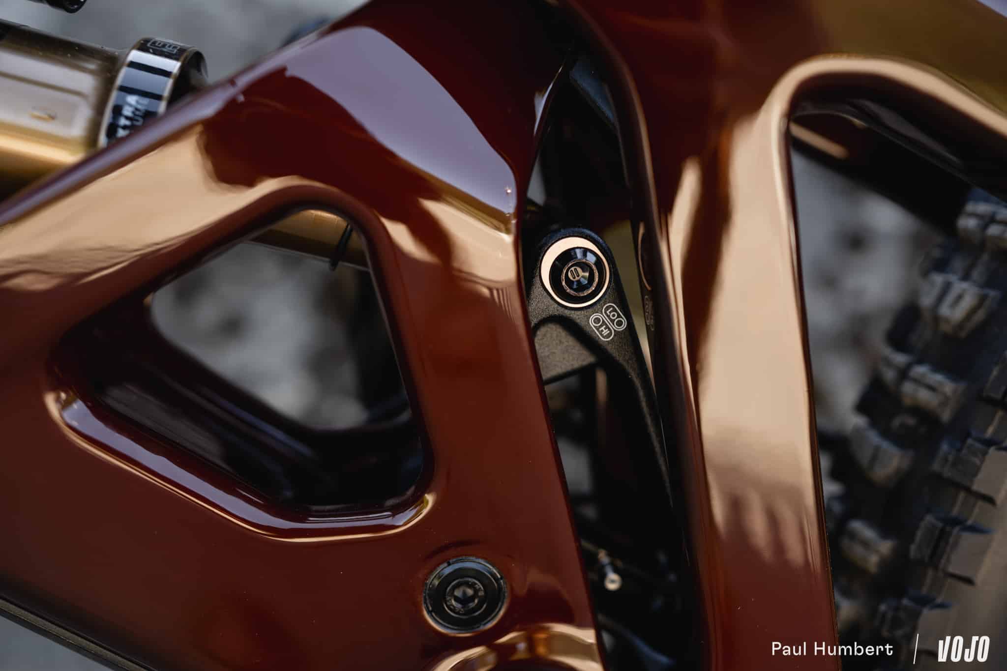 Au-delà de l’apparence plus légère et aérienne, cette évolution a surtout un intérêt technique : sans toucher à la longueur d’insertion de la tige de selle, elle permet de donner un peu plus de place à l’amortisseur et, par le truchement d’un léger déplacement des biellettes (aussi bien le basculeur inférieur illustré ci-dessus que la biellette supérieure), de faire évoluer le comportement de la suspension du Bronson.