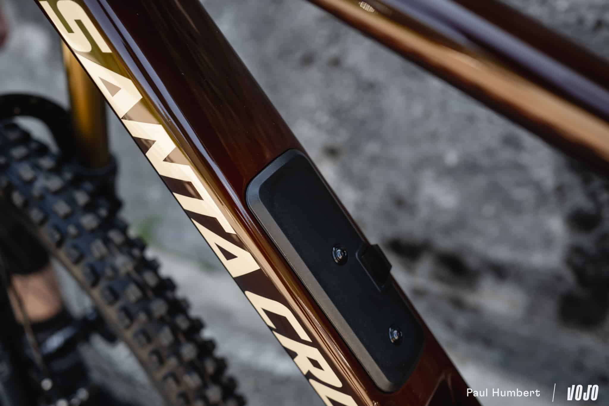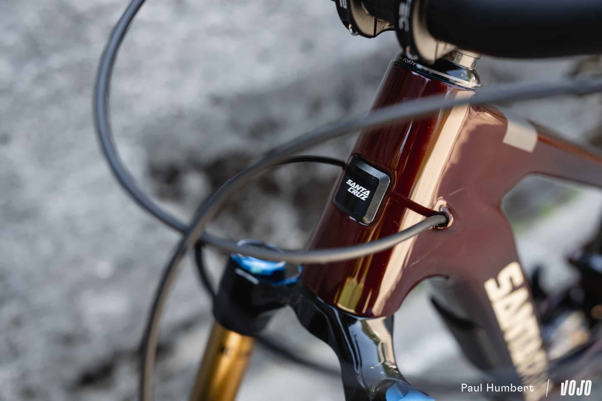 Sur les cadres en carbone C en revanche, on a bien le passage et comme sur tout Santa Cruz, les câbles et Durits sont entièrement guidés dans le cadre, ils cheminent dans de petits tubes depuis leur point d’entrée jusqu’à leur sortie, ce qui est bien pratique.