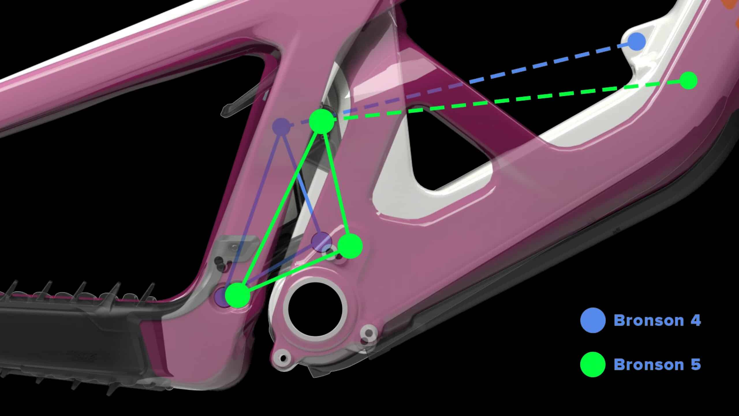 Pour qui est familier du design Santa Cruz, la nouveauté saute aux yeux : le cadre du Bronson, et plus précisément le bas du triangle avant, a été complètement retravaillé pour cette 5e génération. Alors que tube de selle prenait auparavant appui sur un tunnel (pour l’amortisseur) assez simple, il « flotte » désormais au-dessus de deux pieds, qui forment un triangle avec le tube diagonal.