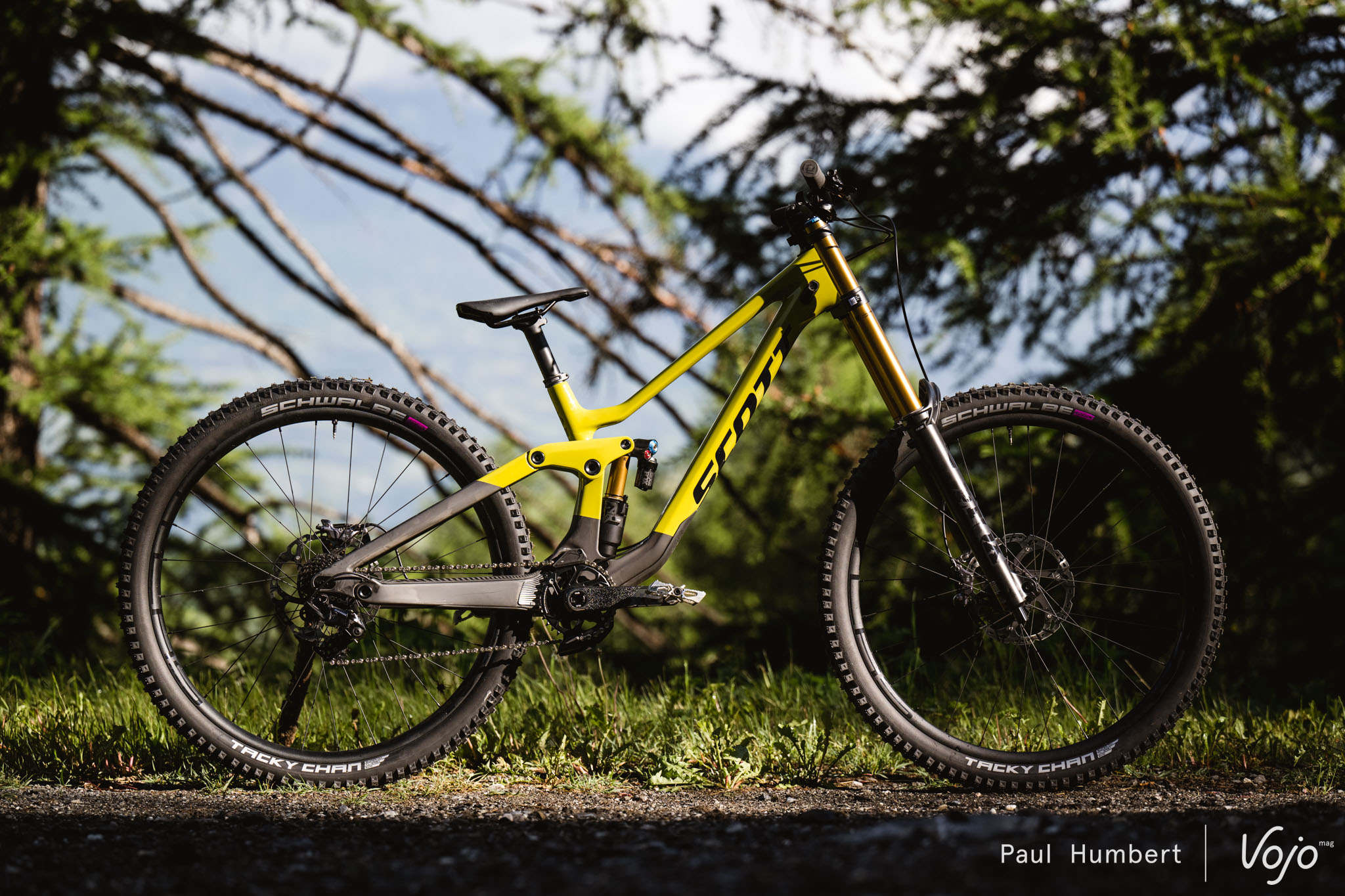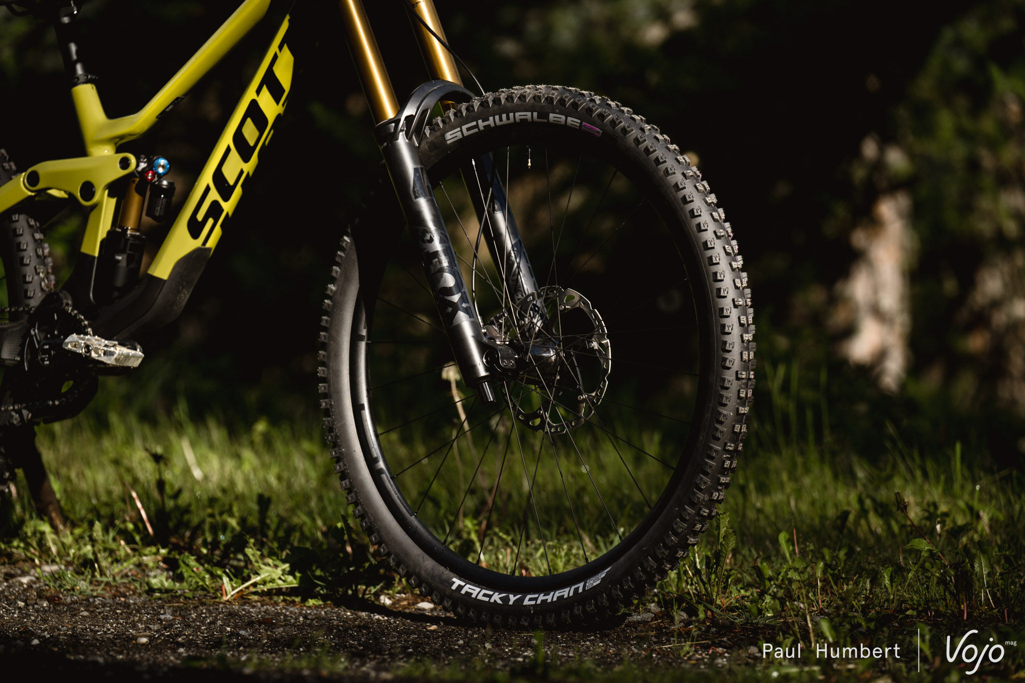 Pour cette prise en main, nous avons reçu deux Tacky Chan Super DH 2,4″ qui ont vite trouvé leur place sur un Scott Gambler, le modèle de DH de la marque suisse. Le montage se passe sans difficulté et les pneus tiennent immédiatement la pression, comme souvent avec les carcasses DH ,mais une fois en place, première surprise : les Tacky Chan taillent petit, très petit.