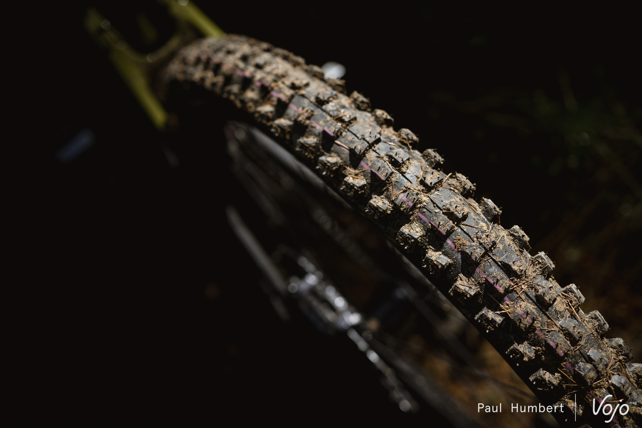 On ne serait pas surpris que cela vienne en partie de la faible largeur de ces Tacky Chan, ou de nos modèles d’essai au moins. Une carcasse DH c’est déjà exigeant et celle de Schwalbe plus que d’autres, alors combinée à une largeur de 2,2″, bon courage pour la faire travailler à basse vitesse.
