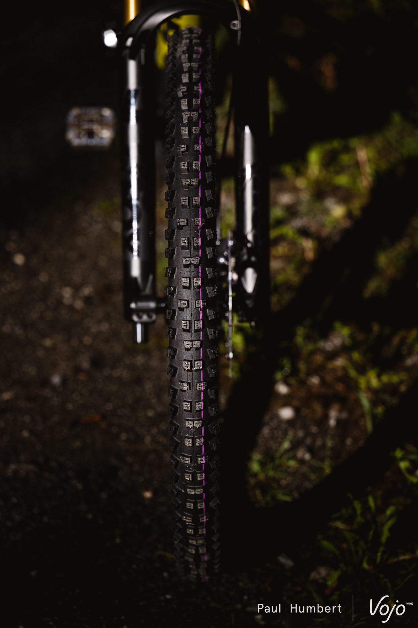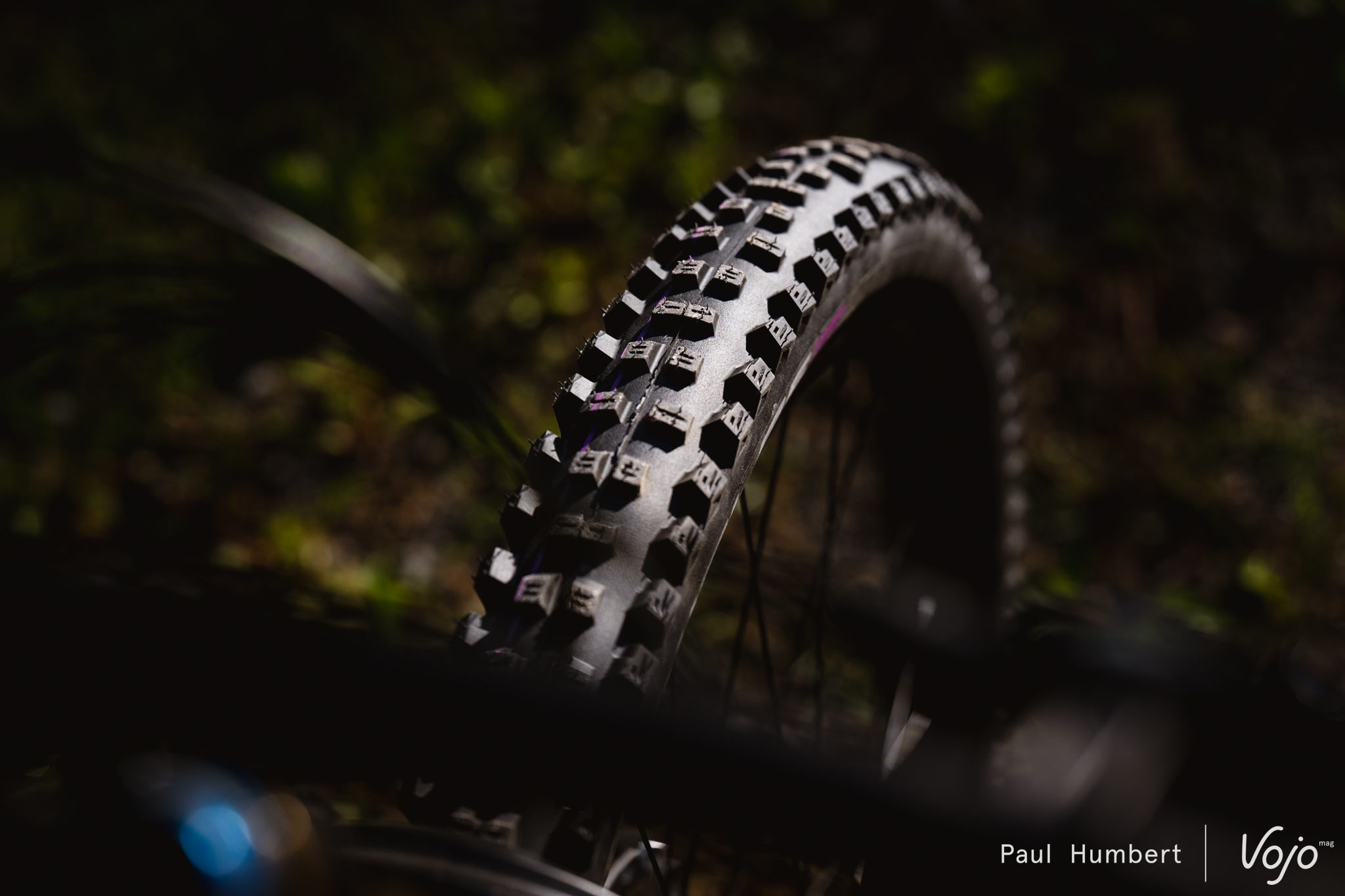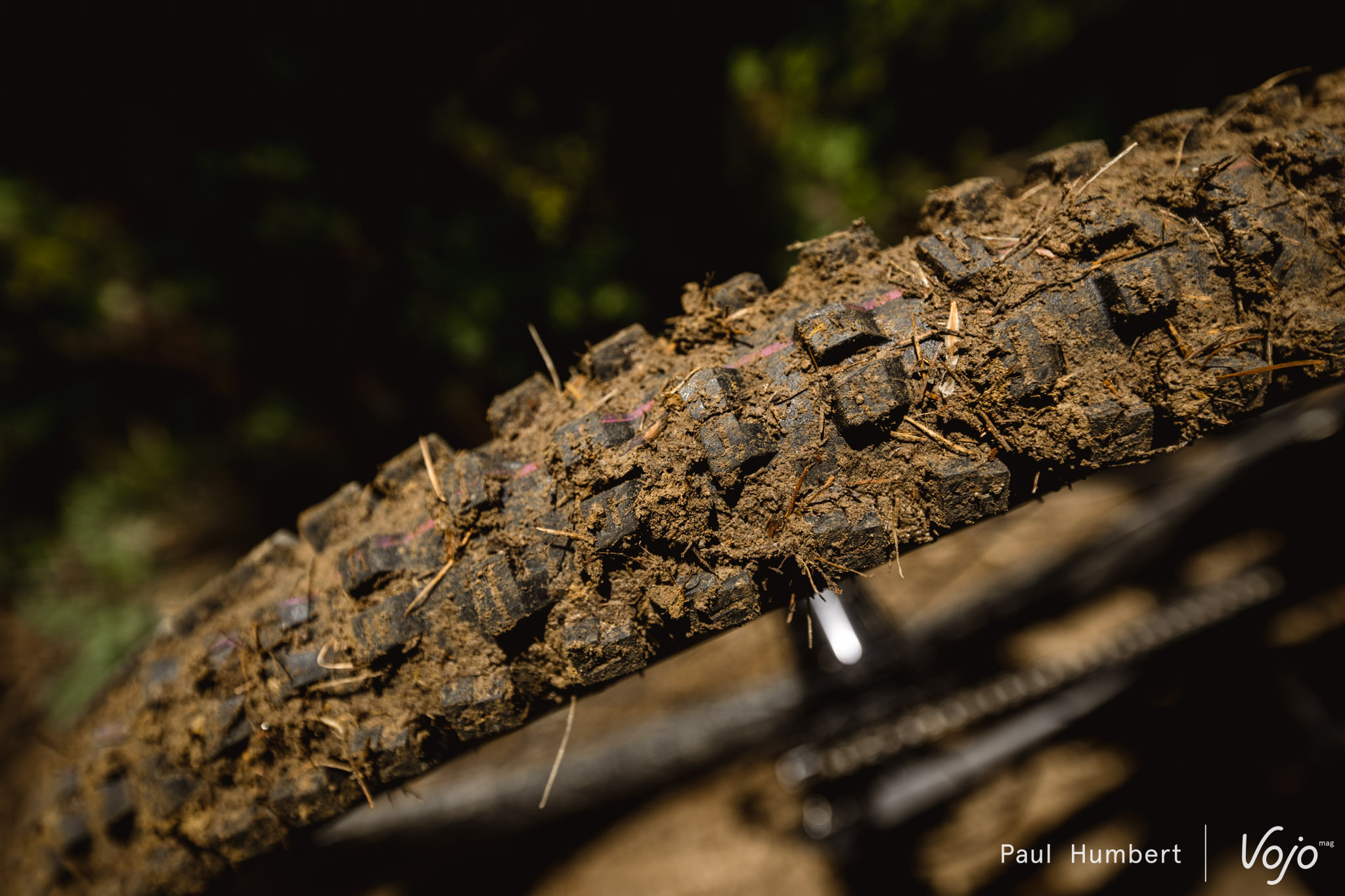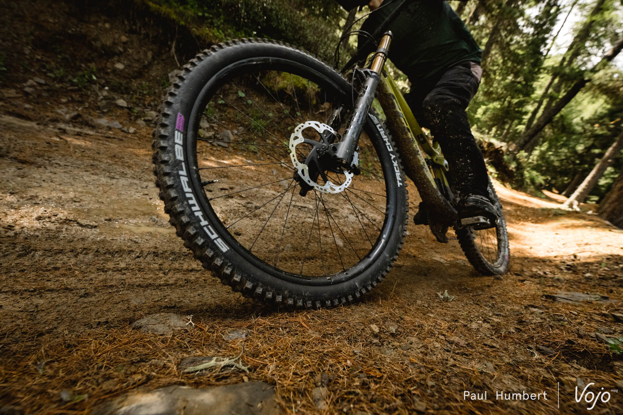 Tant qu’on parle de comportement sur sol dur, on a aussi remarqué que Tacky Chan paraît plus précis que le Magic Mary comme annoncé par Schwalbe. C’est surtout sensible dans les gros appuis, type freinage ou virage relevé rapide, où le pneu n’a pas ce petit flou caractéristique du Magic Mary. En revanche, on a pu voir aux Orres qu’on touche assez vite à ses limites sur le mouillé là où le Magic Mary brille réellement. Les crampons latéraux tiennent bien une fois qu’on met de l’angle mais la bande centrale à plus de mal à tenir les lignes ou à trouver de l’adhérence pour ne pas bloquer les roues.
