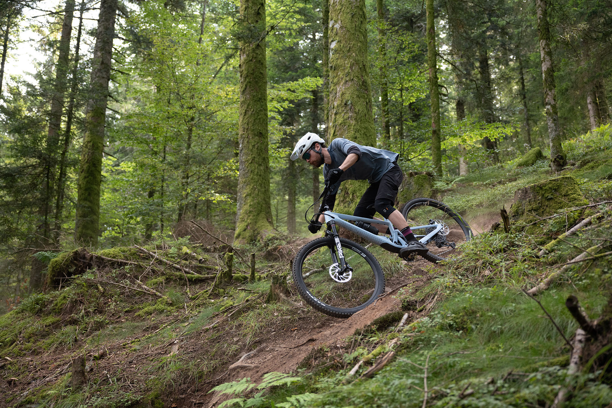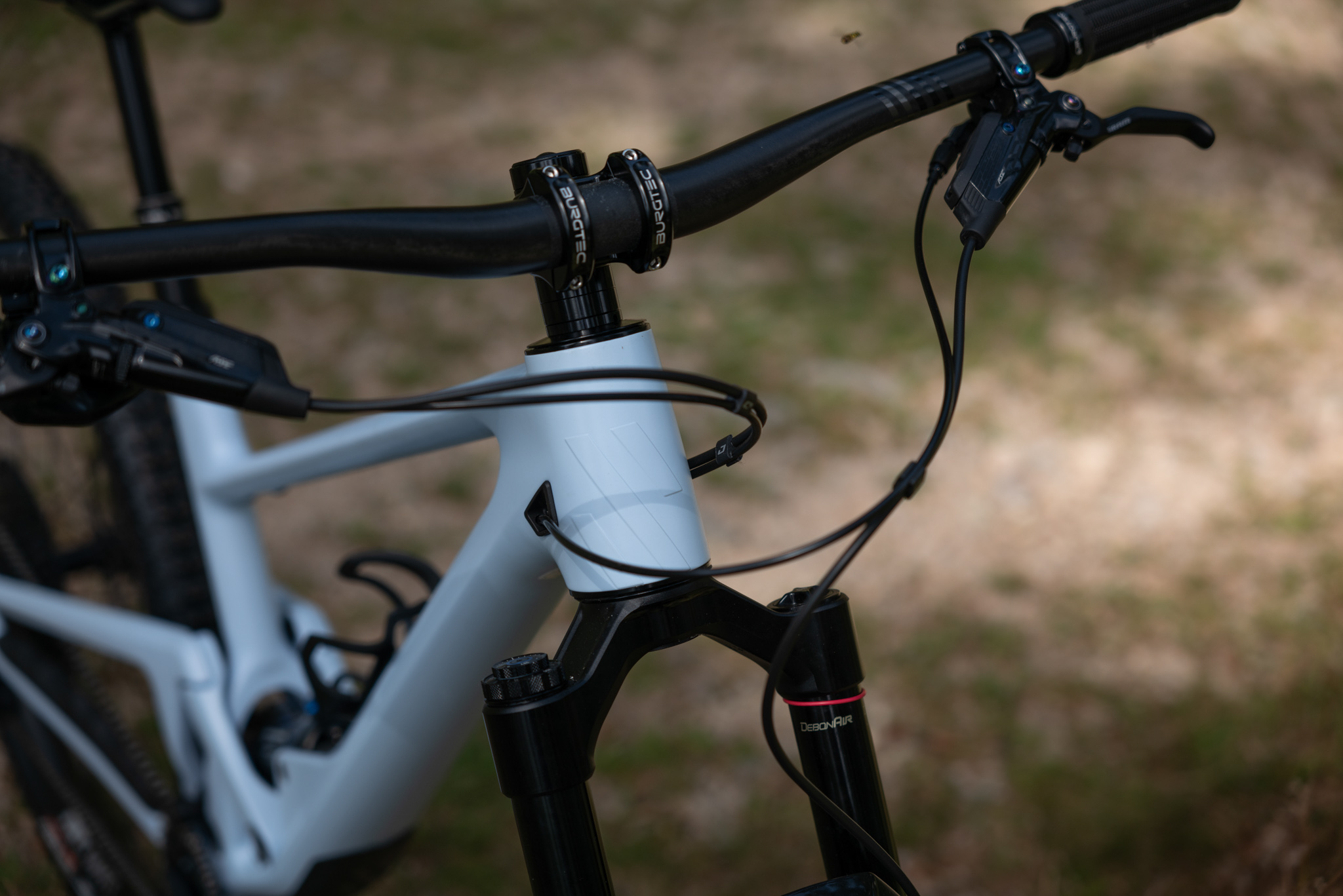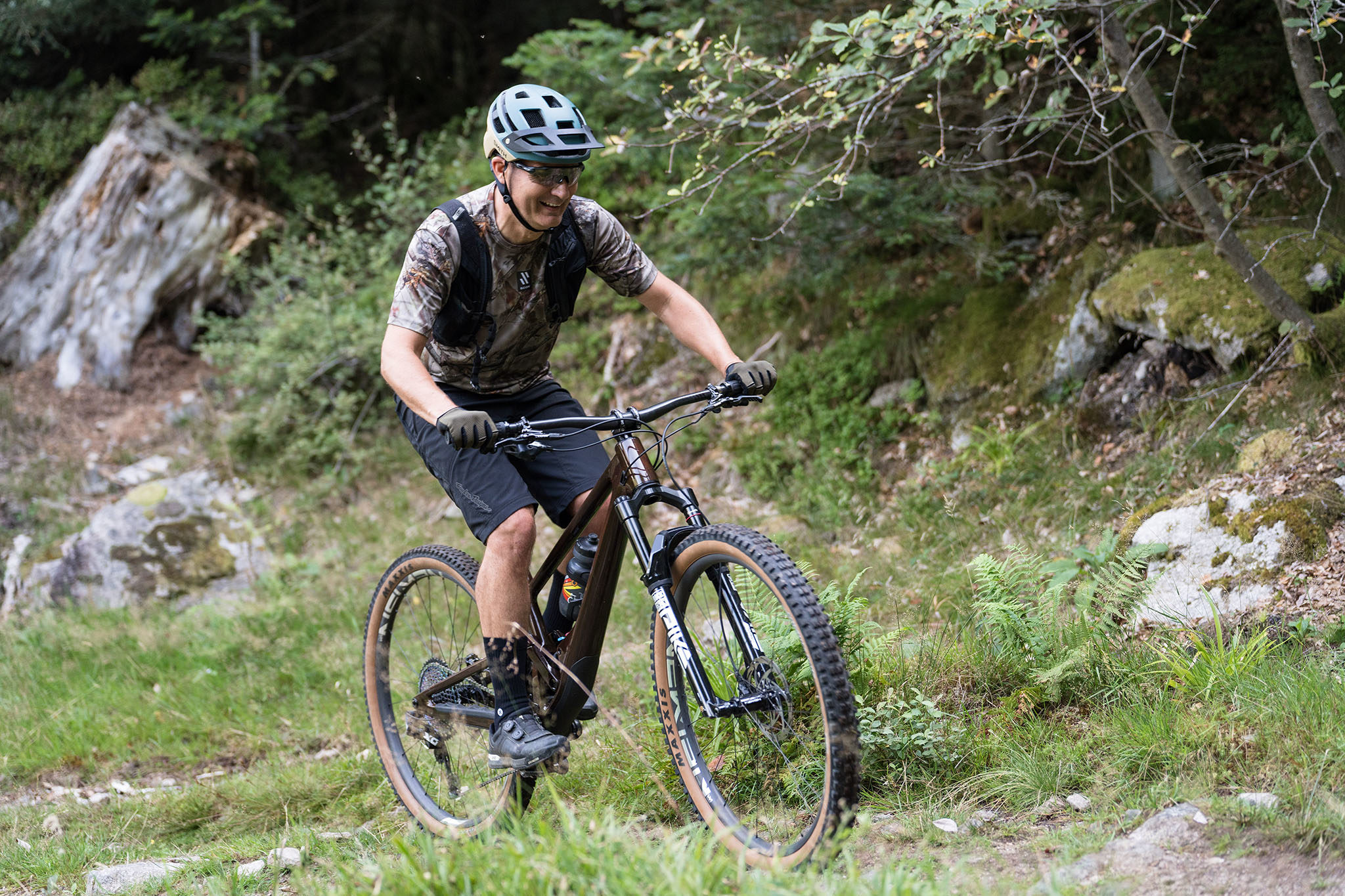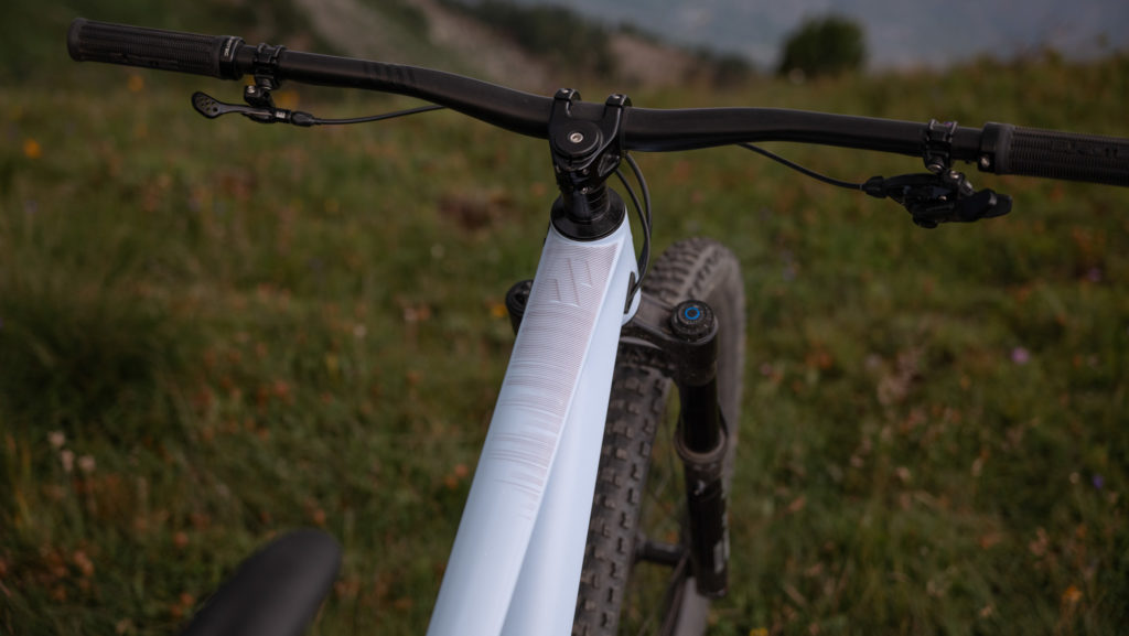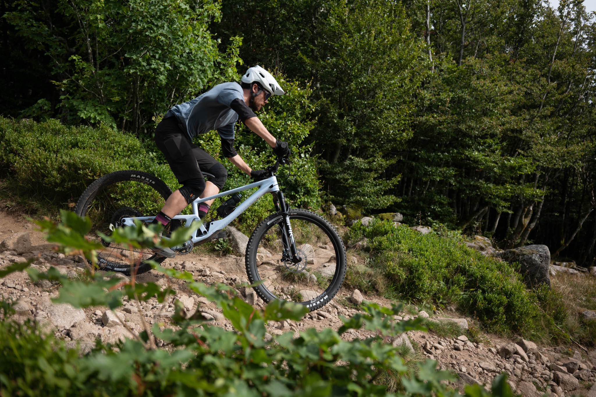 Et le meilleur, c’est que tout cela ne se fait pas au détriment du comportement en descente. Avec les 64,5° d’angle de direction on se sent comme sur un all-mountain ou petit enduro et on peut rouler exactement de la même façon, sans se préoccuper une seule seconde du petit débattement à l’arrière.