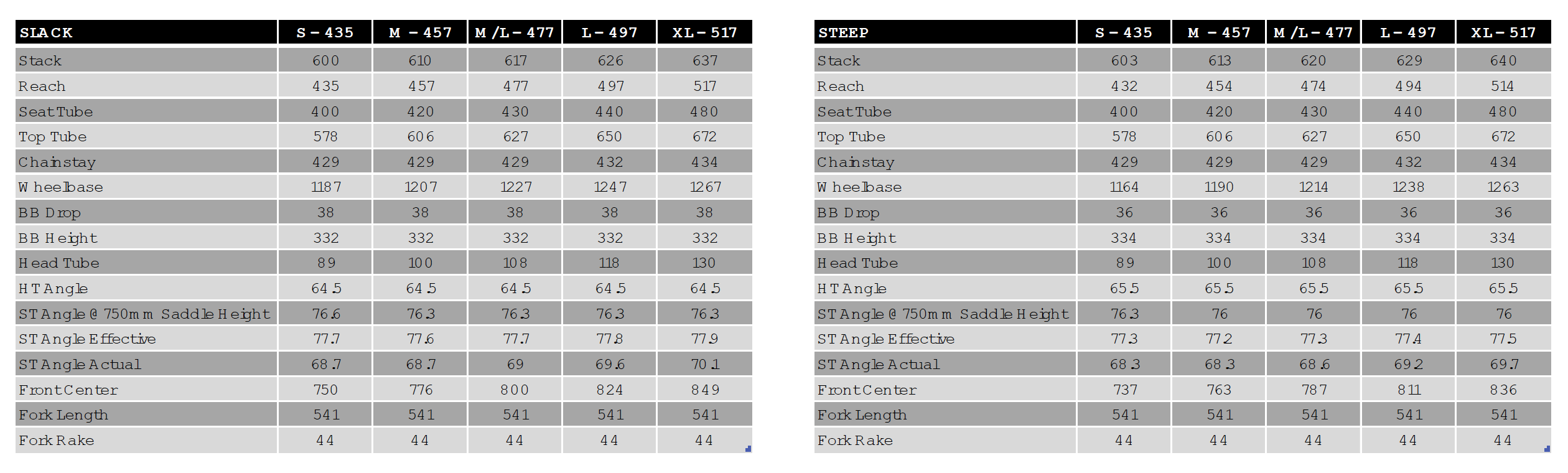 Côté géométrie, cela donne les tableaux ci-dessus. Parmi les cotes les plus importantes, on retient un reach de 457 mm en taille « 457 » (équivalent M, mais on rappelle que Scor invite à choisir en fonction du reach et des dimensions plus que de la référence de la taille), un angle de direction à 64,5°, des bases courtes (429 à 434 mm suivant la taille) et un angle de tube de selle bien droit, entre 77,6 et 77,9°. Comme d’habitude chez Scor, le stack est faible (610 mm en taille 457) mais c’est assumé : pour la marque, il est plus facile de remonter un avant trop bas que de descendre un avant trop haut.
