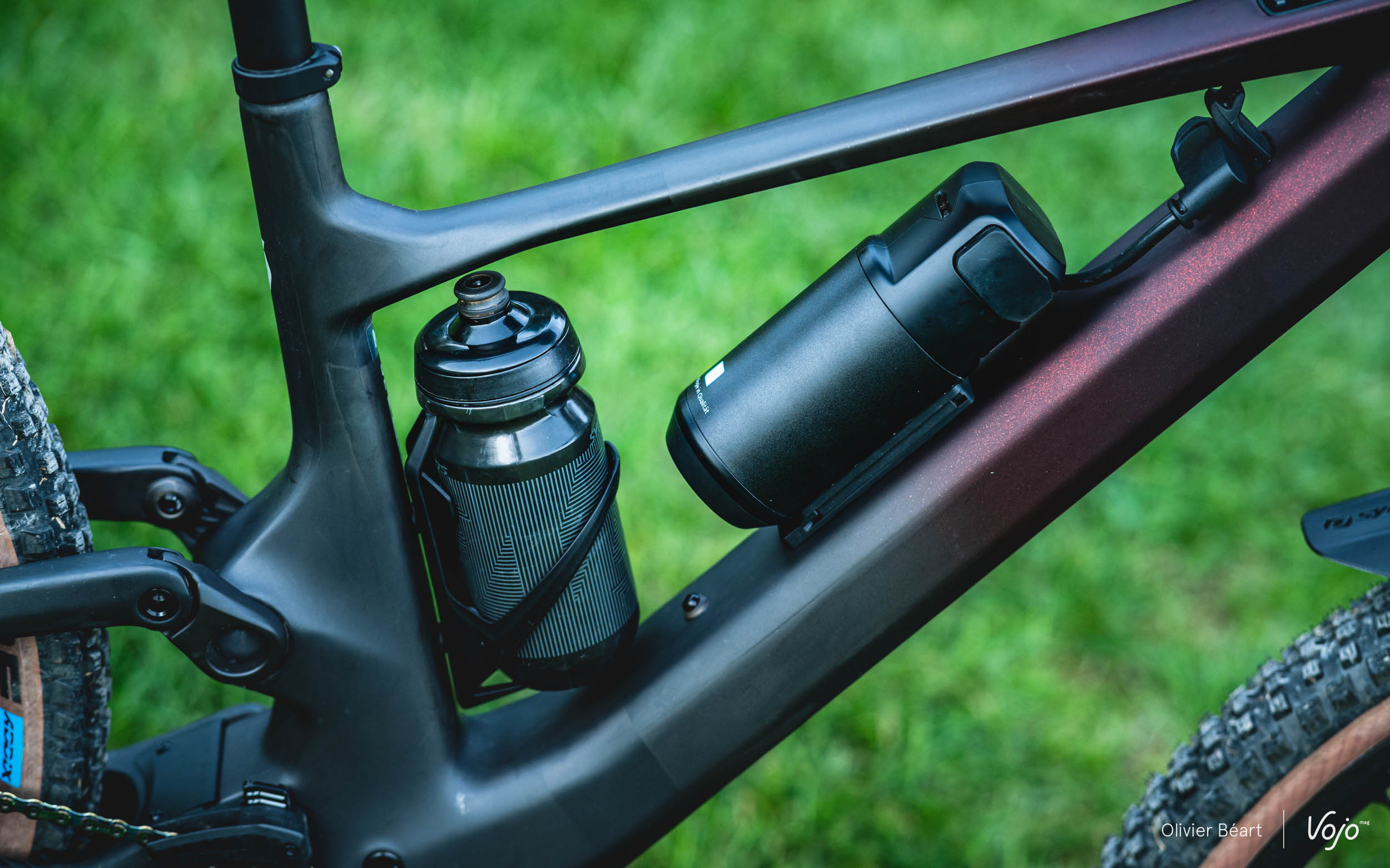 Ce qui signifie que, même quand on en monopolise un pour le range extender, il en reste toujours un deuxième libre pour prendre à boire. C’est assez rare pour être souligné ! Autre point, cette batterie additionnelle se fixe directement sur une base spécifique attachée au cadre, sur laquelle on peut aussi fixer un porte-bidon développé par Syncros. Cela assure un meilleur maintien que de simplement insérer la batterie additionnelle dans un porte-bidon, et cela donne un peu plus de libertés de formes lors de la conception de cet accessoire.