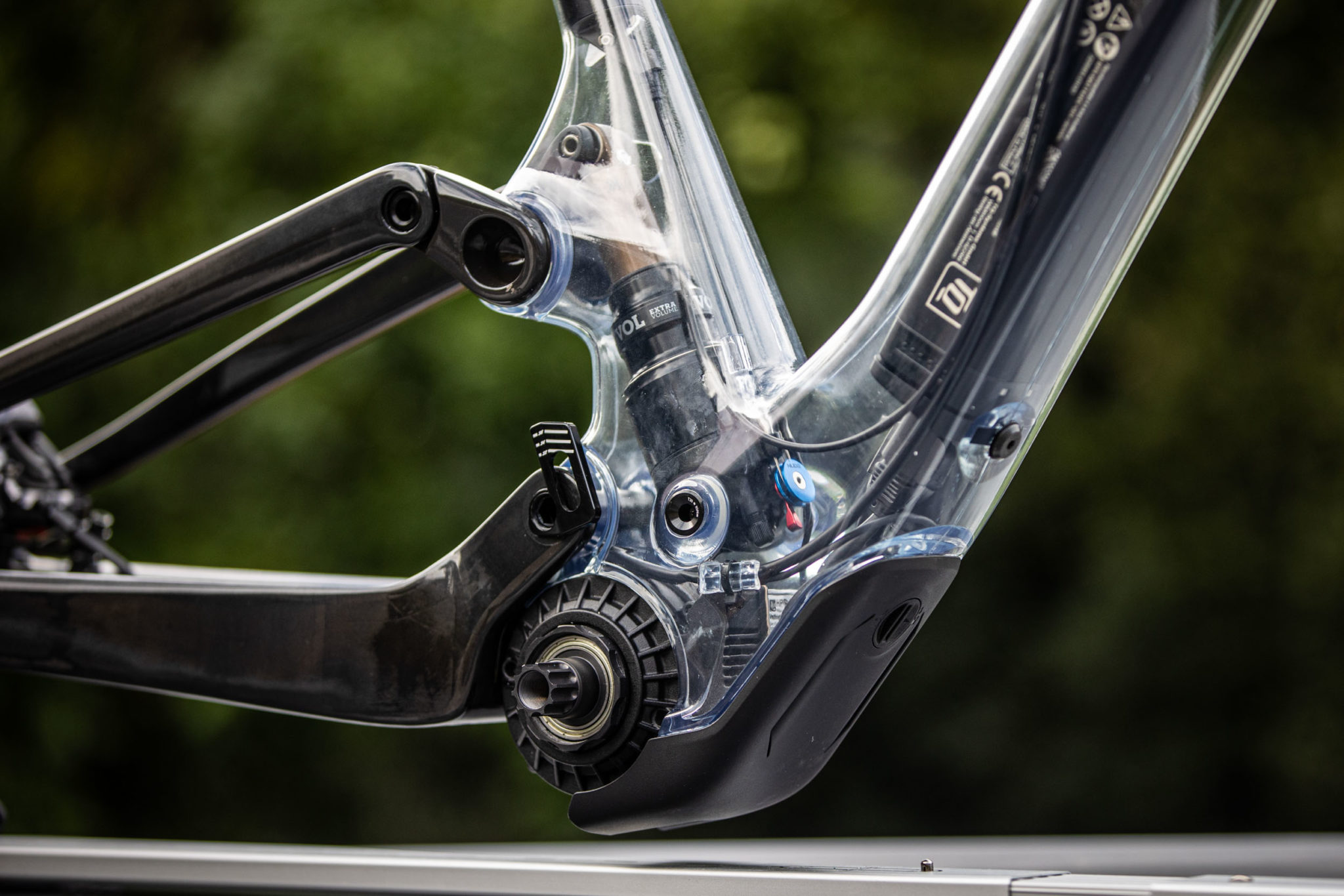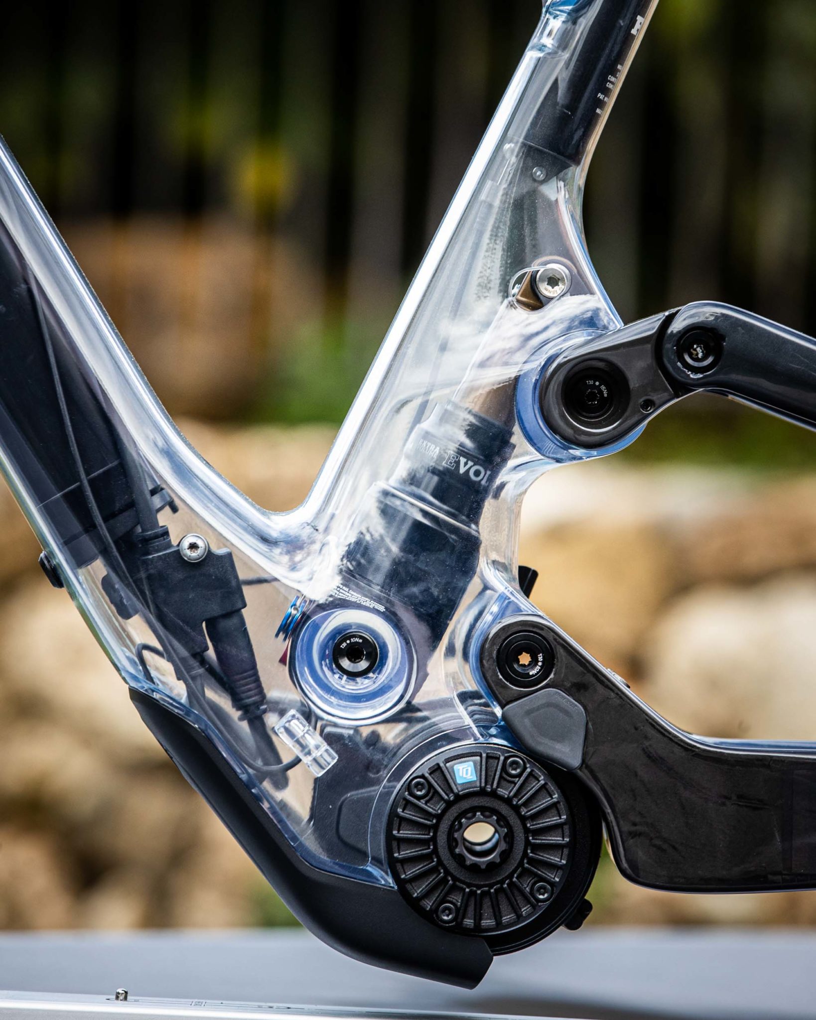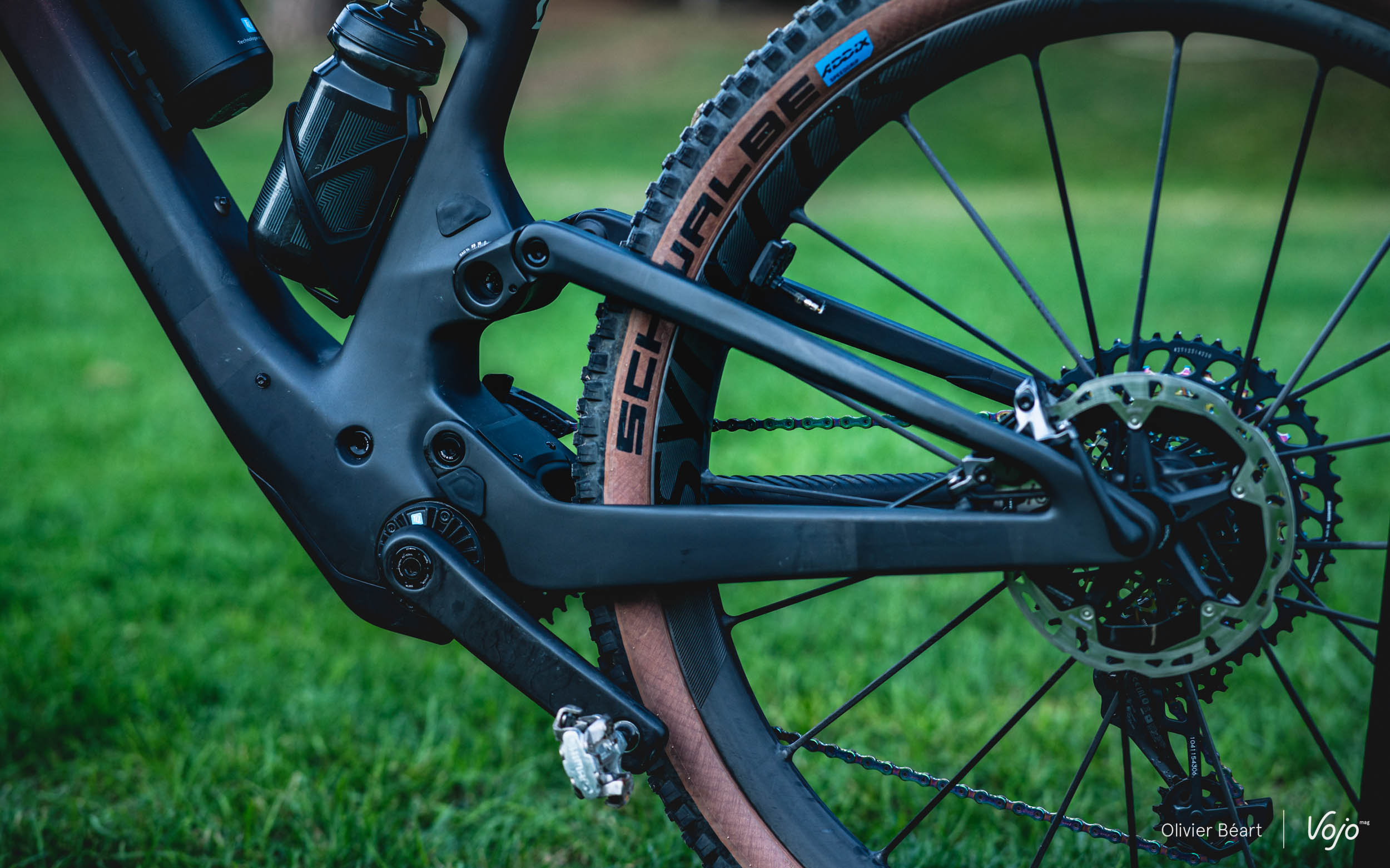 Du côté de la suspension arrière, on reste aussi sur une philosophie très proche de celle du Spark, avec quelques petits ajustements. L’amortisseur est toujours bien intégré dans le cadre (utilisation du brevet Bold, autre marque suisse qui a désormais rejoint le groupe Scott) et l’expérience de la marque au niveau du carbone et des bras arrière avec zones de déformation a permis de se passer de point de pivot près de l’axe de roue arrière, malgré le débattement qui est désormais de 130 mm. Cette légère augmentation est due à l’augmentation de la longueur des bases et à la présence d’une biellette légèrement modifiée qui permet en outre de placer l’amortisseur un peu plus en profondeur dans le cadre pour offrir plus de place au moteur.