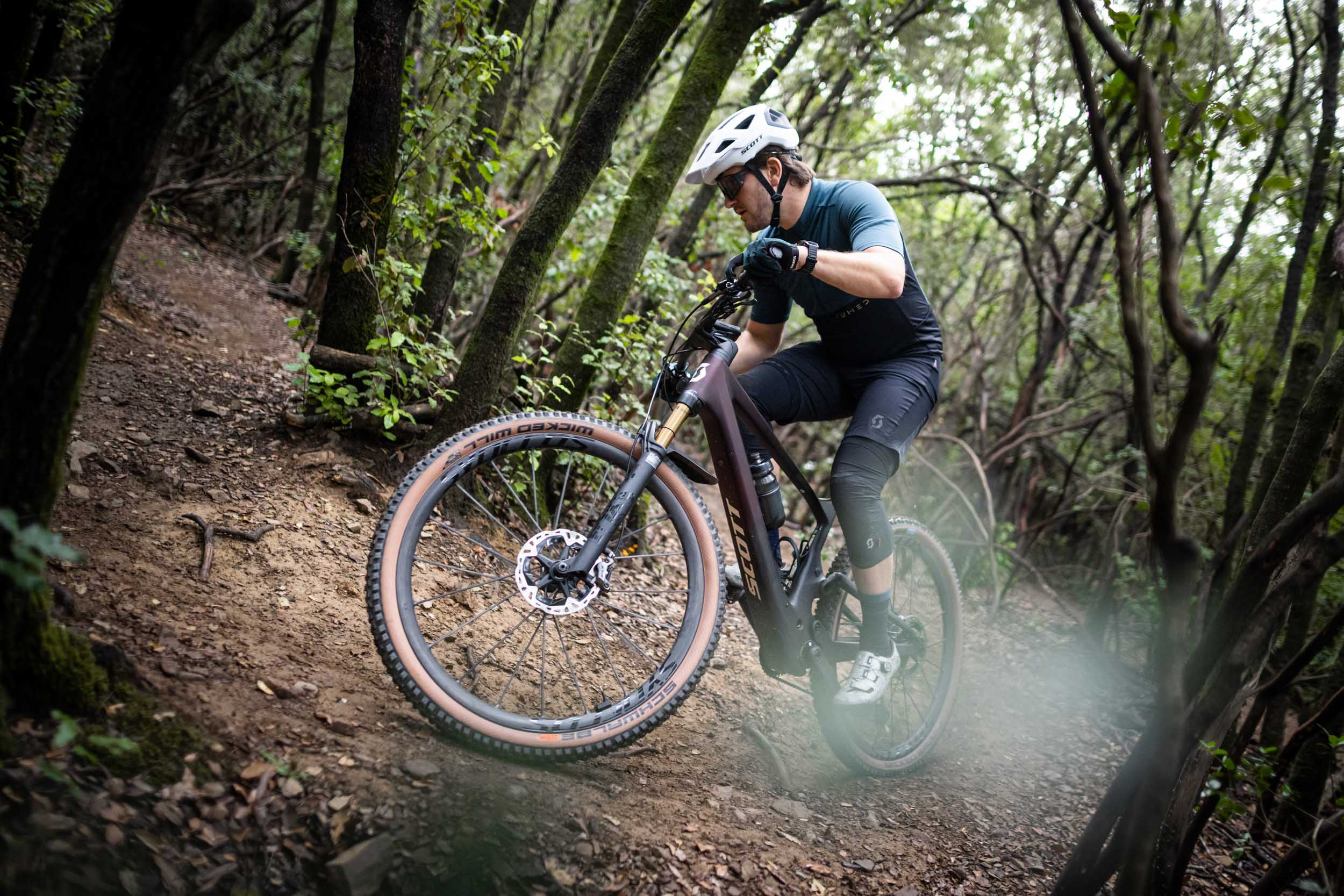 Un seul point nous a bridé en descente : le train roulant. Scott a voulu nous faire essayer la version la plus légère du Lumen (SL), ce qu’on peut comprendre si le but est de montrer tout le potentiel du concept d’e-bike light. Mais en plus d’être hyper chère et déconnectée de la réalité des modèles qui vont vraiment se vendre, cette version est dotée des roues full carbone Syncros Silverton SL. Si nous avions adoré ces roues lors de notre premier essai du Spark RC, nous les avons trouvées ici hors de propos. Ok, elles sont légères et elles supportent bien le poids du Lumen en apportant ce qu’il faut de précision, mais elles rendent le vélo beaucoup trop vif dans les changements d’appui.