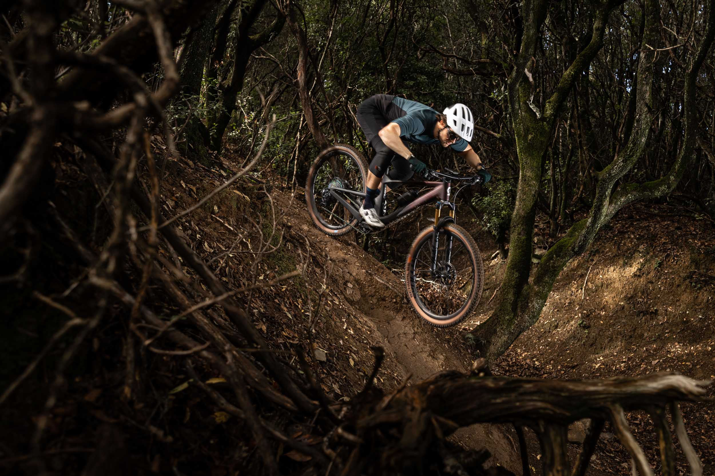 Même s’il donne clairement l’impression d’avoir des jambes de champion, le Scott Lumen ne joue pas vraiment dans la même cour que le Spark RC utilisé en coupe du monde par Nino Schurter et qui offre un comportement plus pointu, vraiment axé performance. Il se rapproche très fort d’un Spark 900, avec un côté encore plus all-mountain/trail bike que gros XC/downcountry. Nous disons cela notamment parce que les suspensions du Lumen, et surtout l’arrière, nous ont paru offrir encore plus de confort et d’onctuosité que celles du Spark 900, rendant la bête plus douce et facile à dompter, même si elle peut se transformer en fauve sur simple demande quand on décide de souder en descente.