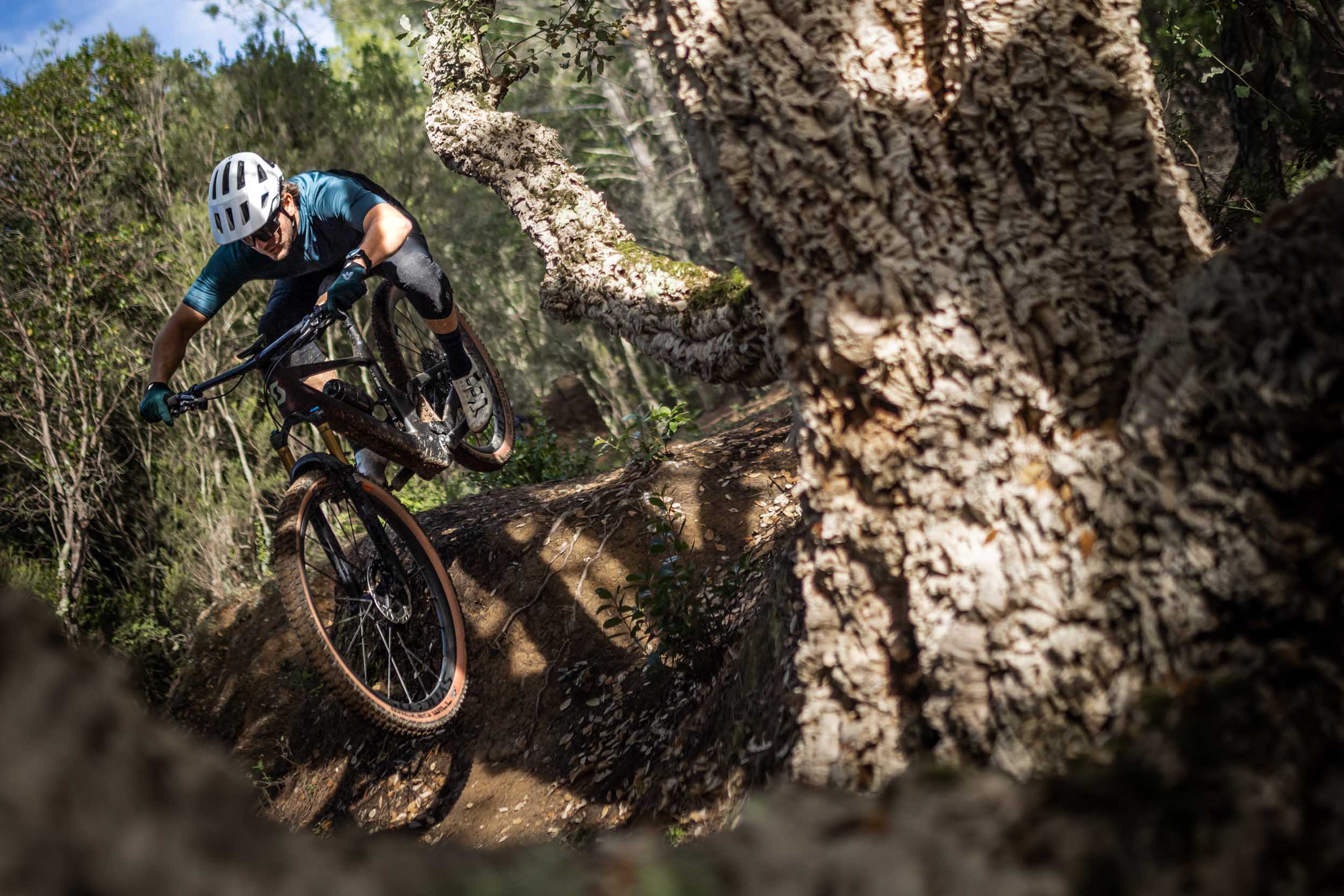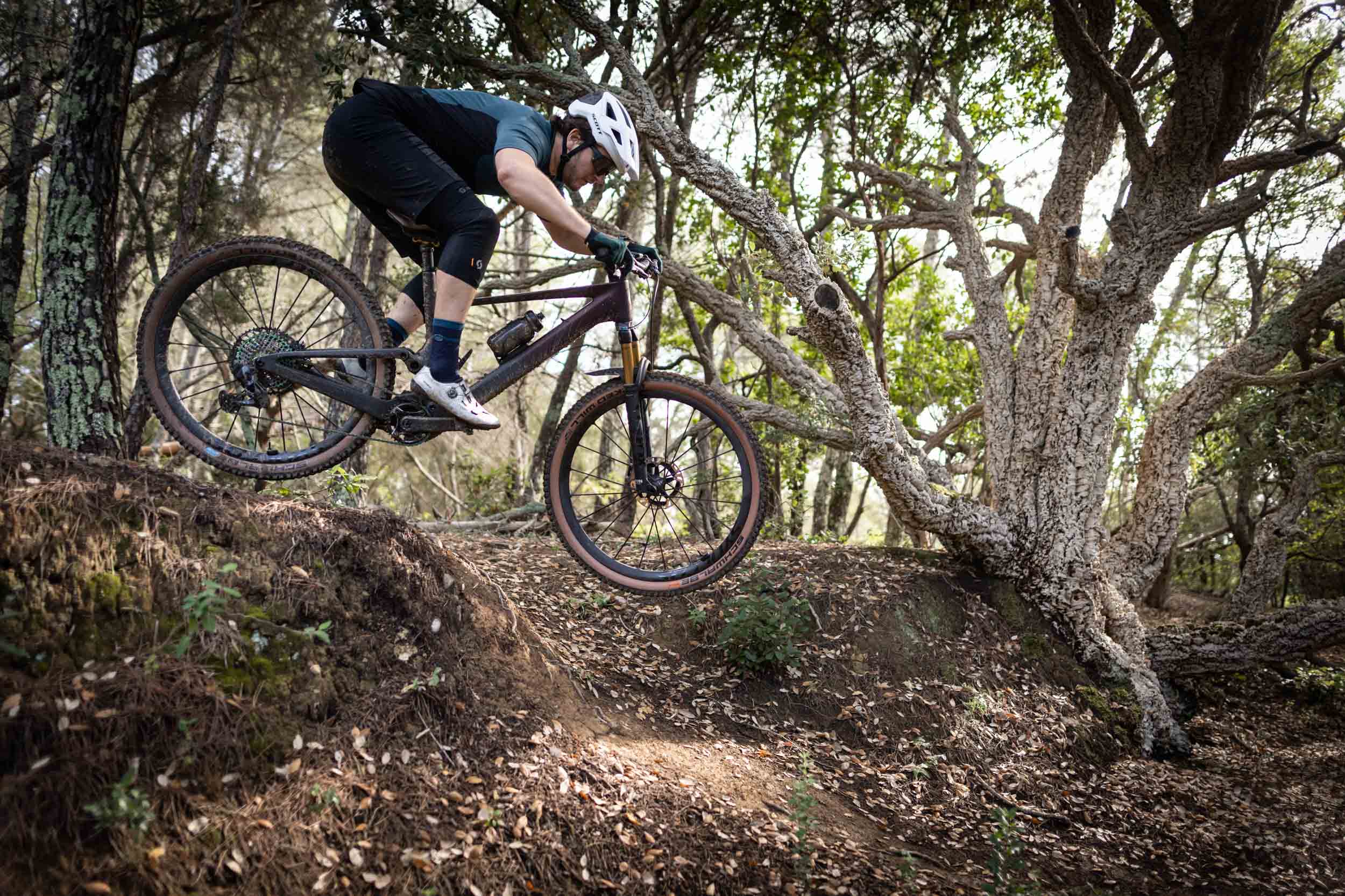 Contrairement à ce qu’on pourrait penser, ce ne sont pas des roues hyper rigides avec un comportement de bout de bois, mais elles ont naturellement un « rebond » plus rapide que des roues classiques. C’est notamment la raison pour laquelle Nino Schurter ne les utilise pas sur tous les terrains et préfère des roues à rayonnage acier classique quand c’est cassant. Et sur le Lumen, ce trait de caractère devient flagrant même sans avoir la vitesse et la technique de pilotage d’un champion, au point de détériorer l’expérience de pilotage en créant des réactions parasites à des moments inattendus et en ne permettant pas de profiter pleinement des énormes qualités du châssis. Sans compter que, lors de la présentation, deux confrères ont cassé une roue sur un impact avec le terrain. Au final, c’est presque une bonne nouvelle, puisqu’on est prêts à parier que les versions moins haut de gamme du Lumen, dotées de roues classiques, seront encore meilleures !