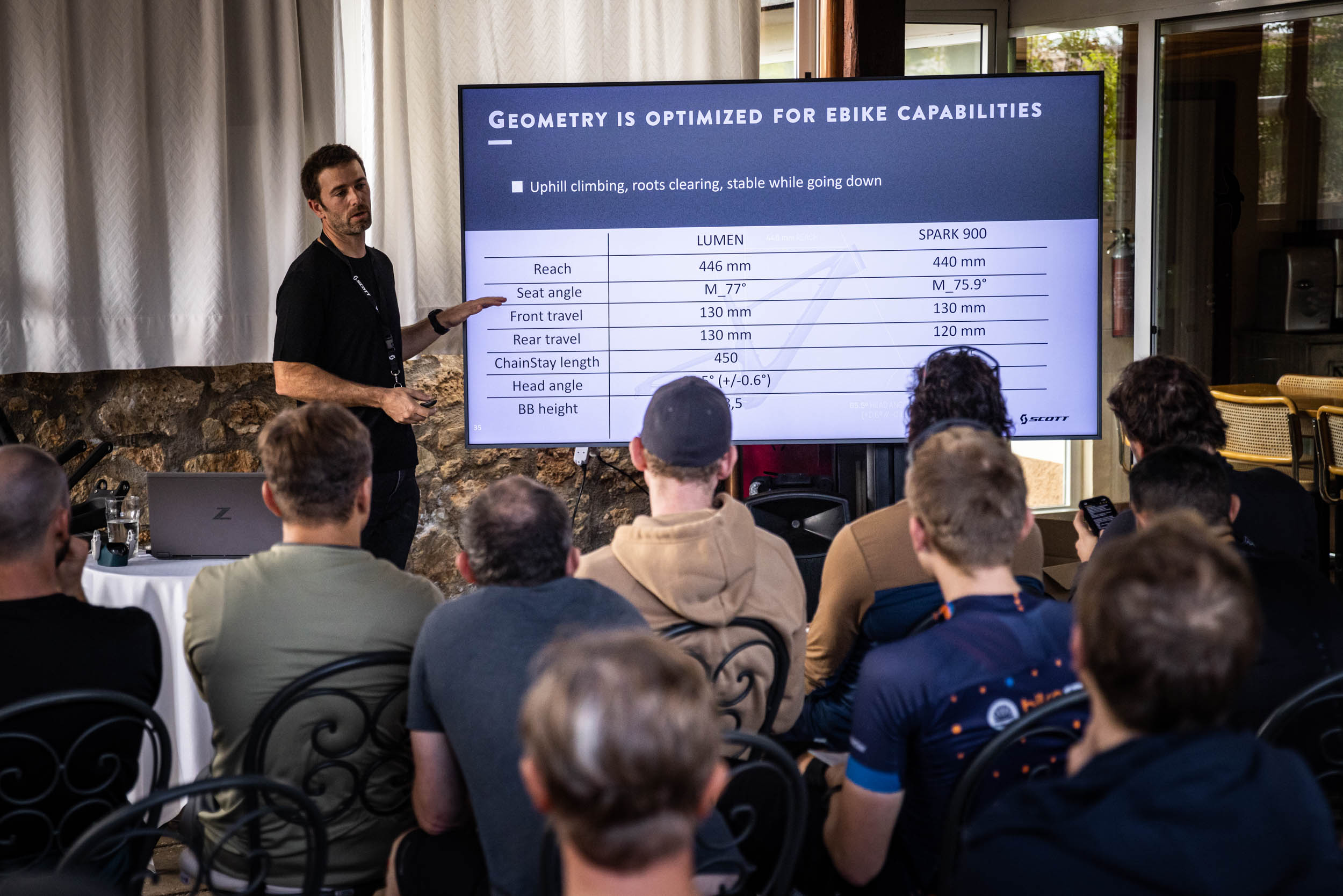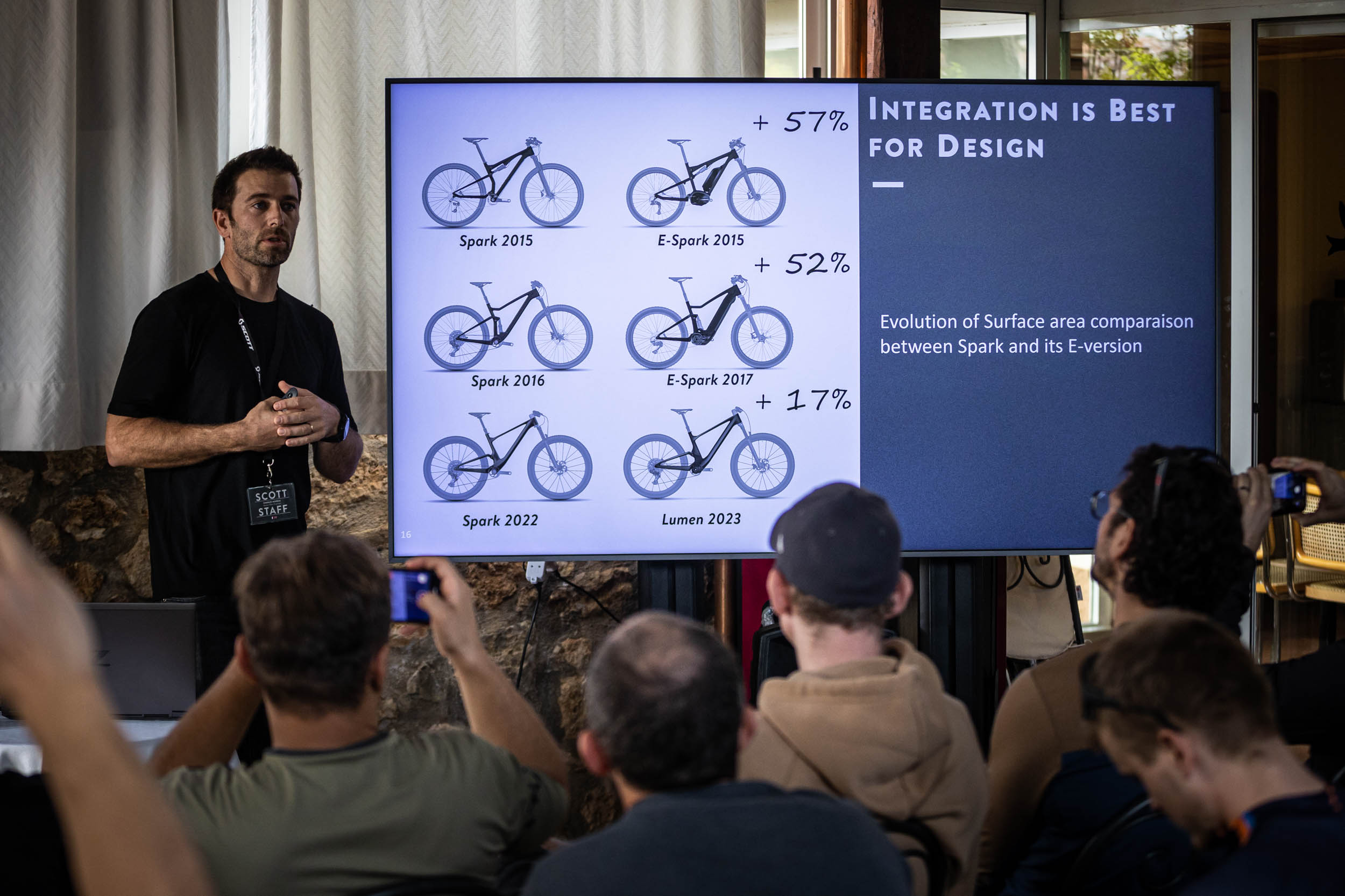 Même s’il ne s’appelle pas « eSpark » car la marque a décidé de donner désormais des noms spécifiques à ses vélos à assistance électrique, le Scott Lumen aurait probablement mérité bien plus que ses prédécesseurs de porter ce patronyme, tant il se rapproche visuellement et conceptuellement d’un Spark. Pour s’en convaincre, un slide projeté pendant la présentation de Charles Moreau (l’ingénieur français à qui ont doit déjà le Spark et qui a ensuite mené le développement du Lumen) est particulièrement parlant. Il montre que le volume des cadres des précédents eSpark était plus de 50% supérieur à celui de leurs homologues sans assistance. Alors qu’aujourd’hui, le Lumen n’est que 17% plus imposant qu’un Spark classique.