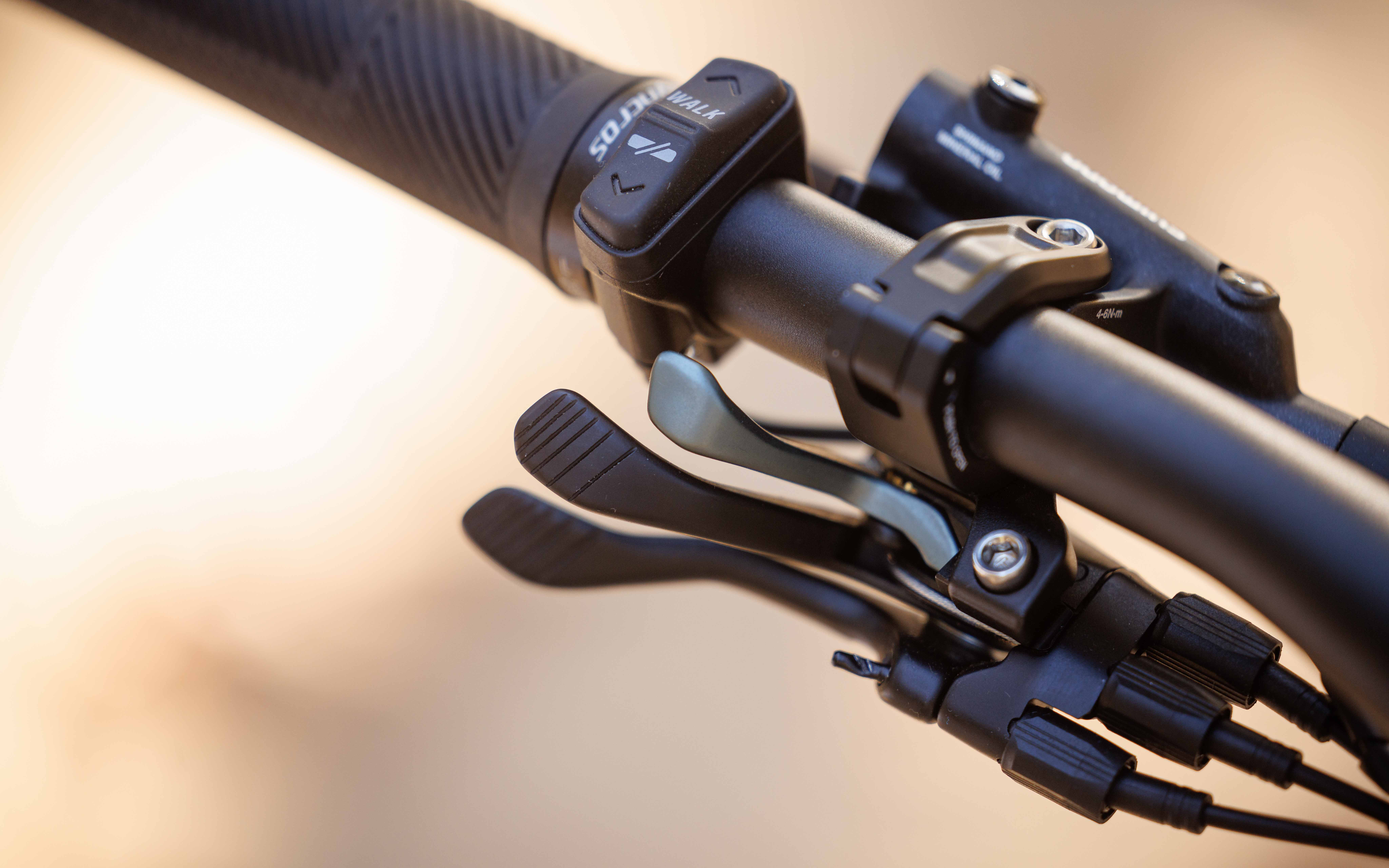 Là où le Voltage sort son épingle du jeu, c’est au niveau du TracLoc permettant d’osciller entre trois positions au niveau de l’amortisseur : Descent (position par défaut), Ramp Control (volume d’air réduit à 60%, mais compressions ouvertes) et Climb (volume d’air réduit à 60% et compressions fermées). Si la première n’est utile que sur des segments de bitume ou assimilables, c’est surtout la position intermédiaire qui retient toute notre attention. Toute indiquée pour les ascensions techniques où l’on désire conserver du grip et de la traction à la roue arrière, celle-ci permet d’obtenir un châssis réactif et qui ne pompe pas.