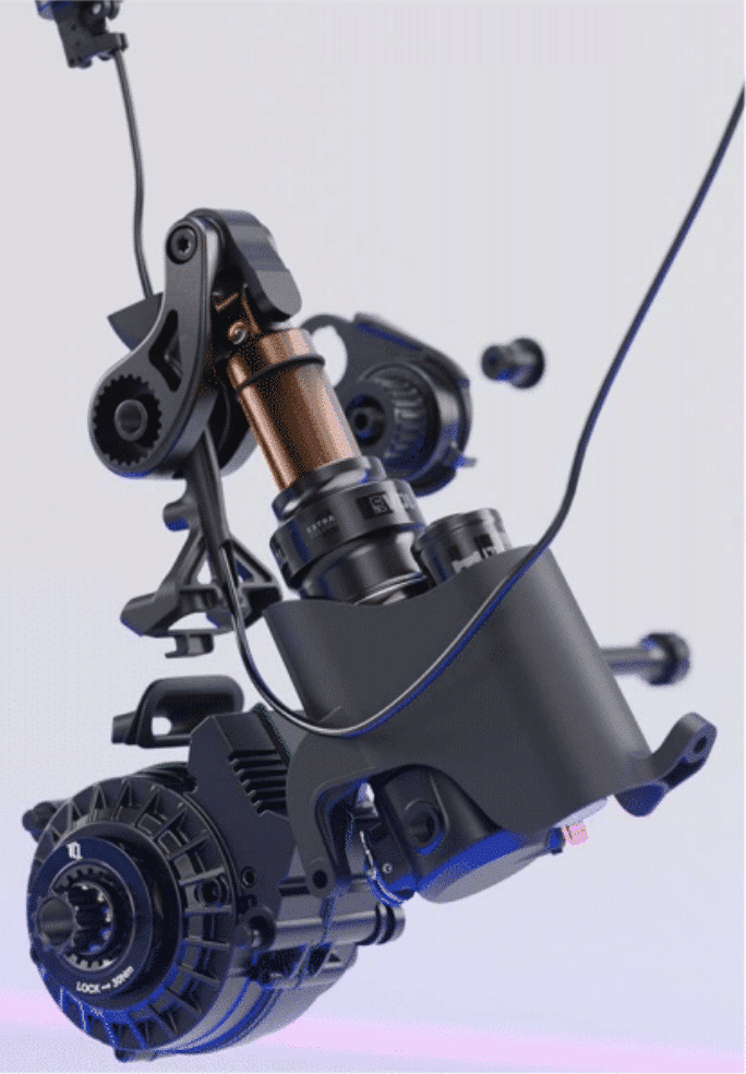 Même avec l’amortisseur caché dans le cadre, c’est l’habituel système 4 bar linkage type Horst Link (voir notre lexique) que l’on retrouve sur ce Voltage eRide, à l’image des Scott Genius.