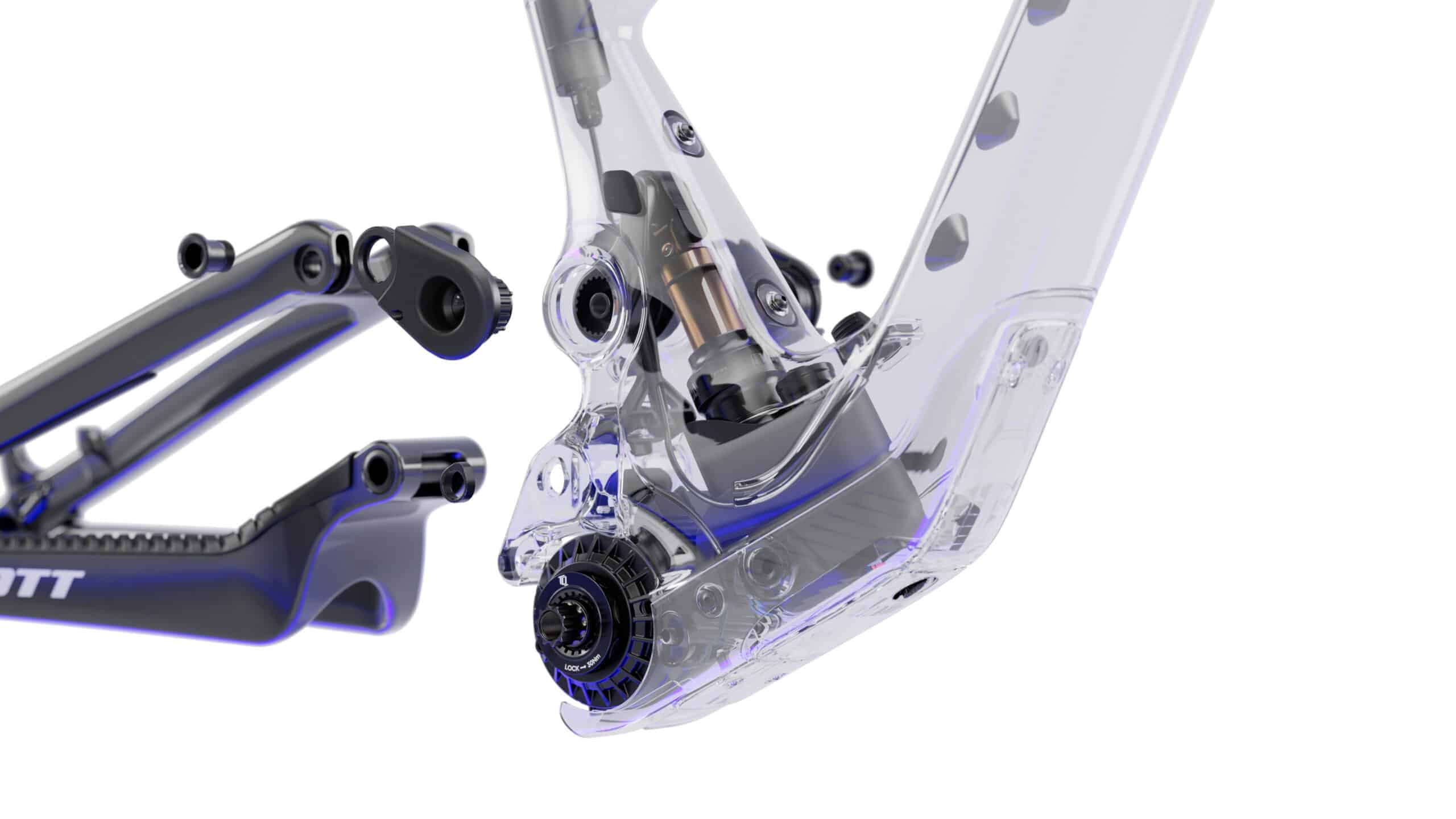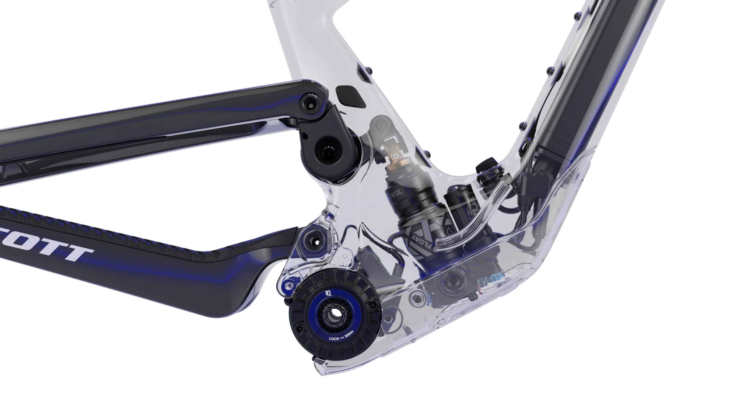 Les gaines passent ainsi sur le haut de la batterie avant d’être guidés sur le côté de l’amortisseur et de soit continuer leur chemin vers le triangle arrière, soit monter vers le tube de selle pour la tige de selle télescopique. À ce sujet, une seconde pièce a dû être développée par Scott pour permettre le passage du câble de tige de selle télescopique malgré le placement de l’amortisseur, et surtout sa possibilité de maintenance. Il s’agit de la petit gorge située en haut à gauche, juste en dessous de la biellette.