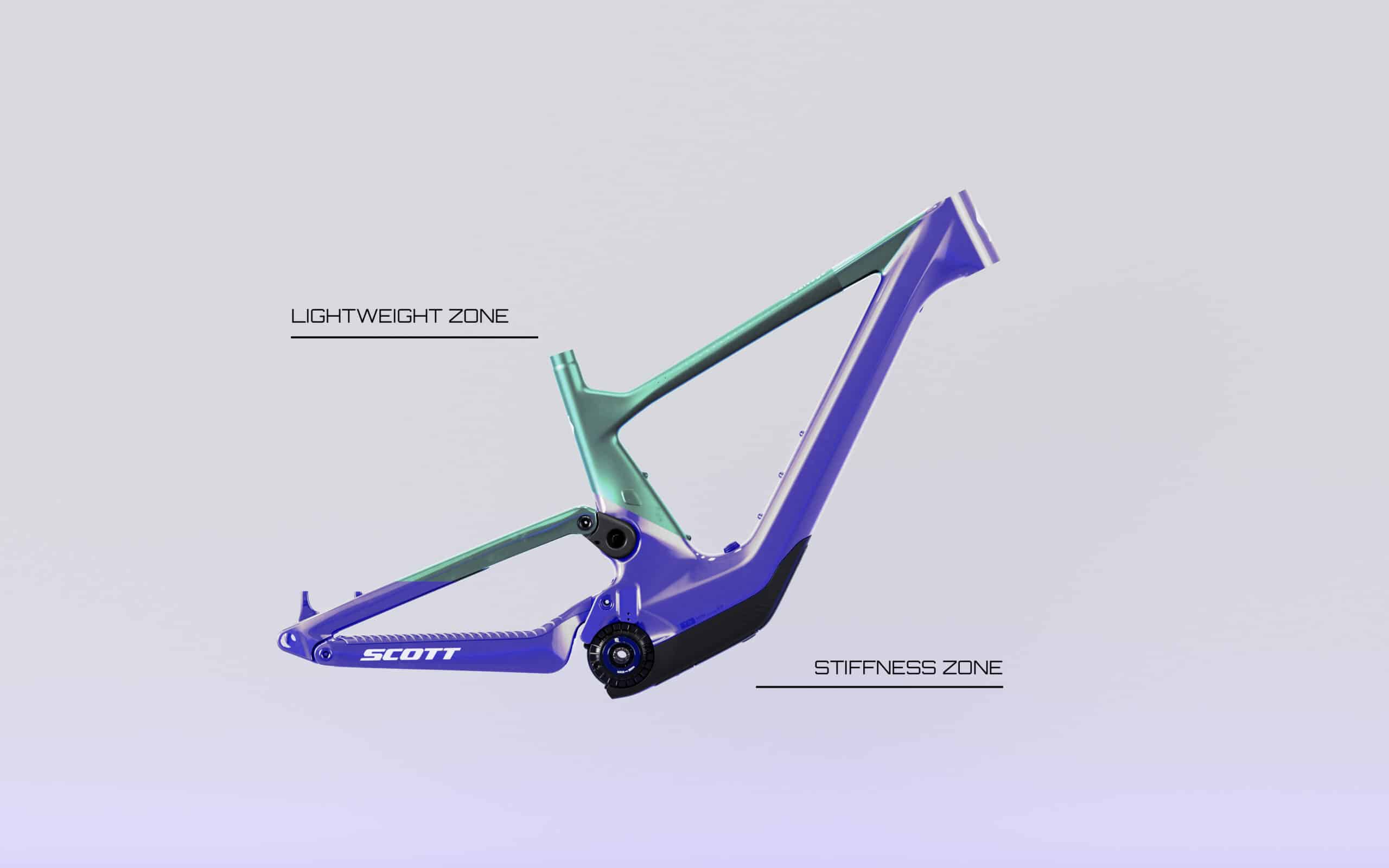 Comme d’accoutumée au sein de la marque, le rapport poids/rigidité a été au centre des attentions. L’orientation, la répartition et le choix des fibres de carbone sont faits en fonction des zones de contraintes du cadre. On peut ainsi observer que la zone du boîtier de pédalier / de l’amortisseur est plus rigide, alors que le haut du tube de selle ainsi que le tube supérieur sont affinés afin de gagner du poids. « En renforçant stratégiquement certaines zones rigides, nous pouvons vraiment maximiser les économies de poids sur les autres parties du cadre » détaille Yan.