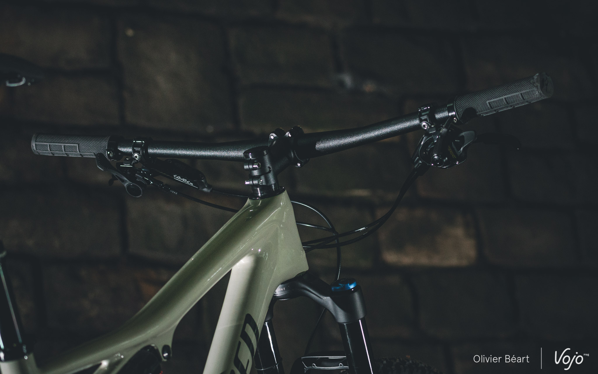 Pour mieux coller à sa vocation de trailbike, le Specialized Epic Evo se pare aussi d’un cintre plus large, en 750mm, et la potence en 70mm est 5mm plus courte que sur la version XC.
