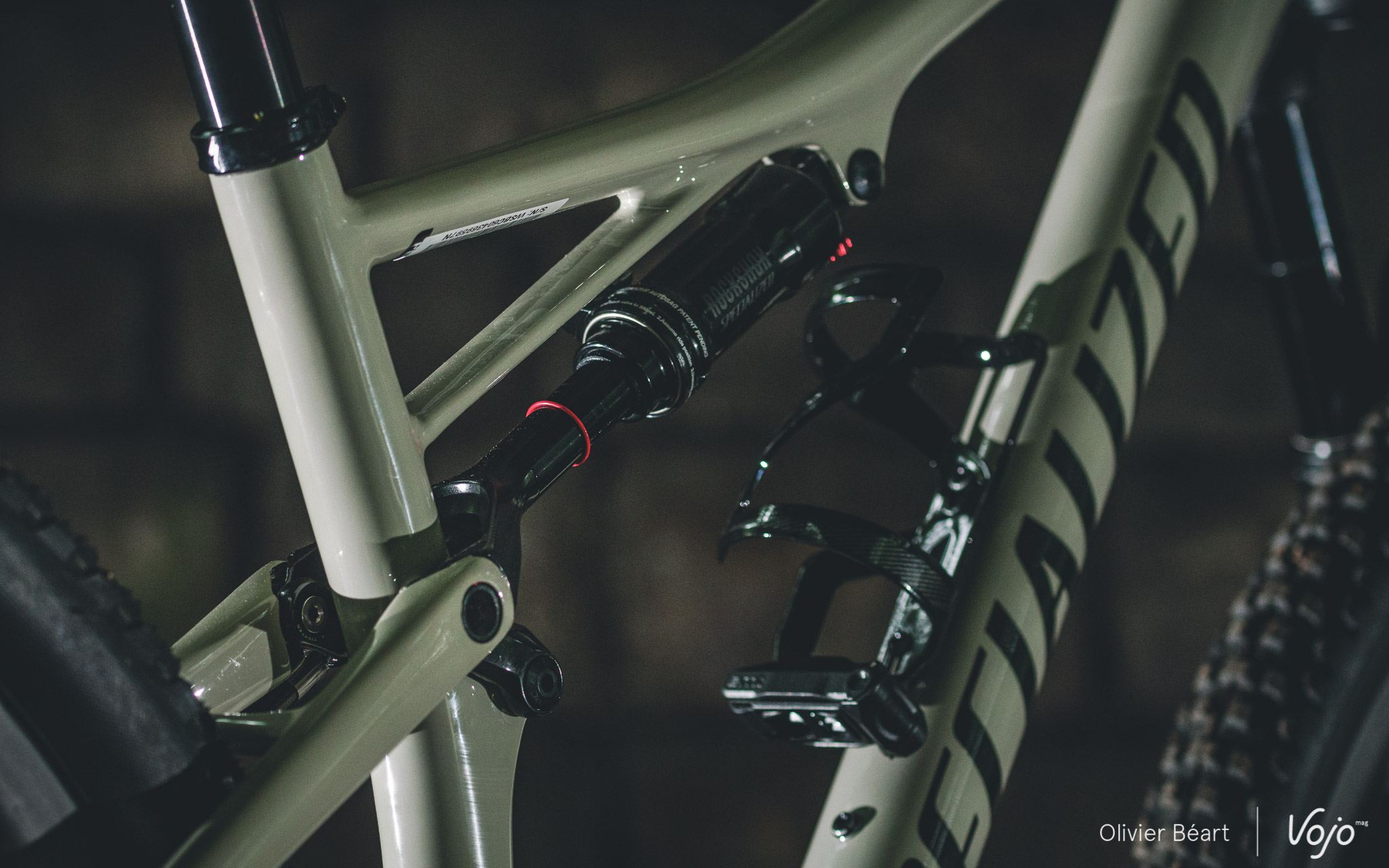 La fourche justement, se gonfle avec une pression environ égale au poids du pilote. La chambre d’air Evol assure une très bonne sensibilité sur les petits chocs, et la partie hydraulique Grip très fluide apporte aussi sa pierre à l’édifice. Bref, on a un avant très onctueux, qui se marie pas mal à l’arrière, à condition que le Brain ne soit pas dans une des positions les plus fermes. Auquel cas, on se retrouve avec un vélo qui peut paraître déséquilibré.