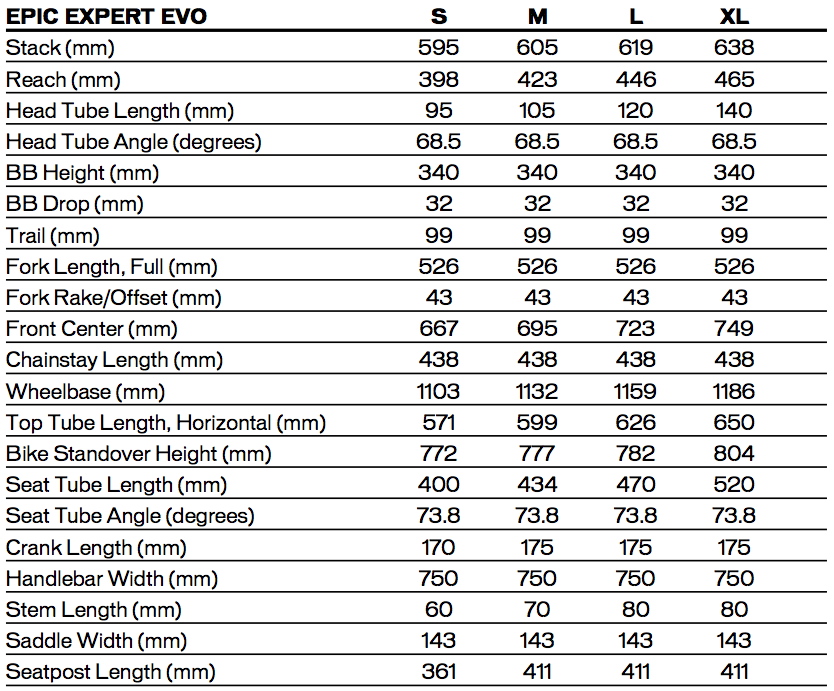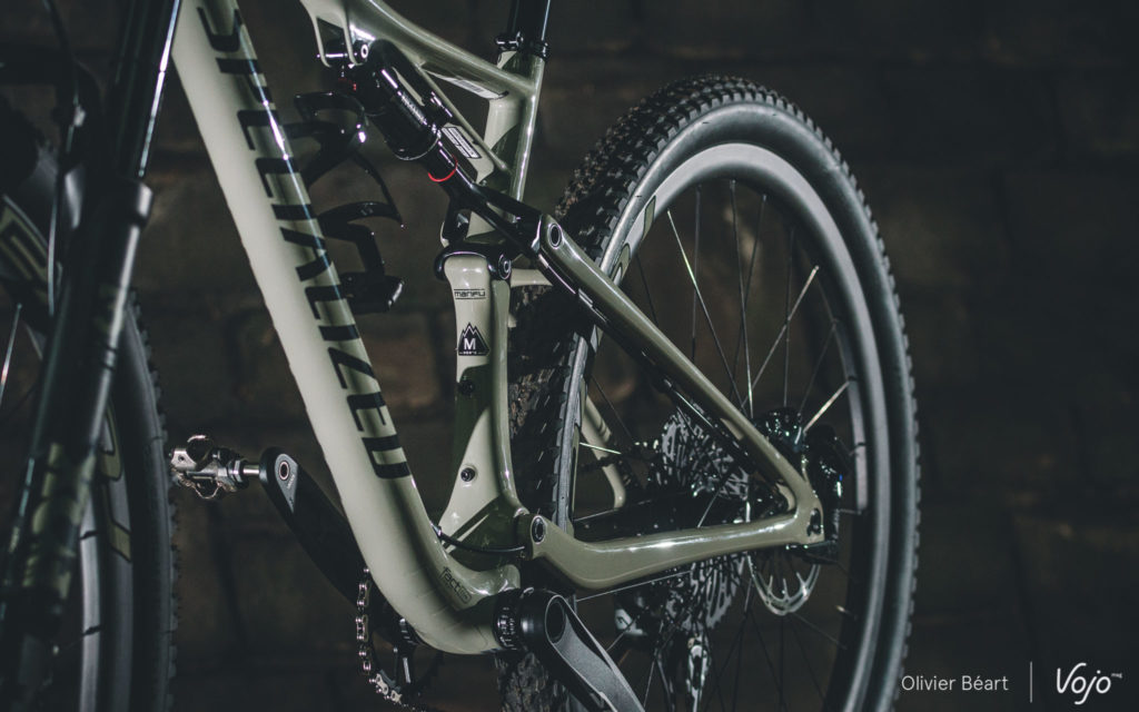 Sur la version Evo, on constate aussi qu’avec cet avant plus haut, le reach se raccourcit d’un centimètre (423mm en taille M), quand le stack (relatif à la hauteur) croît de 8mm. Par contre, bien évidemment, la longueur des bases ne change pas (438mm), et Specialized est reparti aussi sur une fourche avec un déport court (43mm) pour « calmer » la direction (voir plus d’explications dans notre test de l’Epic version XC). Voilà pour le menu, mais il faudra voir ce qui se ressent réellement sur le terrain.