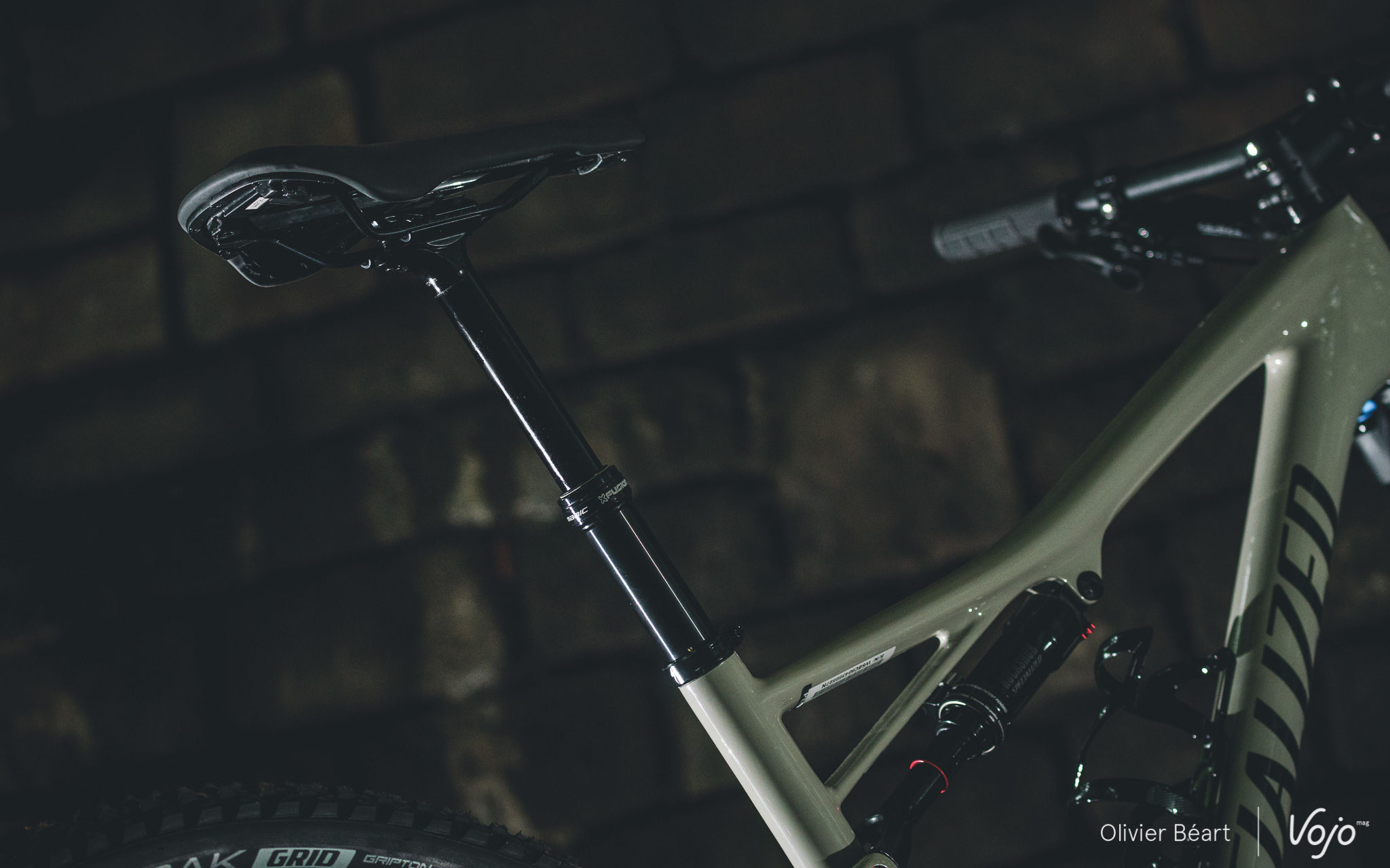 Nous l’avons déjà dit lors du test de l’Epic XC : une tige de selle télescopique lui va à merveille. Et sur l’Epic Evo, elle est montée de série ! Il s’agit de l’excellente X-Fusion Manic, qu’on retrouve aussi sous d’autres noms (Race Face Aeffect, Syncros,…) en version 125mm. Ce n’est pas un modèle haut de gamme, mais son fonctionnement est au-dessus de tout reproche et Specialized y adjoint sa propre commande au guidon, à l’ergonomie parfaite.