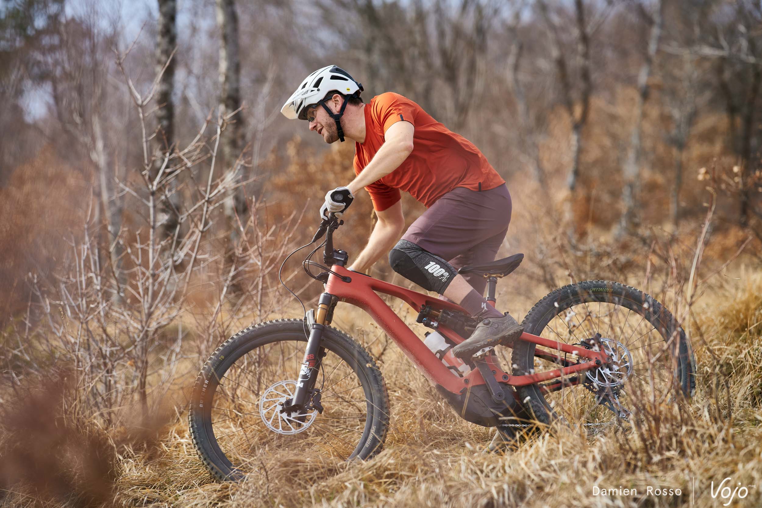 Un peu sceptique, n’ayant pas un background d’enduriste pur ni de descendeur, je teste quand même pour voir la position -1°. Et là on se retrouve avec… 63,5° d’angle à l’avant. Comme sur certains vélos de DH ! Je laisse les bases courtes vu le côté sinueux des trails, et c’est une révélation. Le bike ne perd pas vraiment en maniabilité, mais pousse encore plus à attaquer, se montre encore plus à l’aise dans les quelques segments rapides et défoncés, et procure des sensations encore plus grisantes. En position bases longues/boîtier bas, il joue à fond la carte « gros vélo », ce qui aide à prendre de la vitesse dans le défoncé, sans trop pénaliser la maniabilité, mais nous avons trouvé que cette combinaison était un poil moins adaptée au contexte dans lequel nous avons testé le vélo.