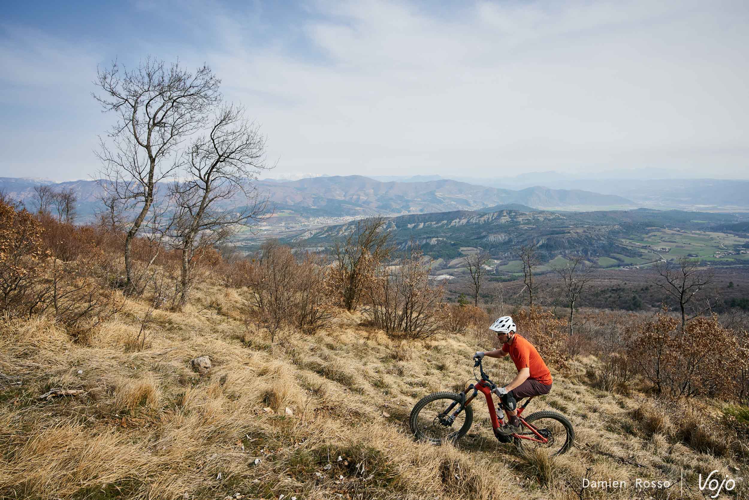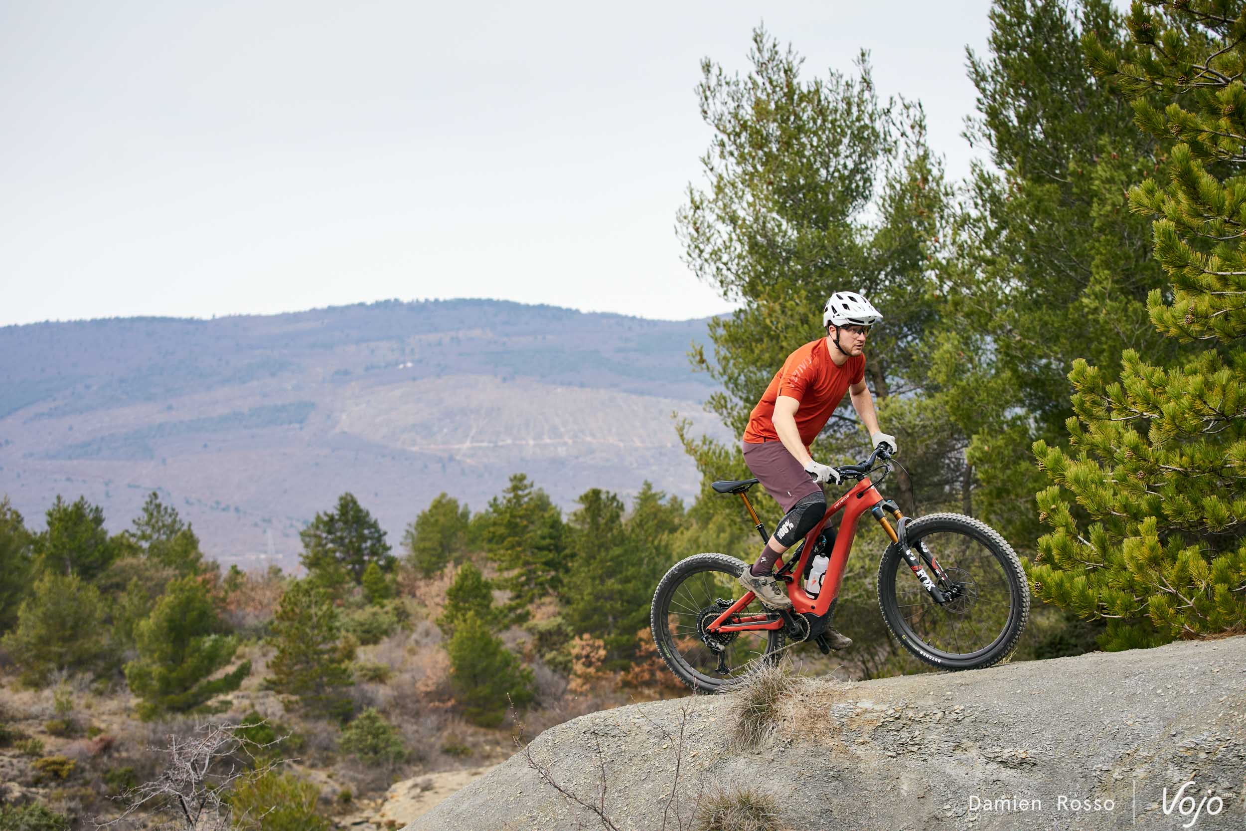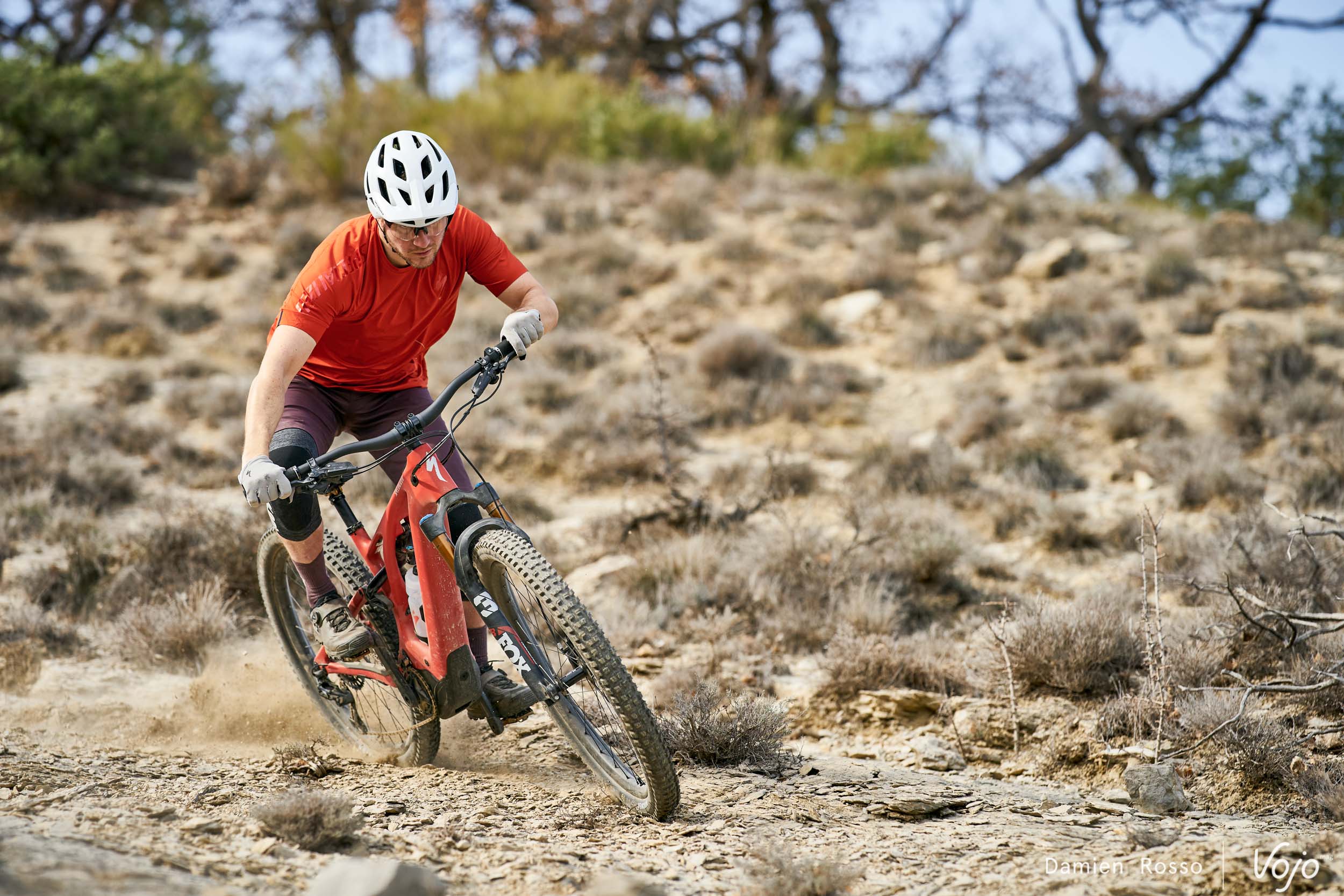 C’est bon, vous voyez un peu de quoi on parle maintenant ? Alors direction les singletracks de folie de Peyruis, dans le 04, pour un premier galop d’essai au guidon de cette machine élitiste par son tarif (on parle d’un peu plus de 11000€ pour le modèle Pro essayé, qui n’est même pas encore le plus haut de gamme) et par sa fiche technique, mais qui s’avère en fait en réalité beaucoup plus accessible qu’il n’y paraît une fois qu’on l’emmène sur les sentiers.