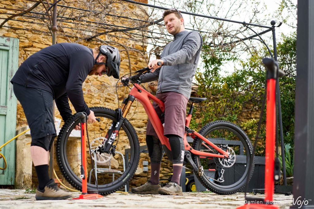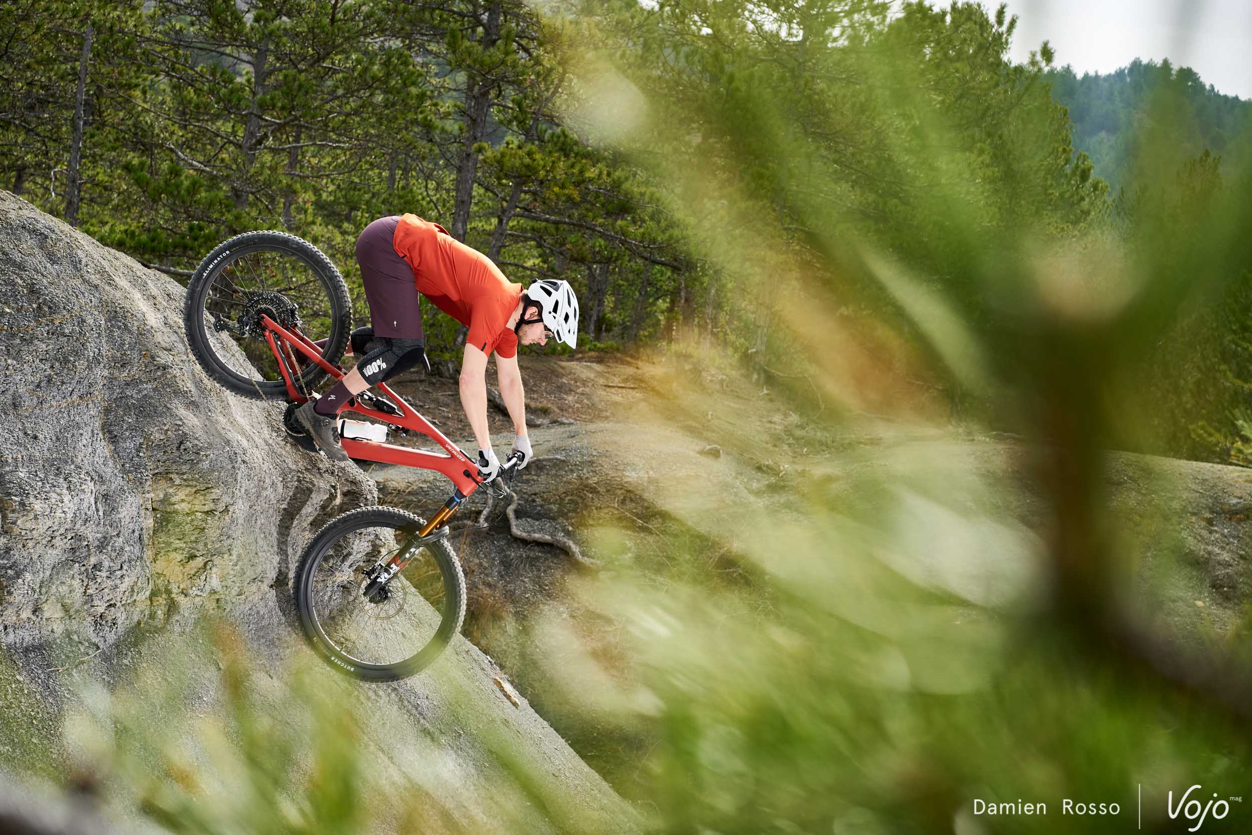 Un peu sceptique, n’ayant pas un background d’enduriste pur ni de descendeur, je teste quand même pour voir la position -1°. Et là on se retrouve avec… 63,5° d’angle à l’avant. Comme sur certains vélos de DH ! Je laisse les bases courtes vu le côté sinueux des trails, et c’est une révélation. Le bike ne perd pas vraiment en maniabilité, mais pousse encore plus à attaquer, se montre encore plus à l’aise dans les quelques segments rapides et défoncés, et procure des sensations encore plus grisantes. En position bases longues/boîtier bas, il joue à fond la carte « gros vélo », ce qui aide à prendre de la vitesse dans le défoncé, sans trop pénaliser la maniabilité, mais nous avons trouvé que cette combinaison était un poil moins adaptée au contexte dans lequel nous avons testé le vélo.