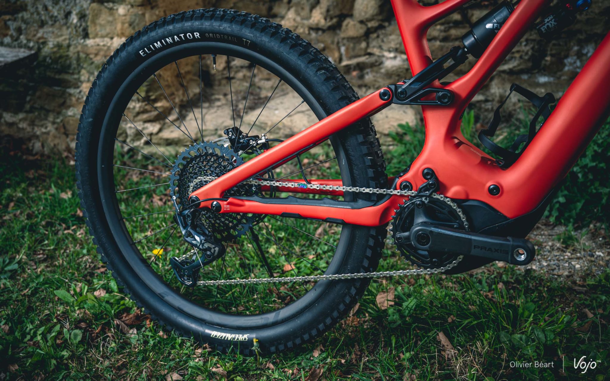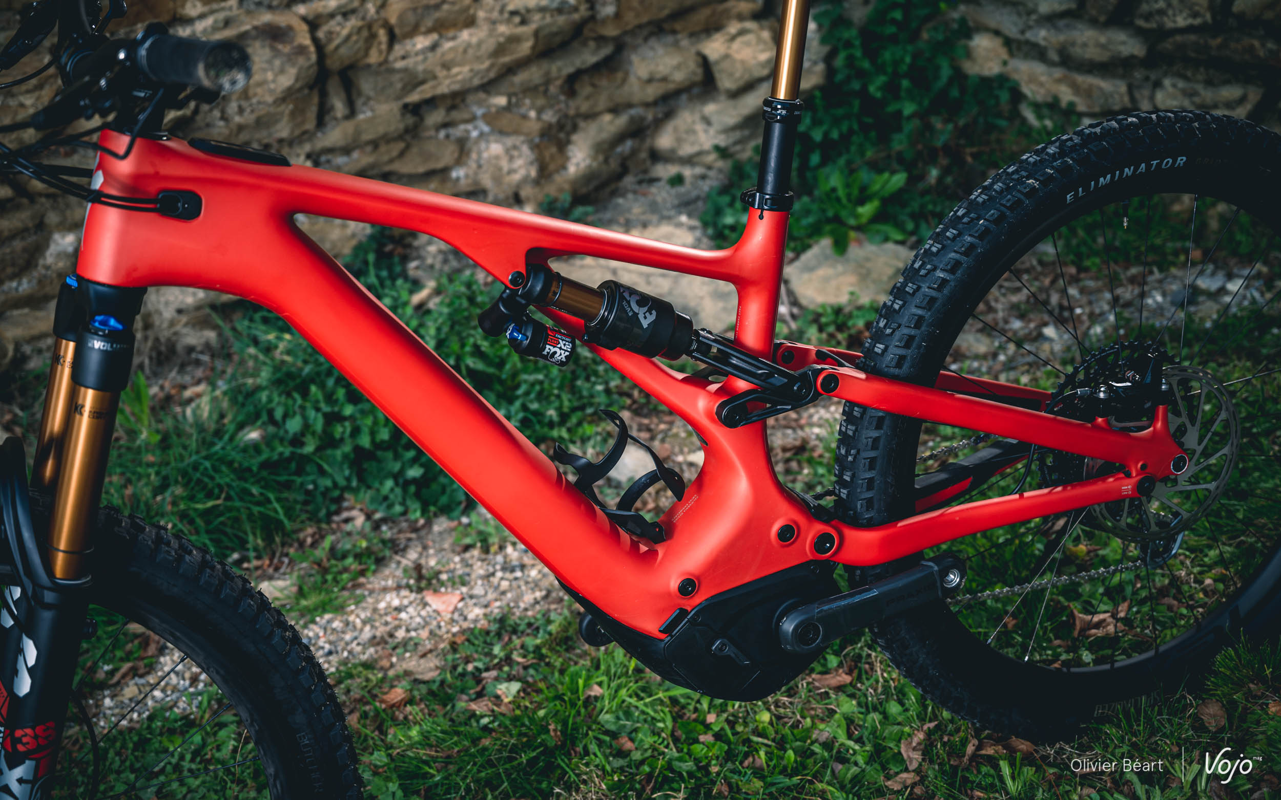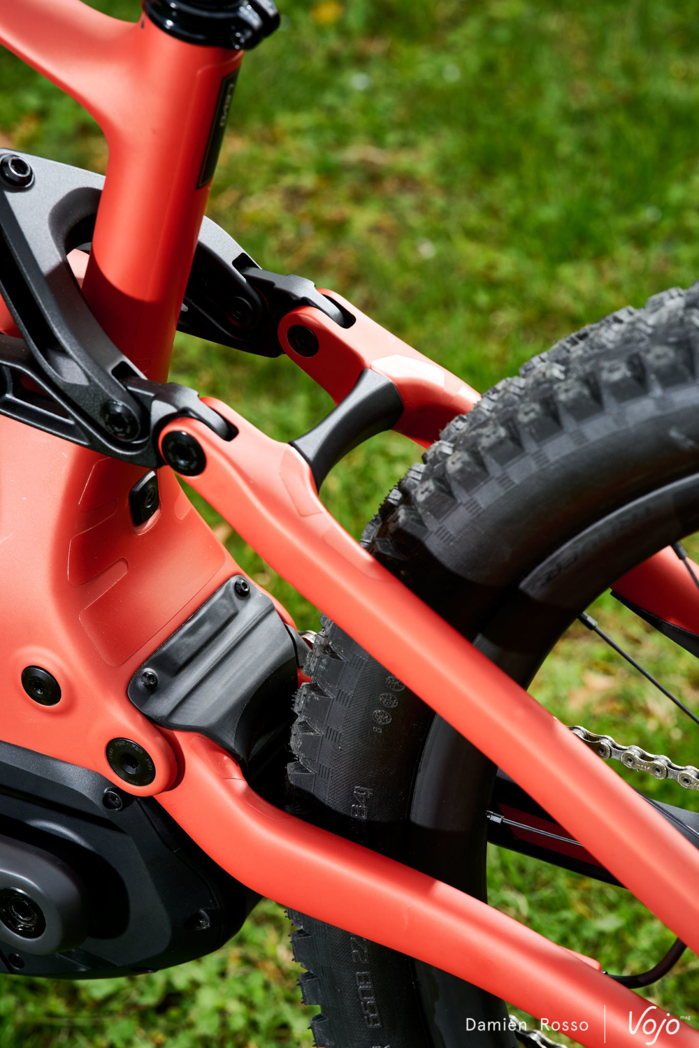 Le poids du châssis reste inchangé (autour de 9,5kg avec amortisseur, moteur et batterie) mais l’axe principal de la suspension, la biellette, ainsi que les points d’attache du moteur sont rigidifiés, de même que les triangles avant et arrière grâce à un travail plus poussé sur les fibres de carbone utilisées. Puis, il y a aussi le choix de taille des roues qui joue un rôle.