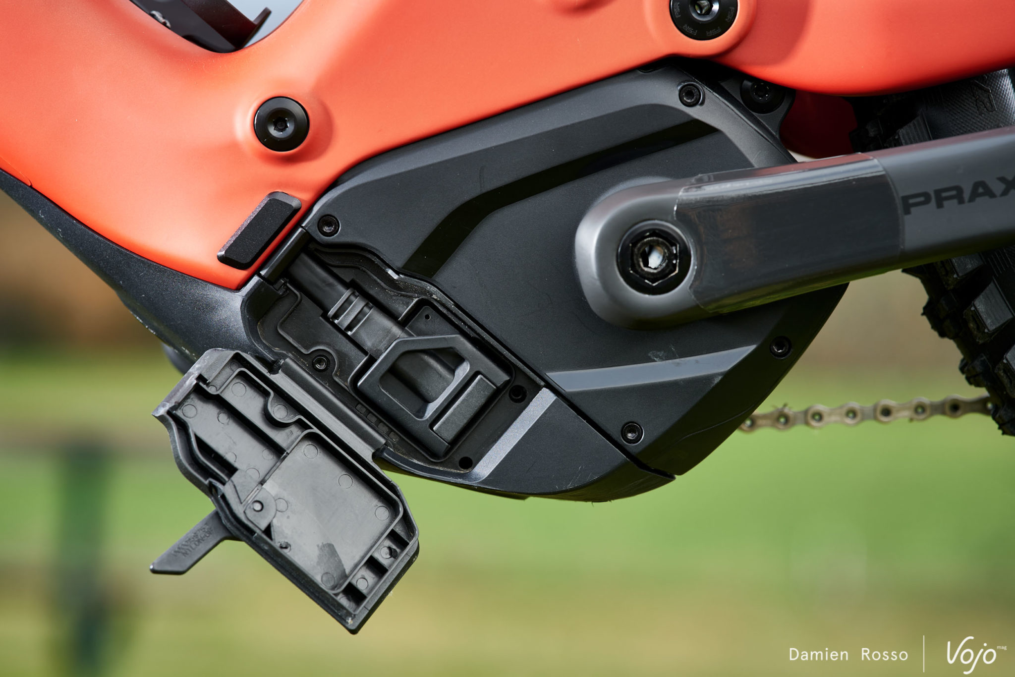 Sur notre vélo rouge, on remarque aisément la présence de nombreuses protections intégrées au cadre. Outre le désormais classique protège-base à « coussinets » pour éviter les bruits de chaîne, on note aussi une protection renforcée de la zone entre le moteur et le triangle arrière, ainsi qu’au niveau du passage de roue. Le carter moteur a aussi été renforcé. Enfin, à l’intérieur, une graisse à connecteur spéciale issue de la marine (Nyogel 760 pour les connaisseurs) a été utilisée entre toutes les parties électroniques pour garantir à la fois une connexion parfaite et une bonne étanchéité. Lors des entretiens, elle a la particularité de réagir à la lumière d’une lampe à UV. Si plus rien n’est visible, il convient de faire un re-graissage. Et cela permet de s’en rendre compte au premier coup d’œil.