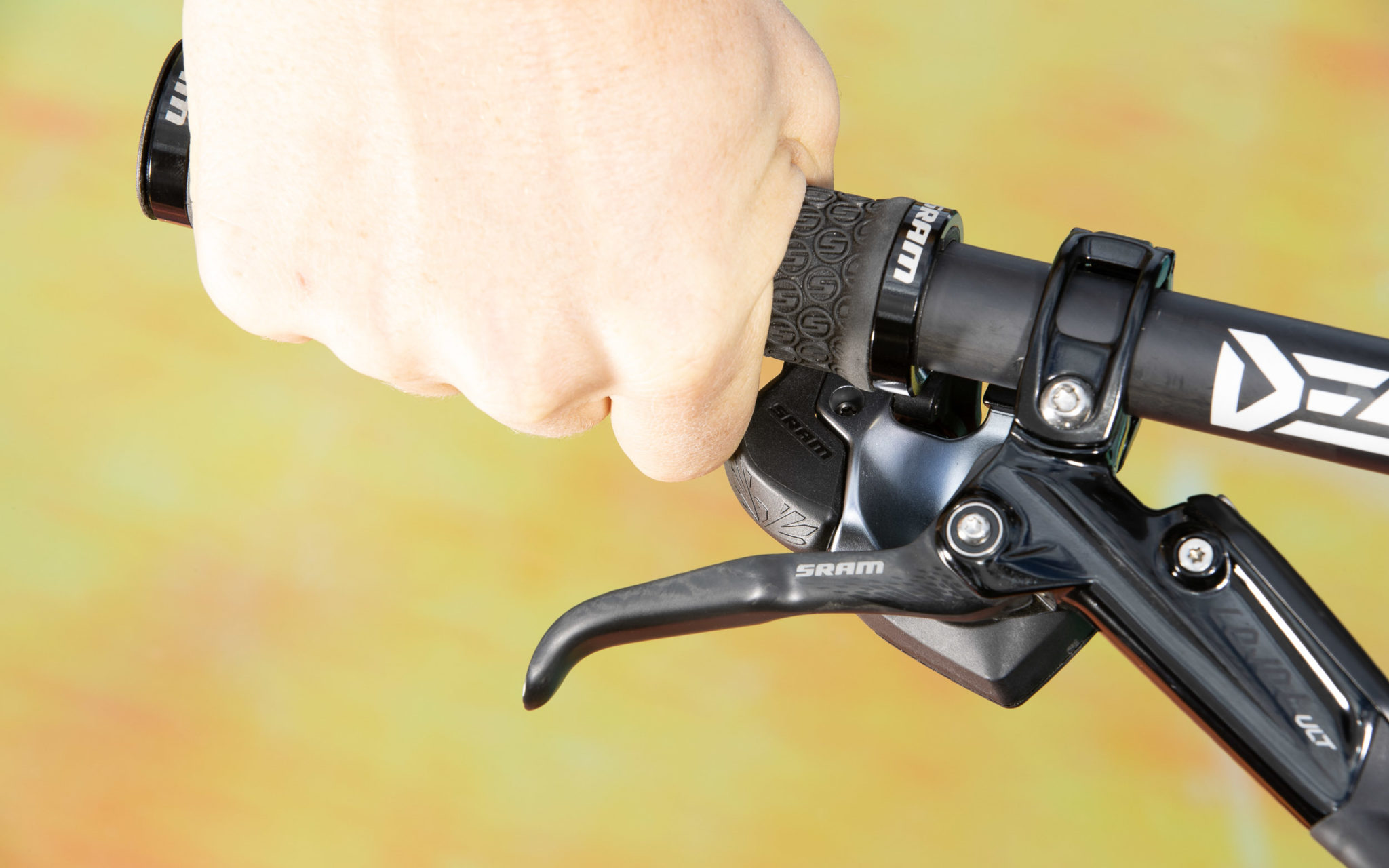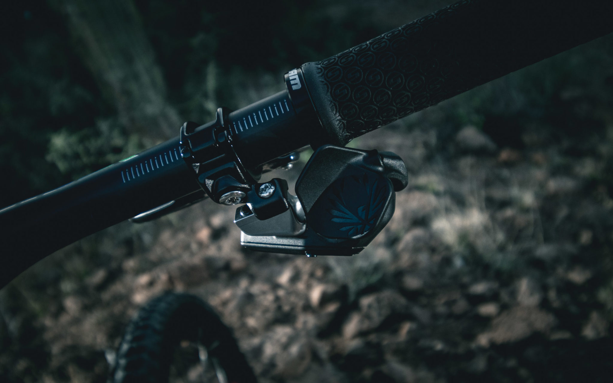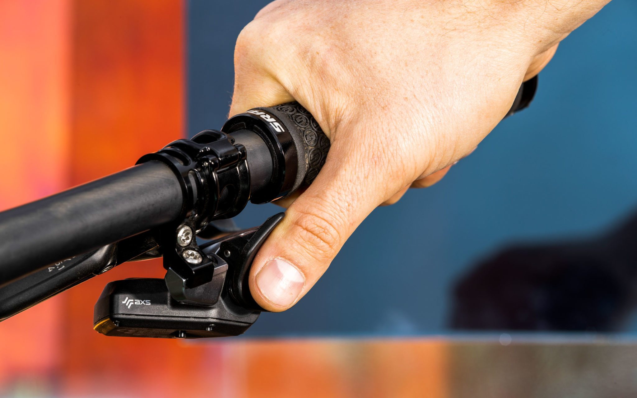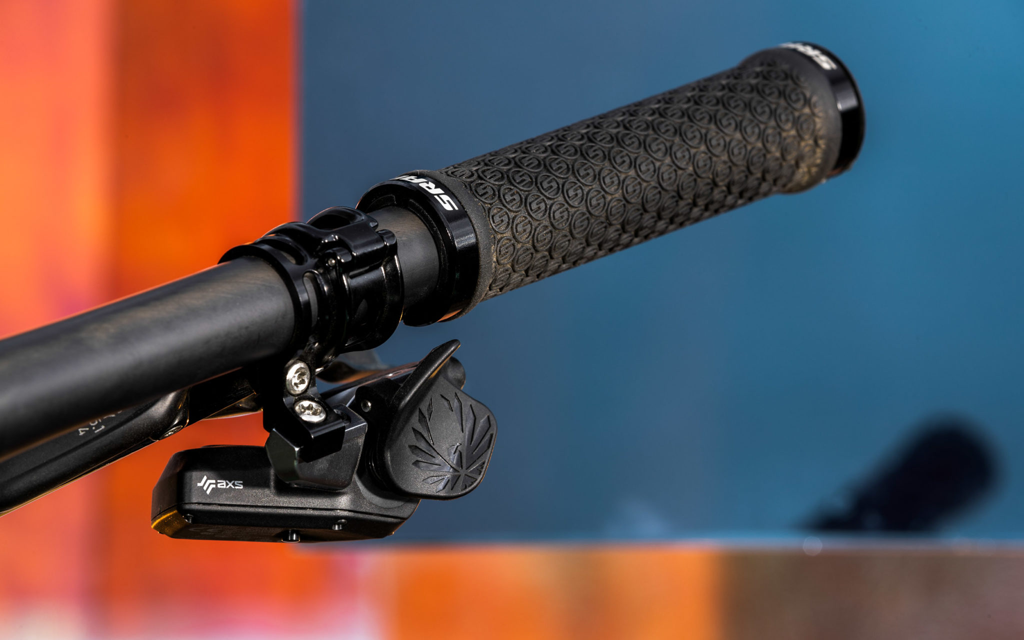 Le premier contact avec la transmission Sram Eagle AXS se fait en posant le pouce sur le shifter. Même si la forme est complètement nouvelle, tout semble très naturel. On doit simplement passer un peu de temps à trouver la bonne position car les repères habituels sont modifiés. Par rapport à une commande par câble, le pouce se positionne plus proche du cintre et l’amplitude de mouvement nécessaire est vraiment très réduite, puisque la course du levier est de quelques petits millimètres à peine. C’est minime mais la prise en main du cintre est légèrement améliorée et il arrive qu’on le remarque dans certaines descentes complexes.