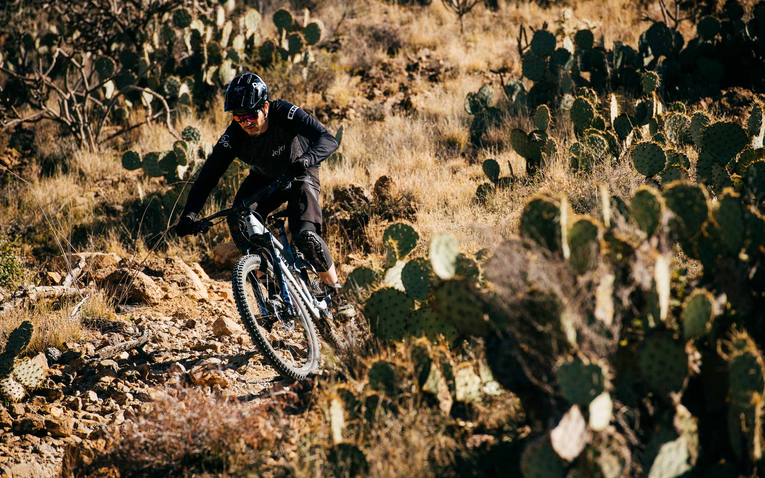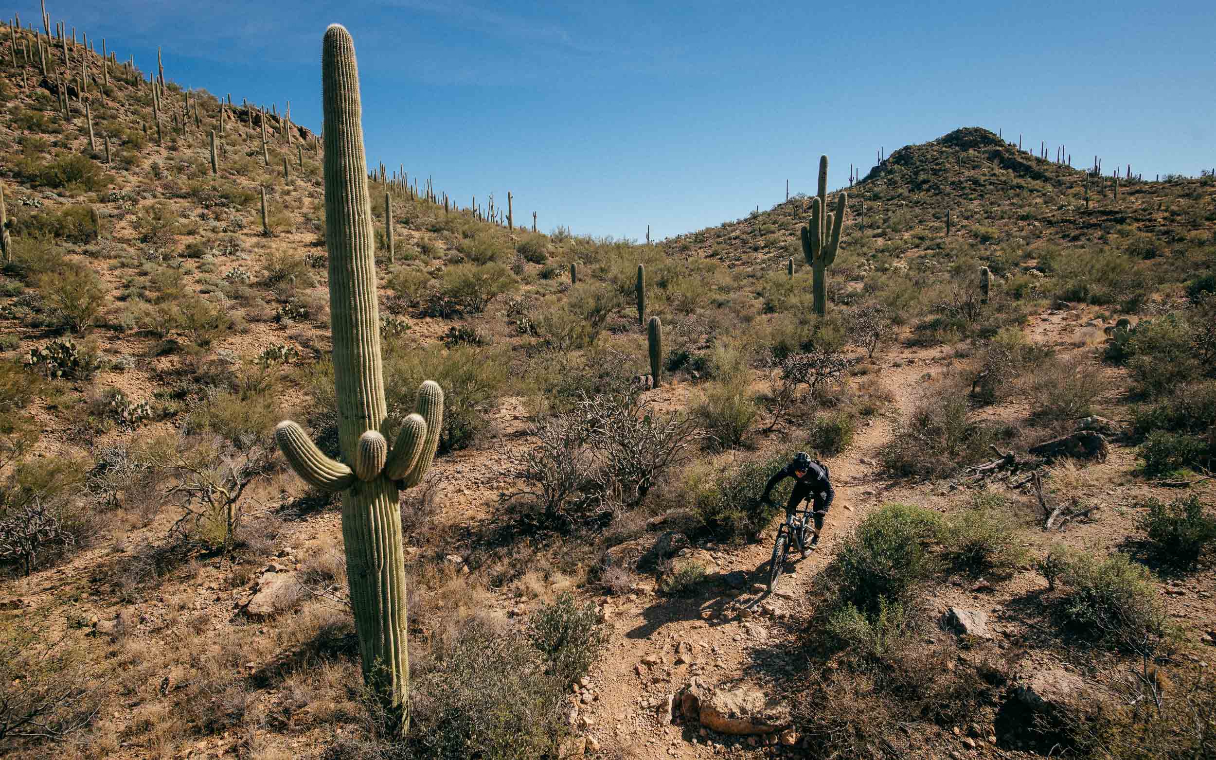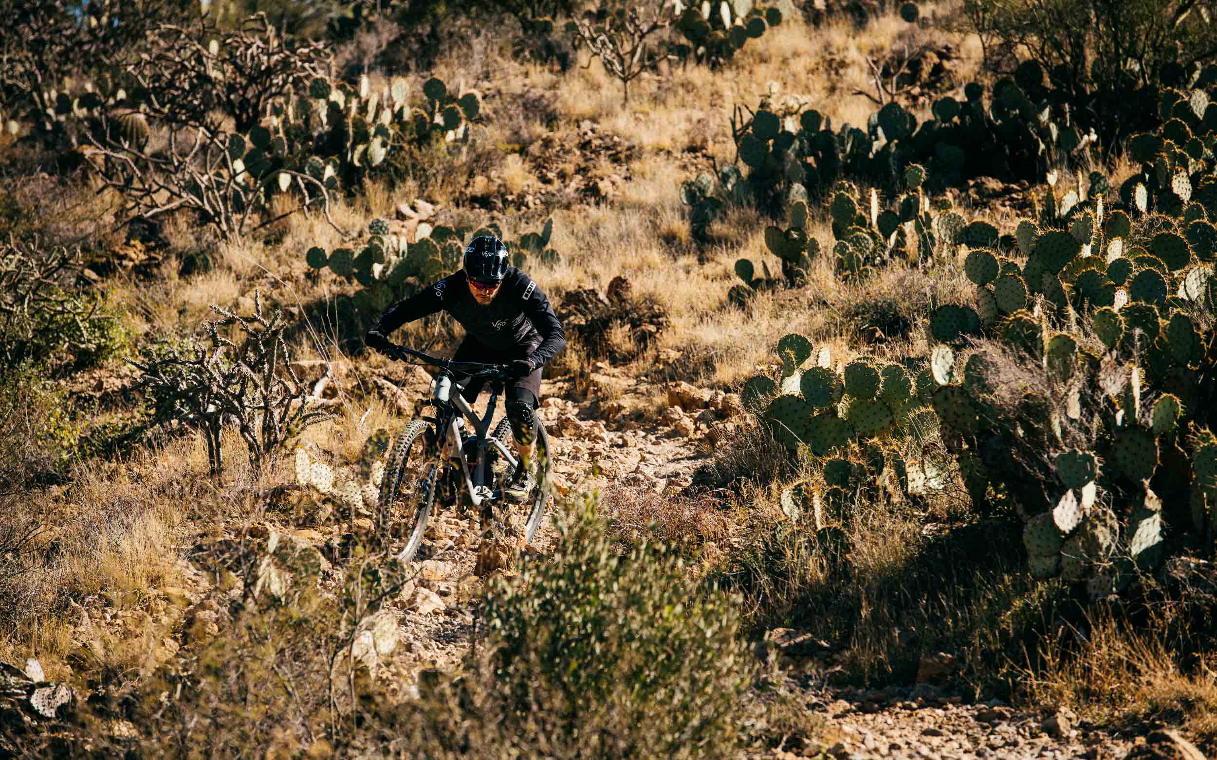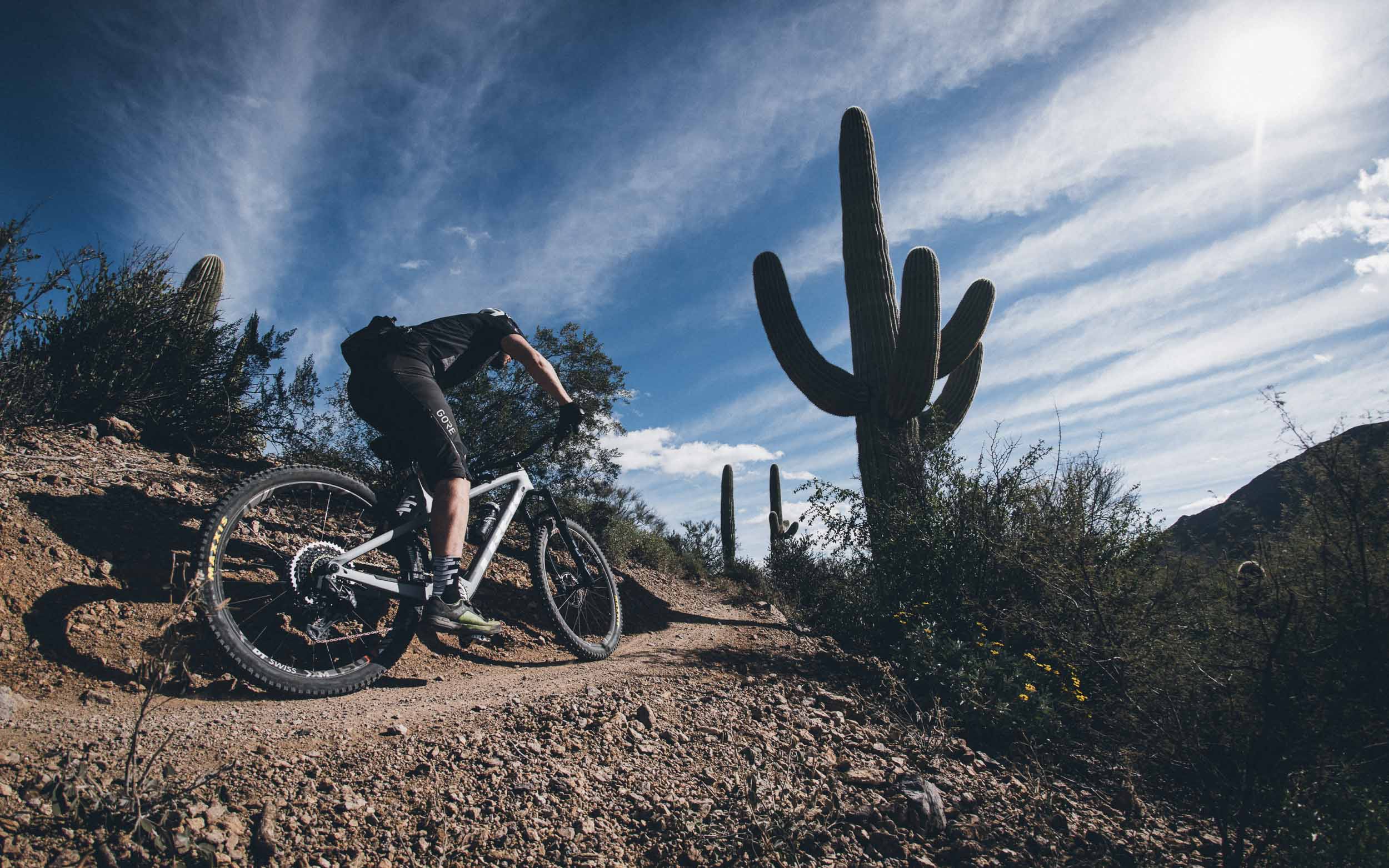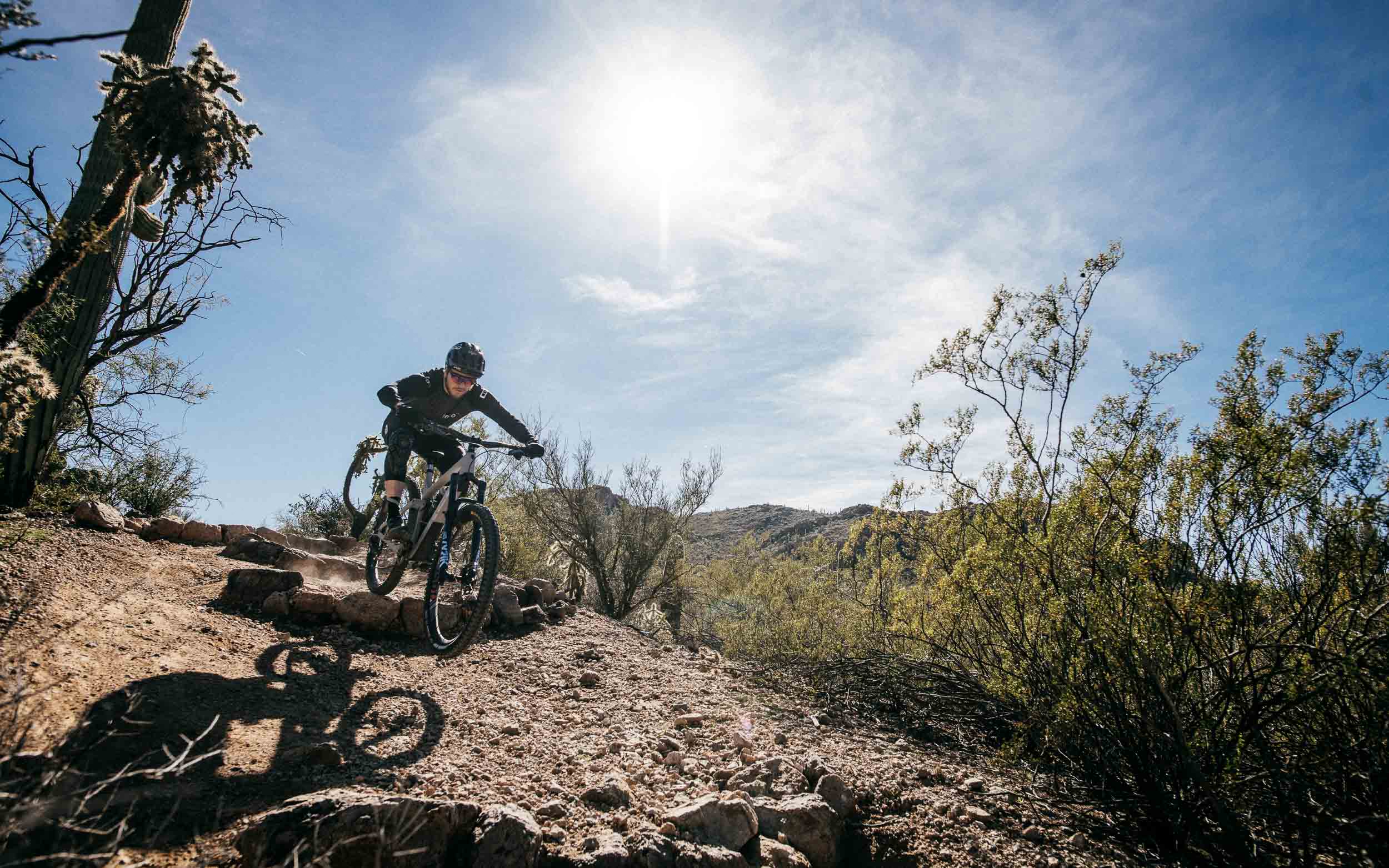 Après quelques kilomètres qui ont surtout servi à faire connaissance, on a attaqué un peu plus fort en profitant des nombreuses descentes parsemées de gros rochers typiques de l’Arizona. Le but est clair : essayer de tester la solidité du dérailleur en taillant ses trajectoires au plus court, quitte à taper la chape ou le corps du nouveau Sram Eagle AXS, en profitant honteusement du fait que ce n’est pas nous qui payerons les pots cassés et que c’est un peu notre métier d’essayer de vérifier la solidité des produits.