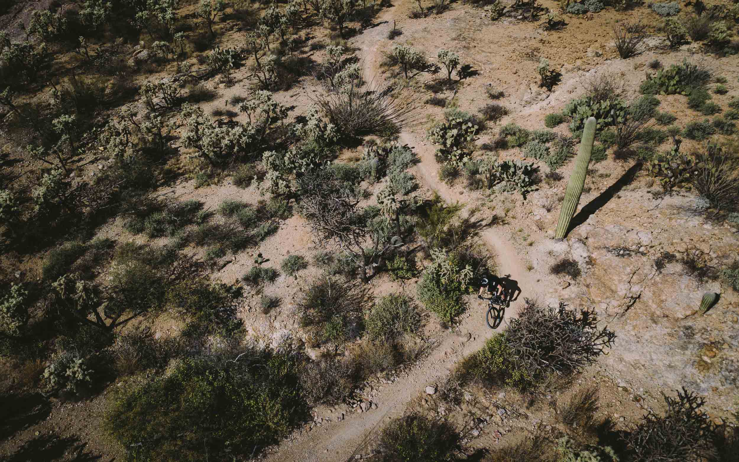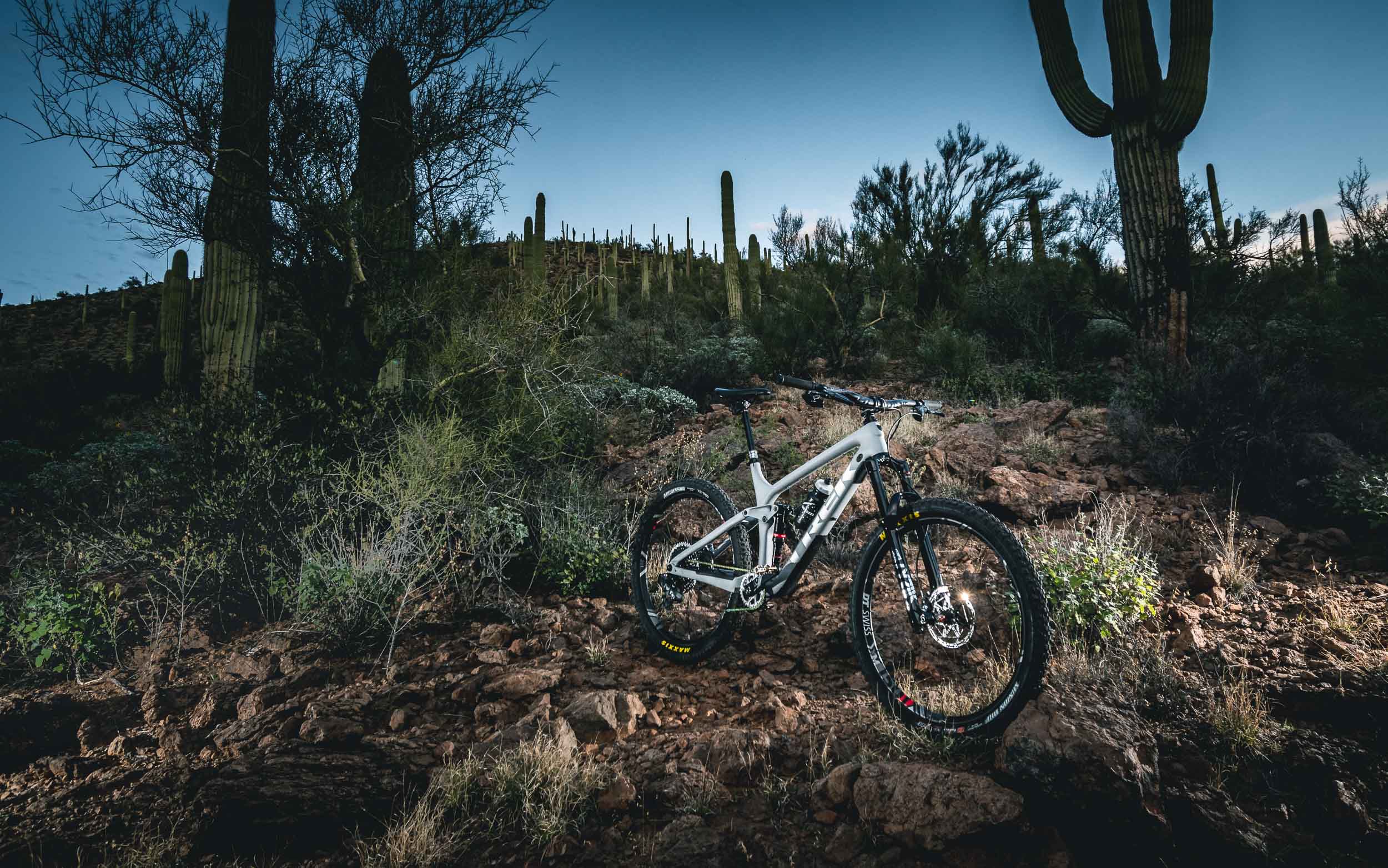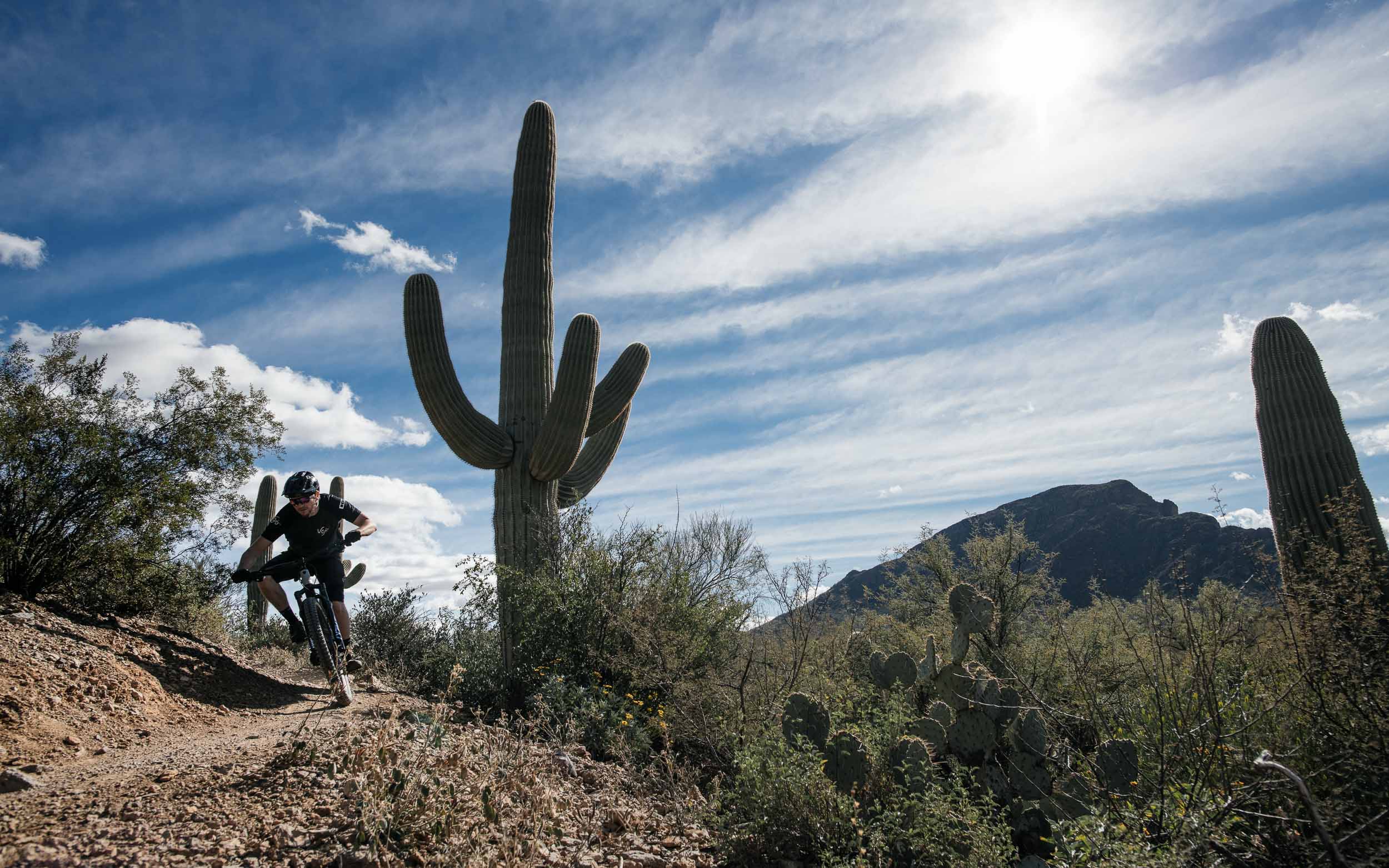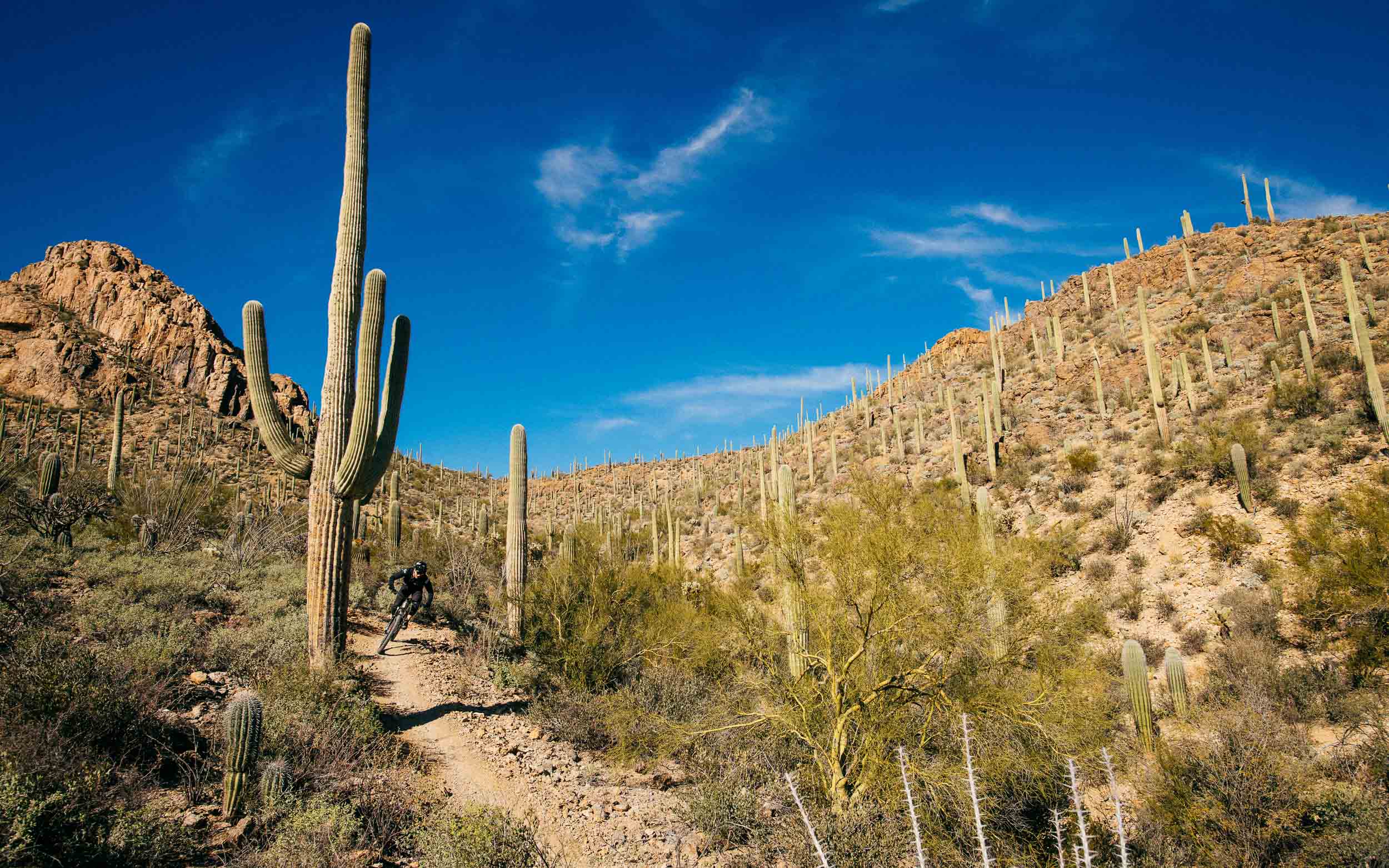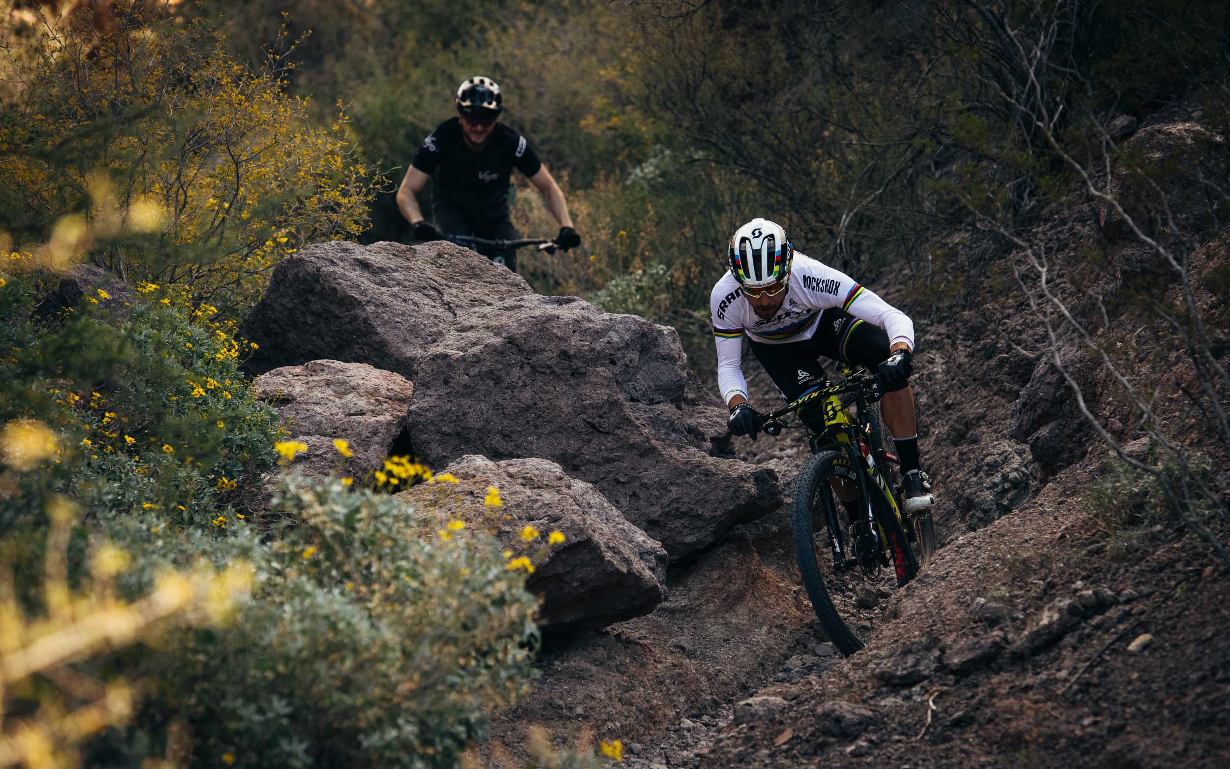 Après quelques kilomètres qui ont surtout servi à faire connaissance, on a attaqué un peu plus fort en profitant des nombreuses descentes parsemées de gros rochers typiques de l’Arizona. Le but est clair : essayer de tester la solidité du dérailleur en taillant ses trajectoires au plus court, quitte à taper la chape ou le corps du nouveau Sram Eagle AXS, en profitant honteusement du fait que ce n’est pas nous qui payerons les pots cassés et que c’est un peu notre métier d’essayer de vérifier la solidité des produits.