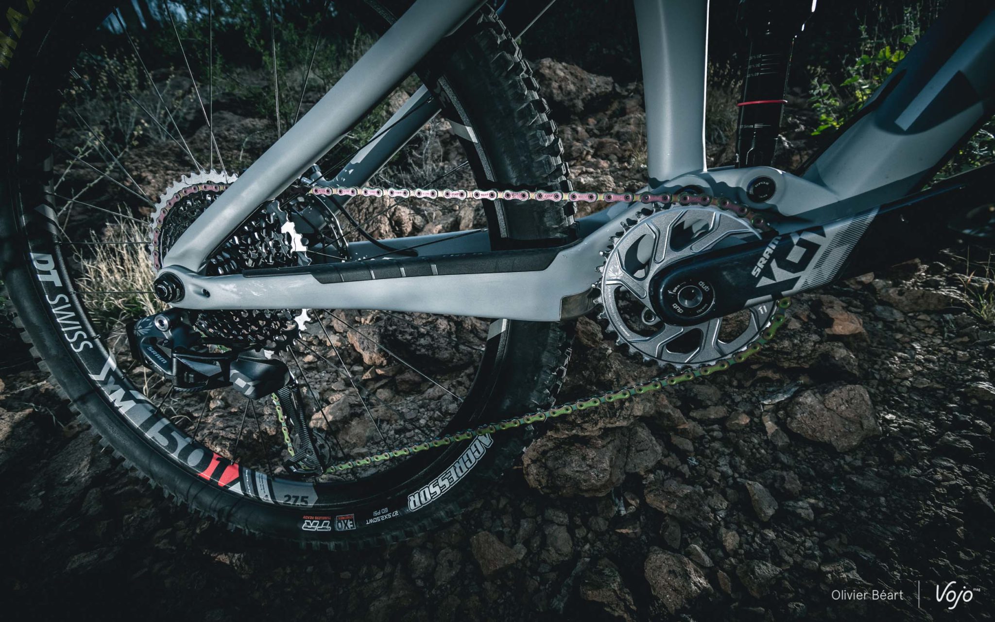 Du côté du dérailleur, la précision est vraiment au rendez-vous. Dans ses exécutions haut de gamme XO1 et XX1 (c’est un peu moins vrai avec le GX), les transmissions Sram Eagle 1×12 vitesses à câble sont déjà très agréables et rapides à utiliser, mais force est de constater qu’ici, on a encore franchi un palier. Pas révolutionnaire, certes, mais quand on pouvait encore constater un petit dérèglement de temps en temps ou entendre un mini grattement de la chaîne (y compris sur une transmission récente et réglée aux petits oignons), ici, nous avons constaté que le phénomène semble complètement absent.