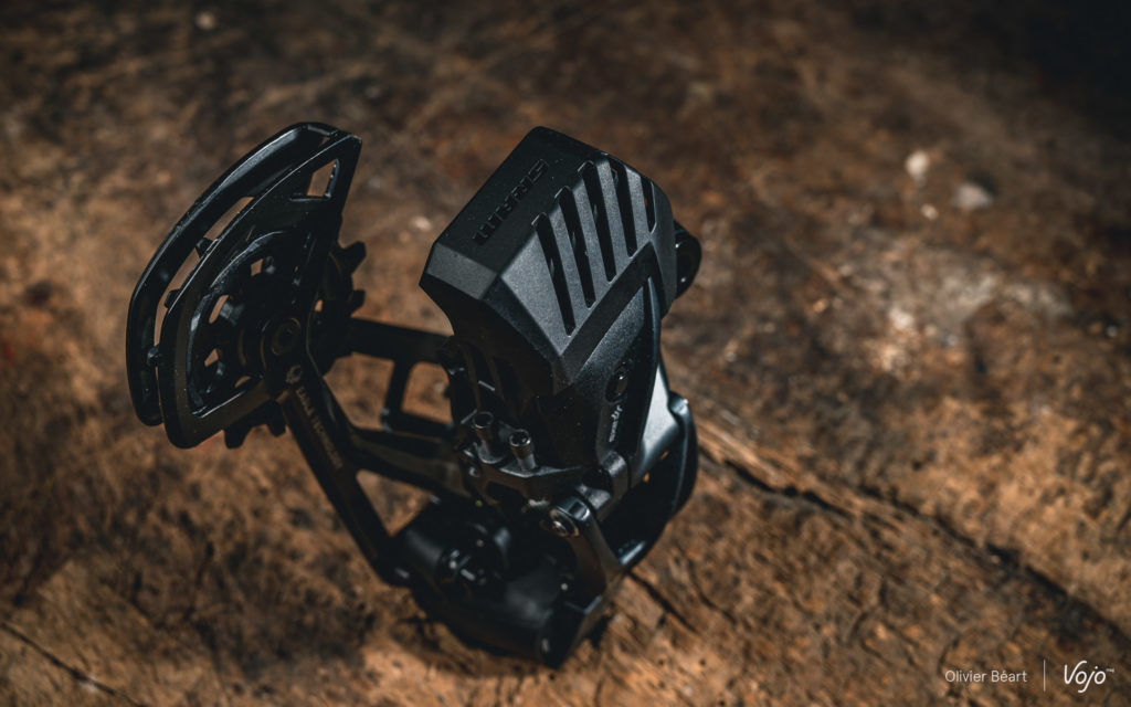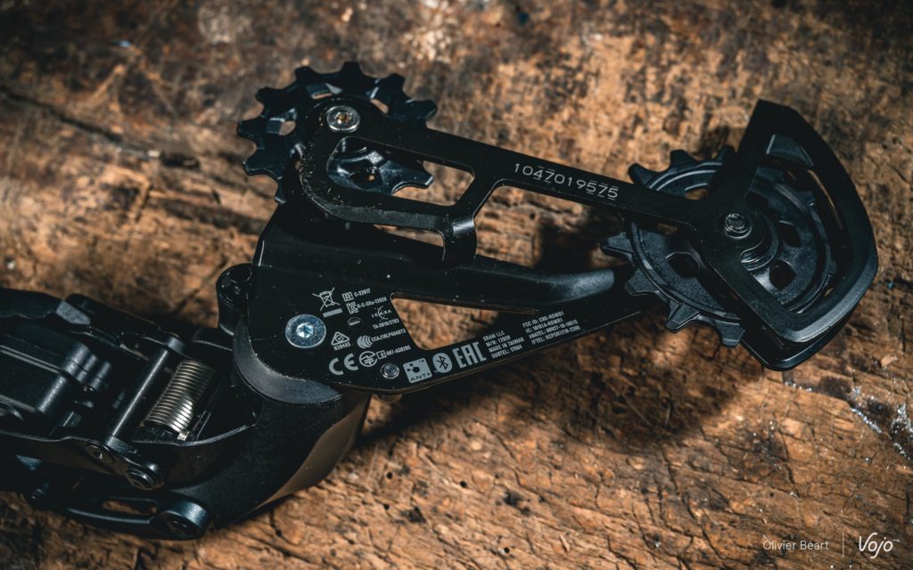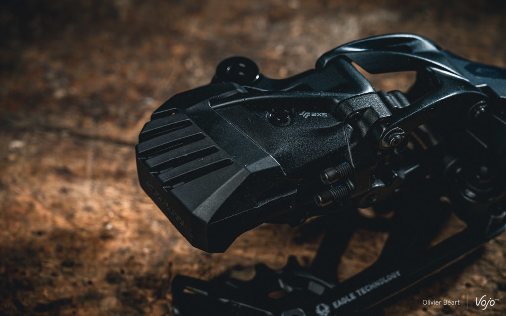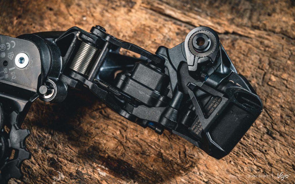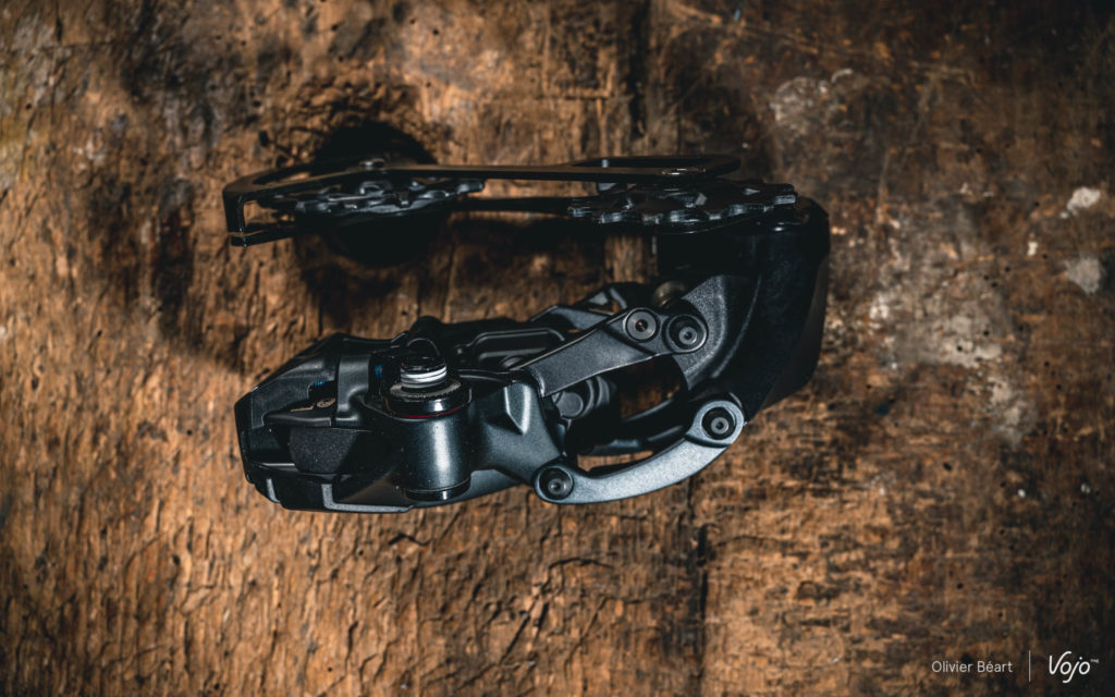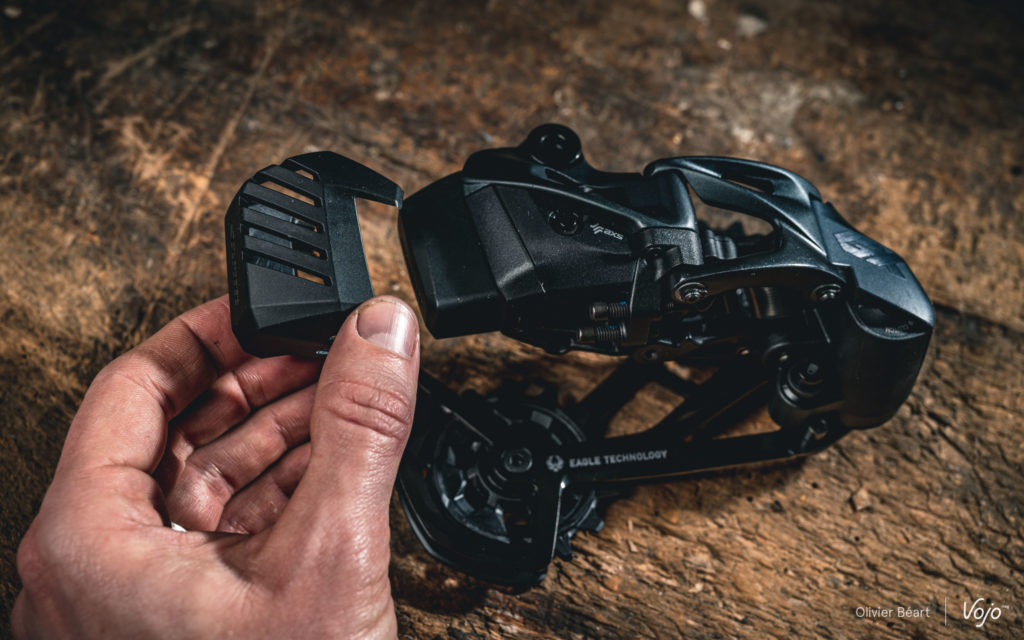 A l’arrière, on remarque aussi l’apparition d’un petit capot en plastique qui vient sécuriser et protéger le montage de la batterie. Pas indispensable mais compatible avec les autres dérailleurs AXS, cette petite cage ajoute une petite couche de protection, mais aussi et surtout une touche esthétique à cet endroit. A noter que, côté solidité, le système de débrayage du moteur en cas de choc, qui réduit drastiquement les risques de détériorer le dérailleur en cas de contact avec un élément extérieur, reste bien présent, comme sur les versions haut de gamme.