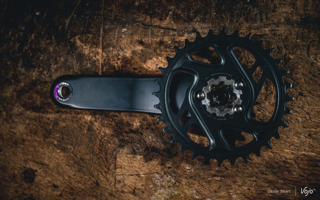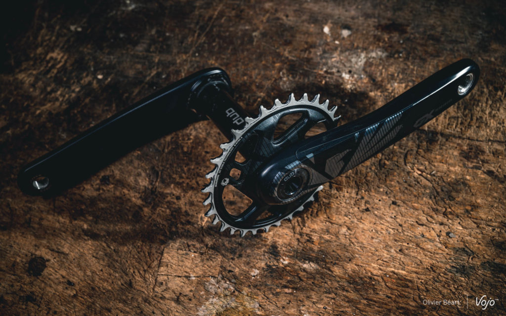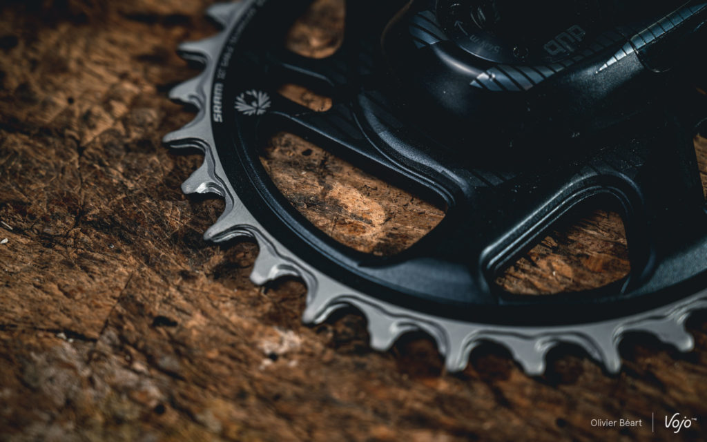 Autre point de comparaison : le plateau avant. Jusqu’ici, sur une transmission mono-plateau, n’ayant la plupart du temps qu’une seule option de cassette (hors kits proposés par des marques comme One-Up), on devait jouer sur la taille du plateau pour faire varier ses développements. C’est une solution simple, qui reste tout à fait possible, mais qui a au moins deux inconvénients :