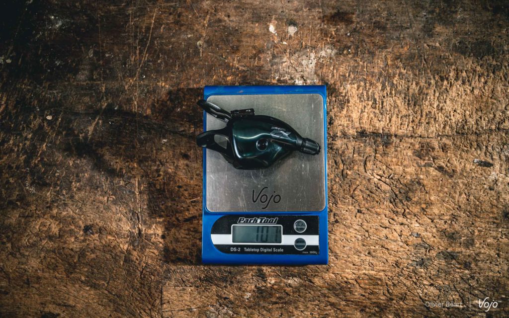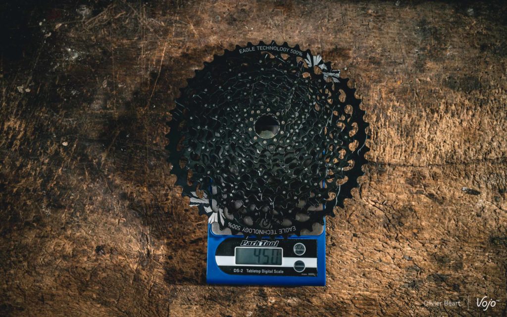 Au niveau du poids, on le voit ci-dessus, la différence entre cette nouvelle génération de Sram GX et la précédente est très faible. La cassette 10-52 n’est que 2g plus lourde que la 10-50 et le nouveau dérailleur ne fait que 5g de plus. Les autres composants ne changent pas et le pédalier carbone permet, lui, de gagner près de 70g par rapport au modèle alu.