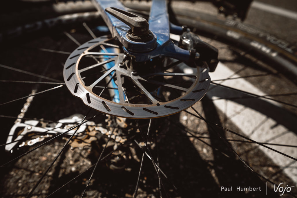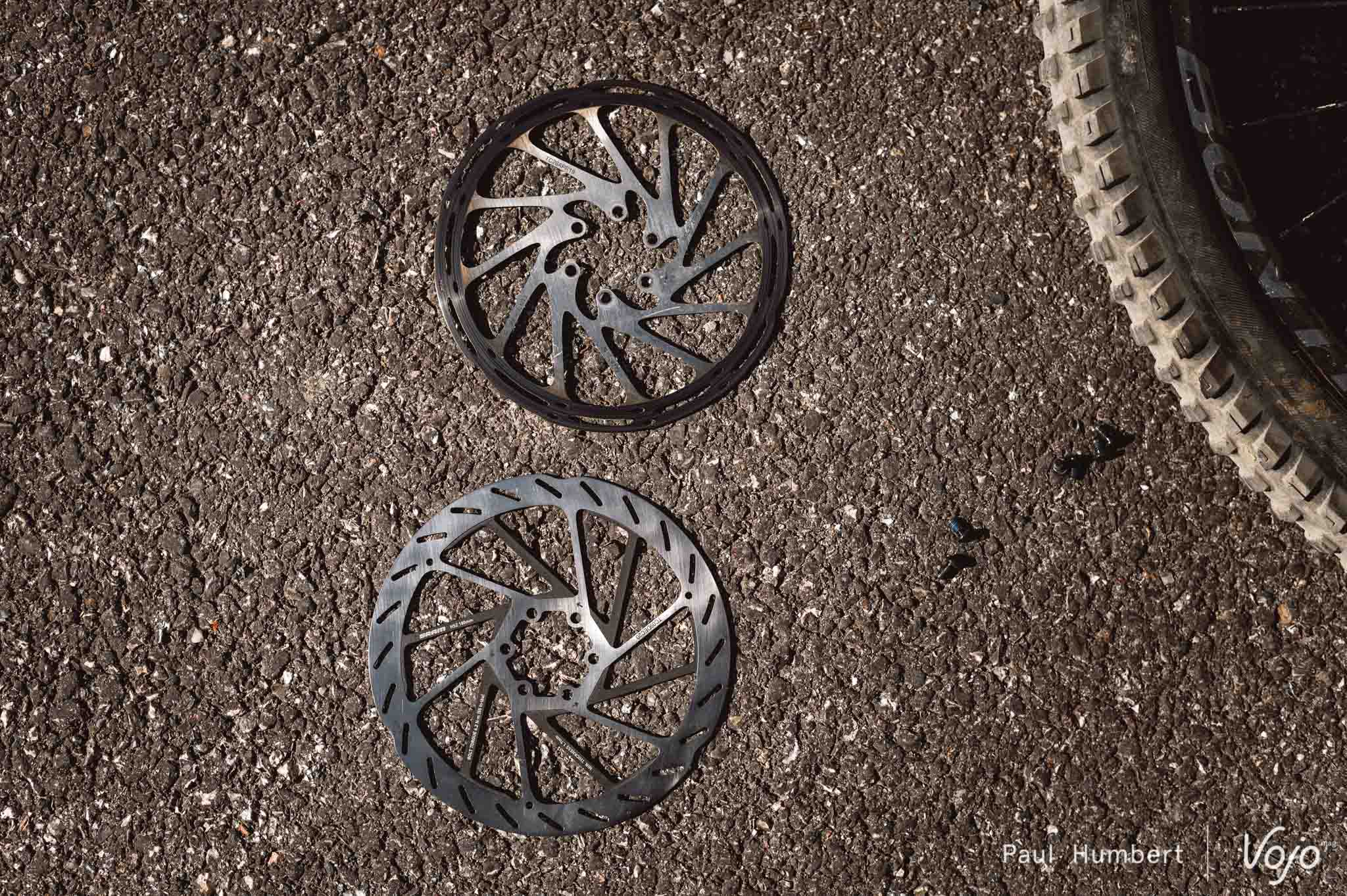 Les plus observateurs d’entre vous auront remarqué sur certaines de nos photos que la piste de freinage n’est pas usée sur toute sa surface. Une petite partie (1 à 1,5 mm) juste au-dessus des branches du disque n’entre pas en contact avec les plaquettes et reste donc intacte. Contacté, Sram nous a confirmé que c’est parfaitement normal, cela fait partie de la conception pour améliorer la dissipation de la chaleur et il ne faut pas chercher à faire en sorte que les plaquettes mordent sur toute la surface de la piste de freinage.