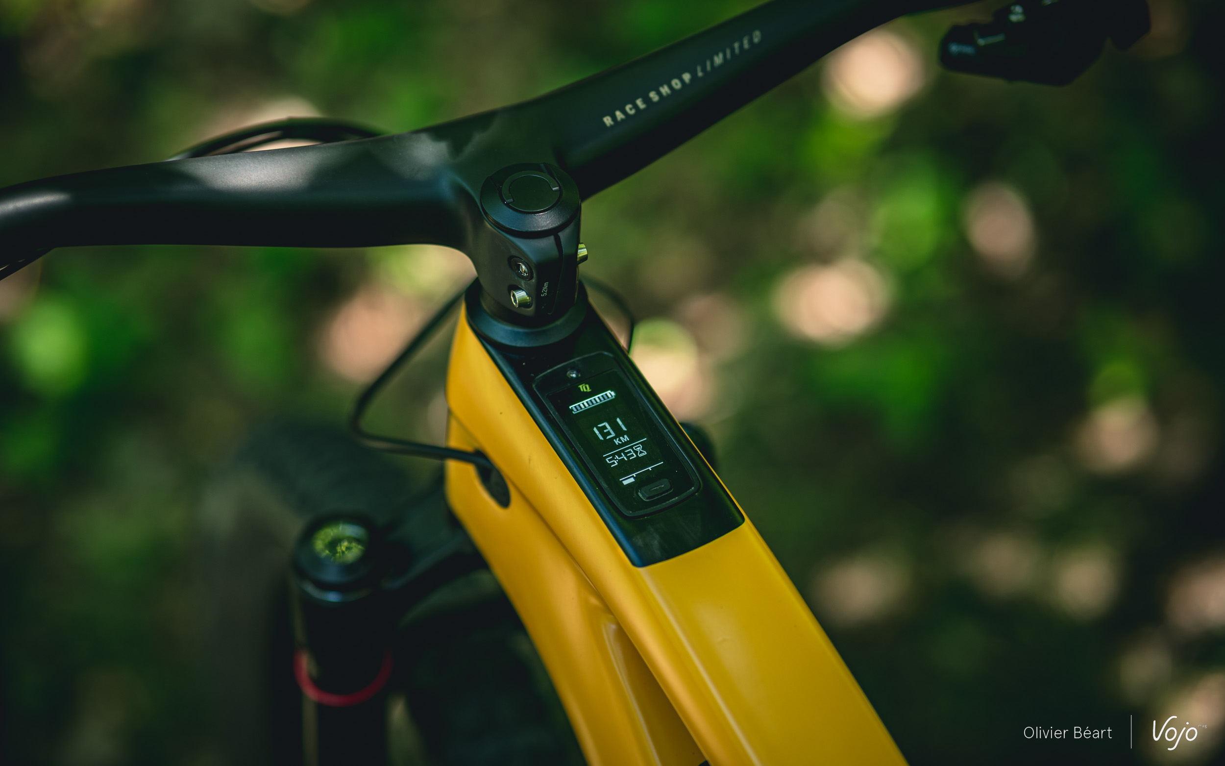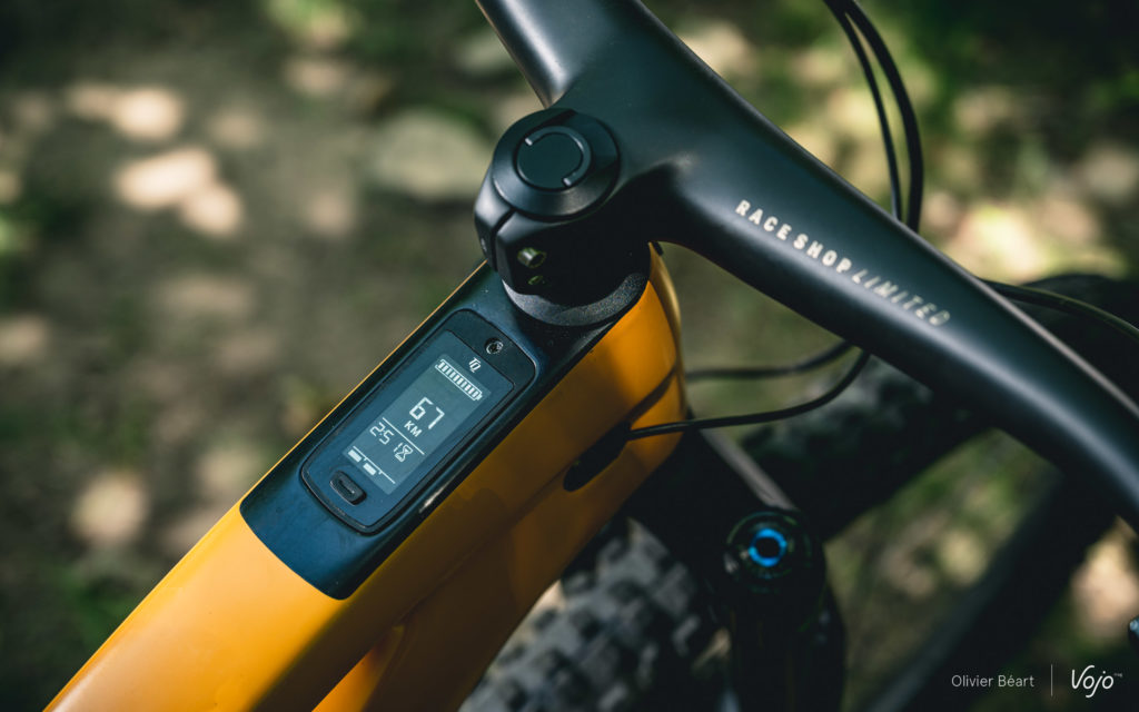 L’écran OLED de 2 pouces est intégré au tube supérieur. Parfaitement lisible du dessus, il est presque invisible de côté. Un seul bouton permet d’allumer ou d’éteindre le système et de naviguer entre les modes d’affichage. Il est associé à une commande compacte et discrète à deux boutons sur le guidon pour activer les modes d’assistance (ou l’assistance à la marche).