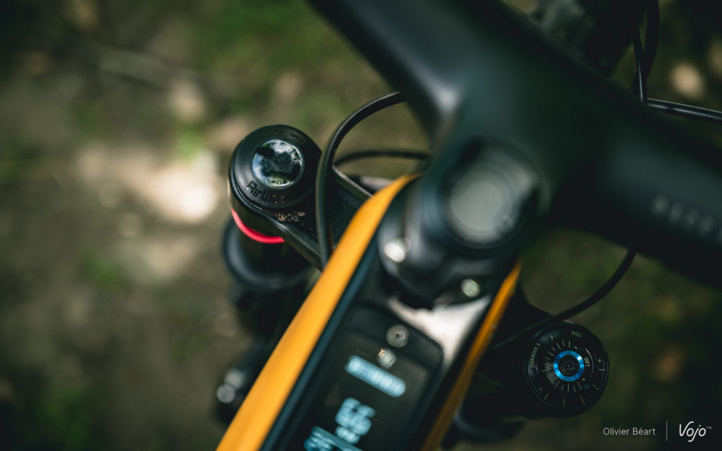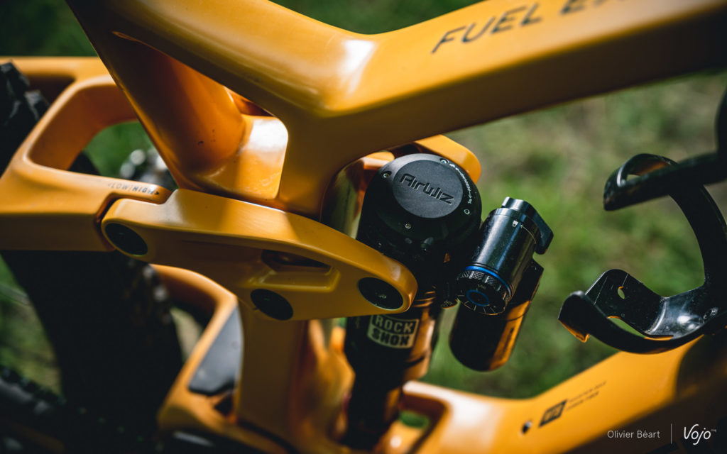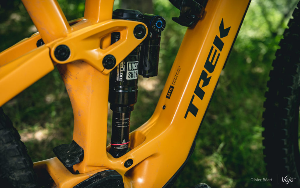 La suspension arrière ressemble à ce qu’on a pu voir sur les derniers Top Fuel et Slash. Agréable et progressive, elle donne l’impression d’avoir plus de débattement que 140 mm. Elle reste haute en début de course, offre un soutien important à mi-course et plutôt que de s’écraser en fin de course, elle pousse vers l’avant et nous fait gagner de la vitesse.