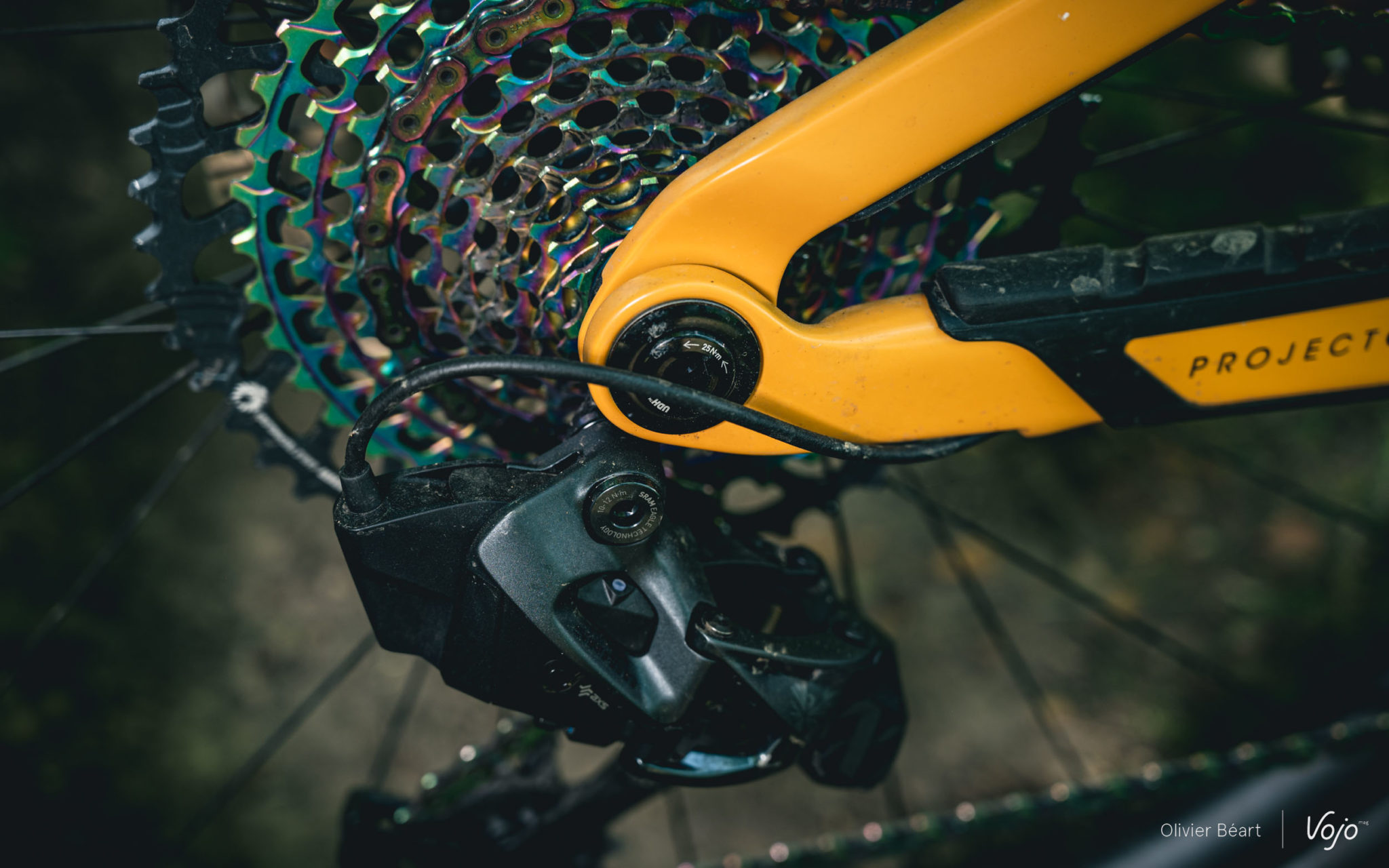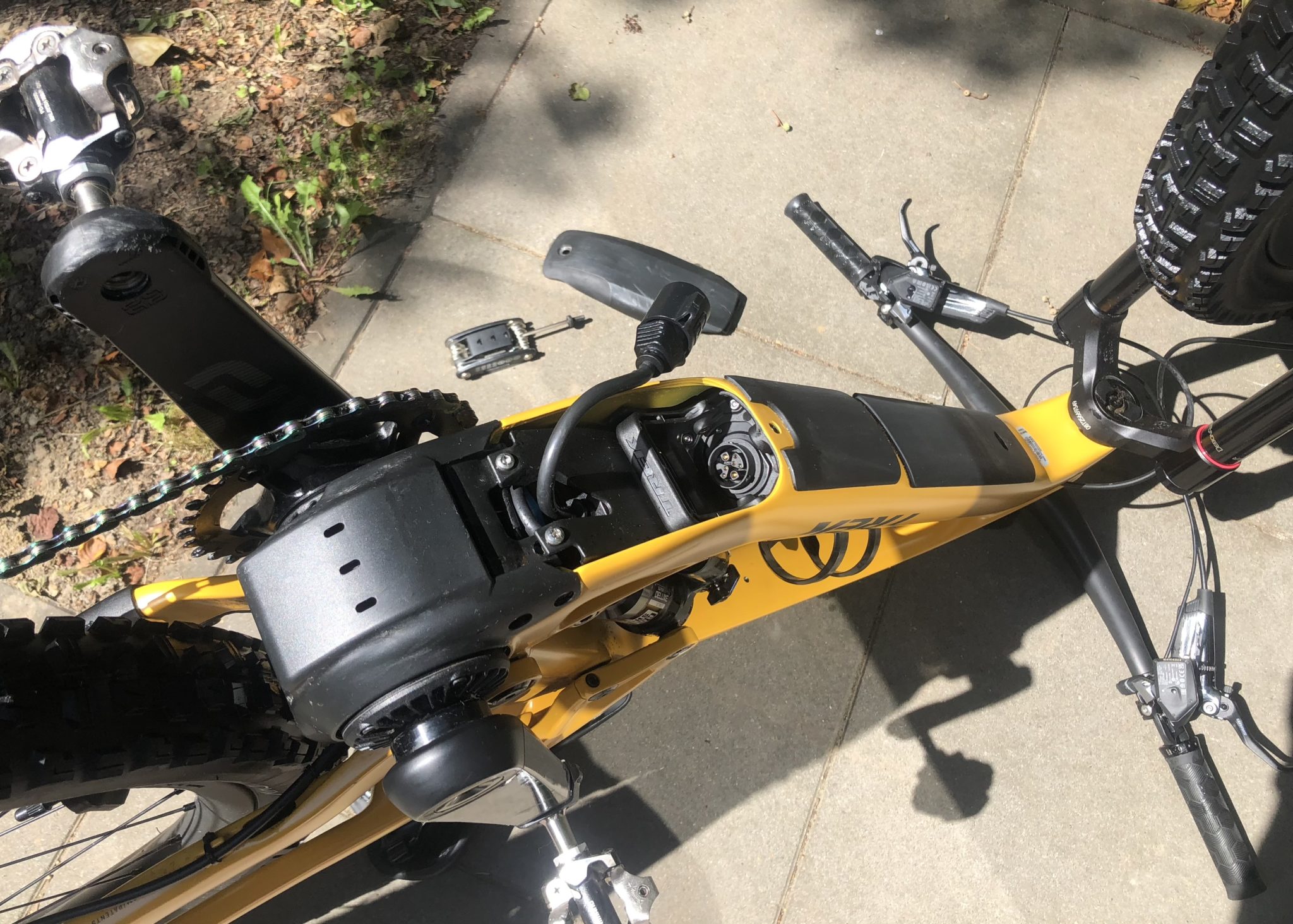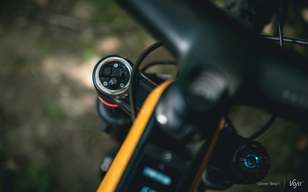 Les versions équipées en Sram AXS ont également un câble électrique qui suit le trajet d’un câble de dérailleur, alimentant la batterie AXS directement depuis la batterie principale. Il n’est donc pas nécessaire de charger la batterie du dérailleur séparément. Si la batterie principale est vide et qu’il n’y a plus d’assistance au pédalage, il reste encore une réserve d’énergie logicielle pour commuter jusqu’à 200 fois. Cela évite la double peine d’avoir à rentrer chez soi avec une machine sans assistance ni dérailleur opérationnel, dans le cas où on aurait un peu surestimé les capacités du système.