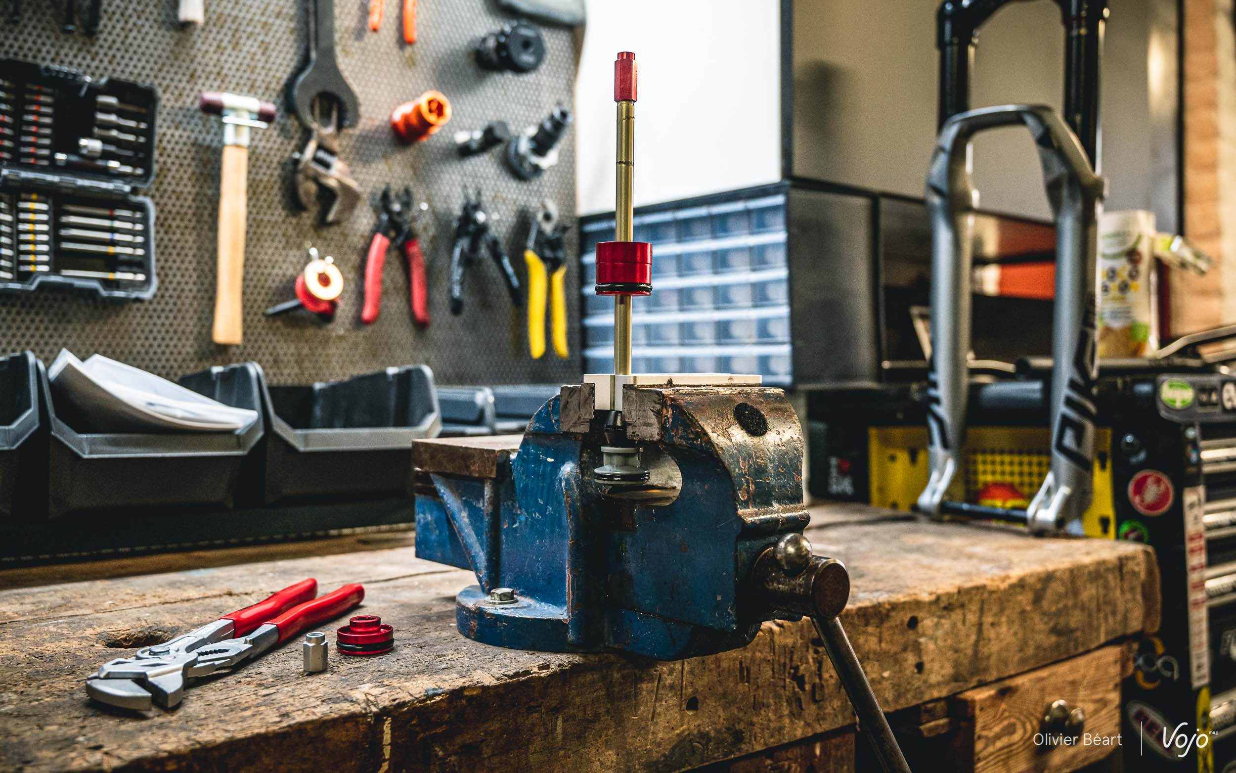 Tout se joue dans la partie gauche de la fourche, celle qui abrite le ressort pneumatique de la fourche (le fourreau droit étant dédié à l’hydraulique). Deux pièces ont été modifiées sur le piston, et ce sont celles que vous pouvez voir en rouge sur l’image ci-dessus.